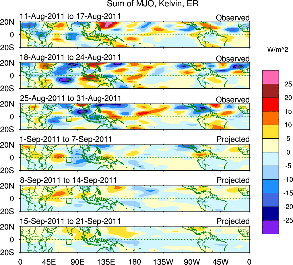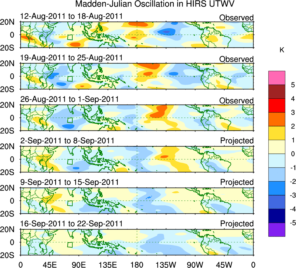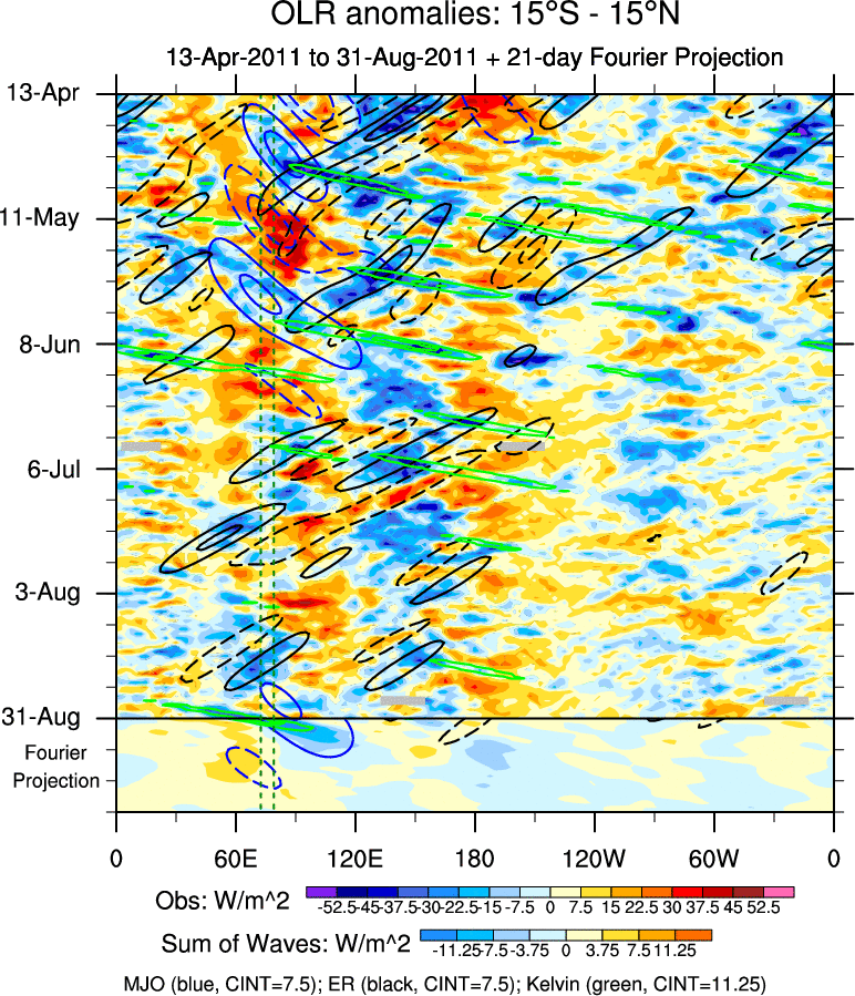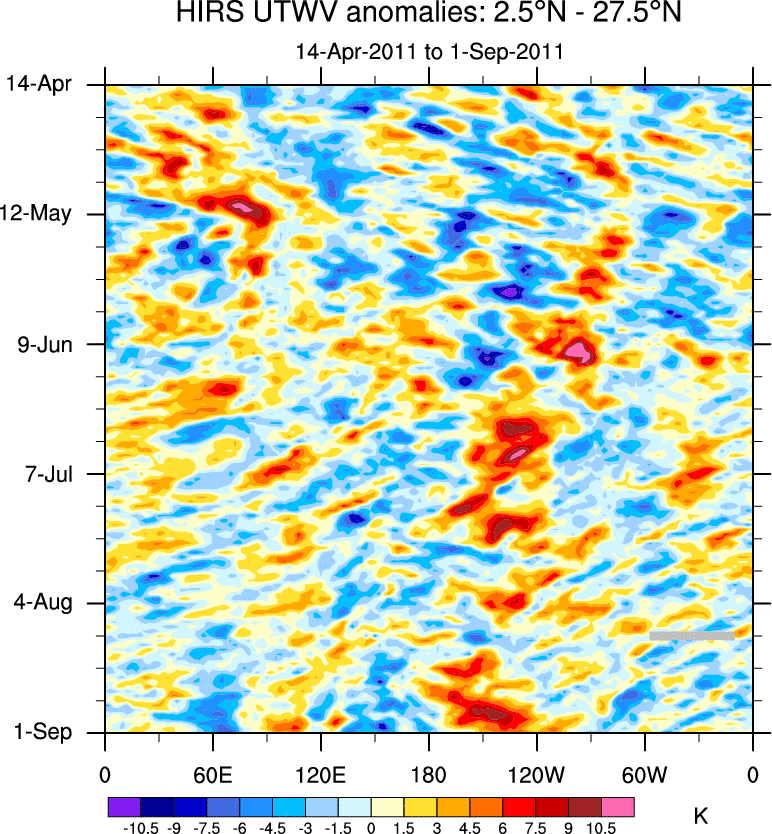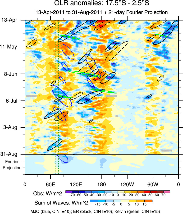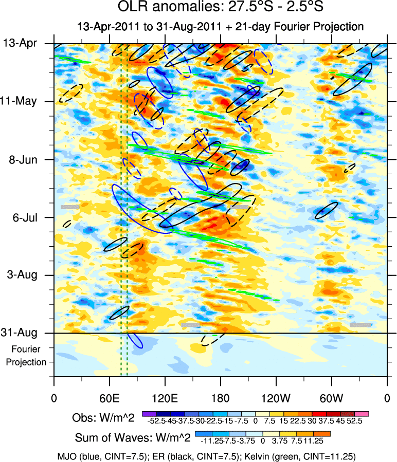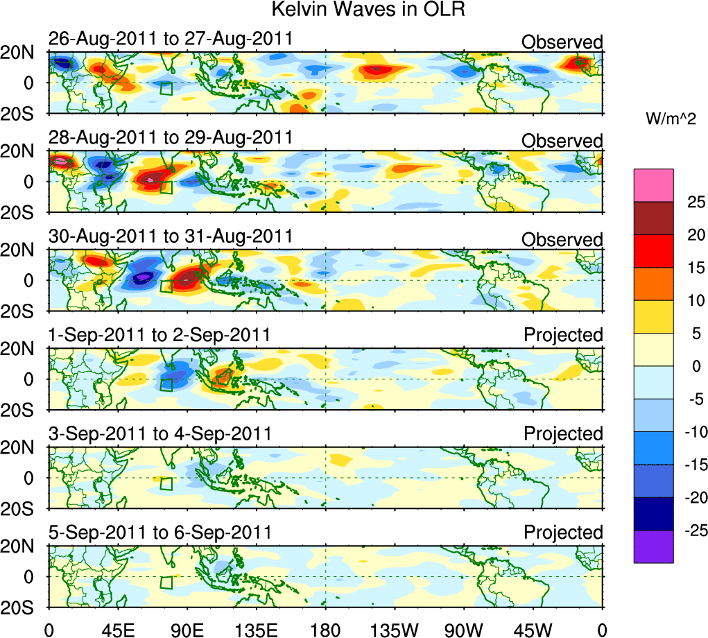 To identify tropical waves in near real-time, the OLR and UTWV data are filtered following Wheeler & Weickmann (2001 MWR). The daily anomalies are calculated using the first 3 harmonics of the seasonal cycle for 1979–2009. Missing values are then filled using linear interpolation in space and time. The most recent 365 days of anomalies are padded with 659 days of zeroes, and the result is filtered for each wave type.