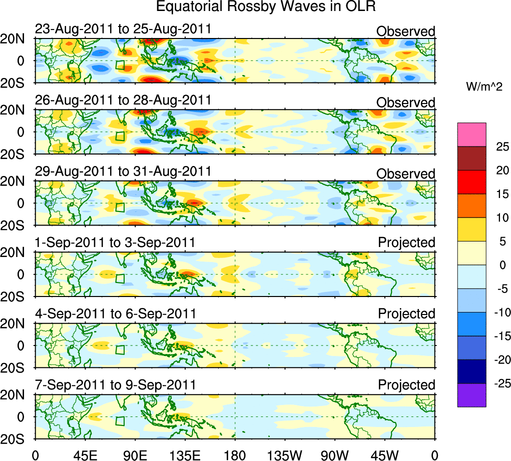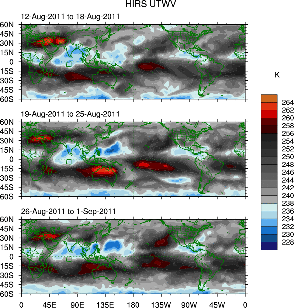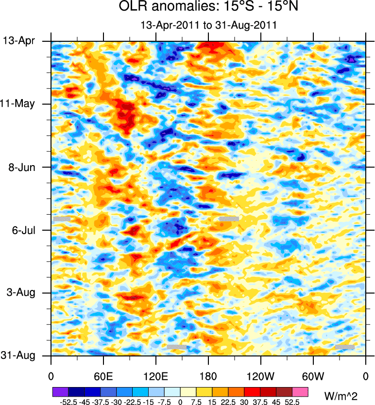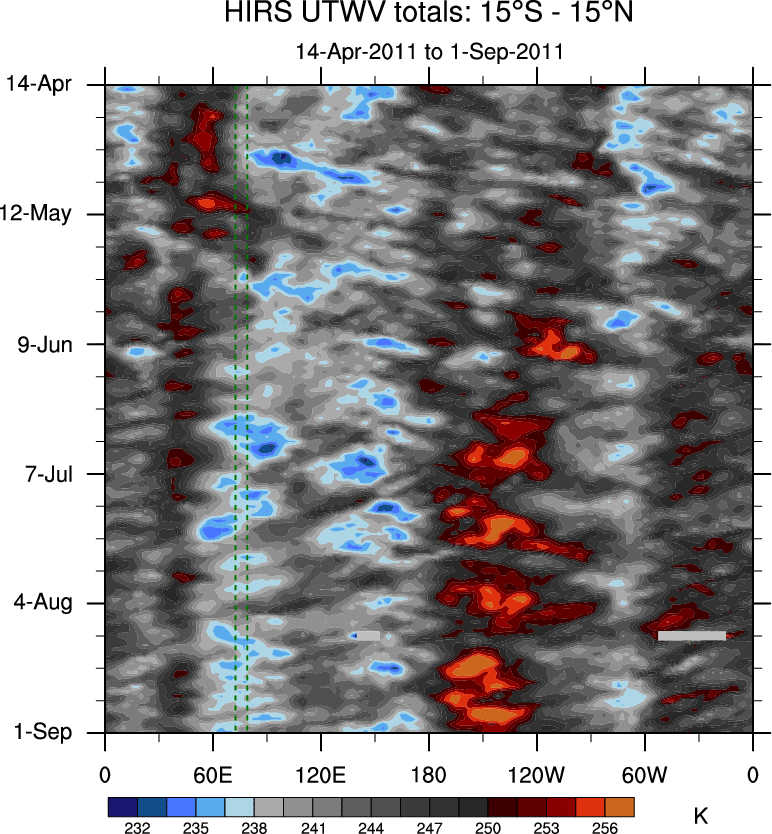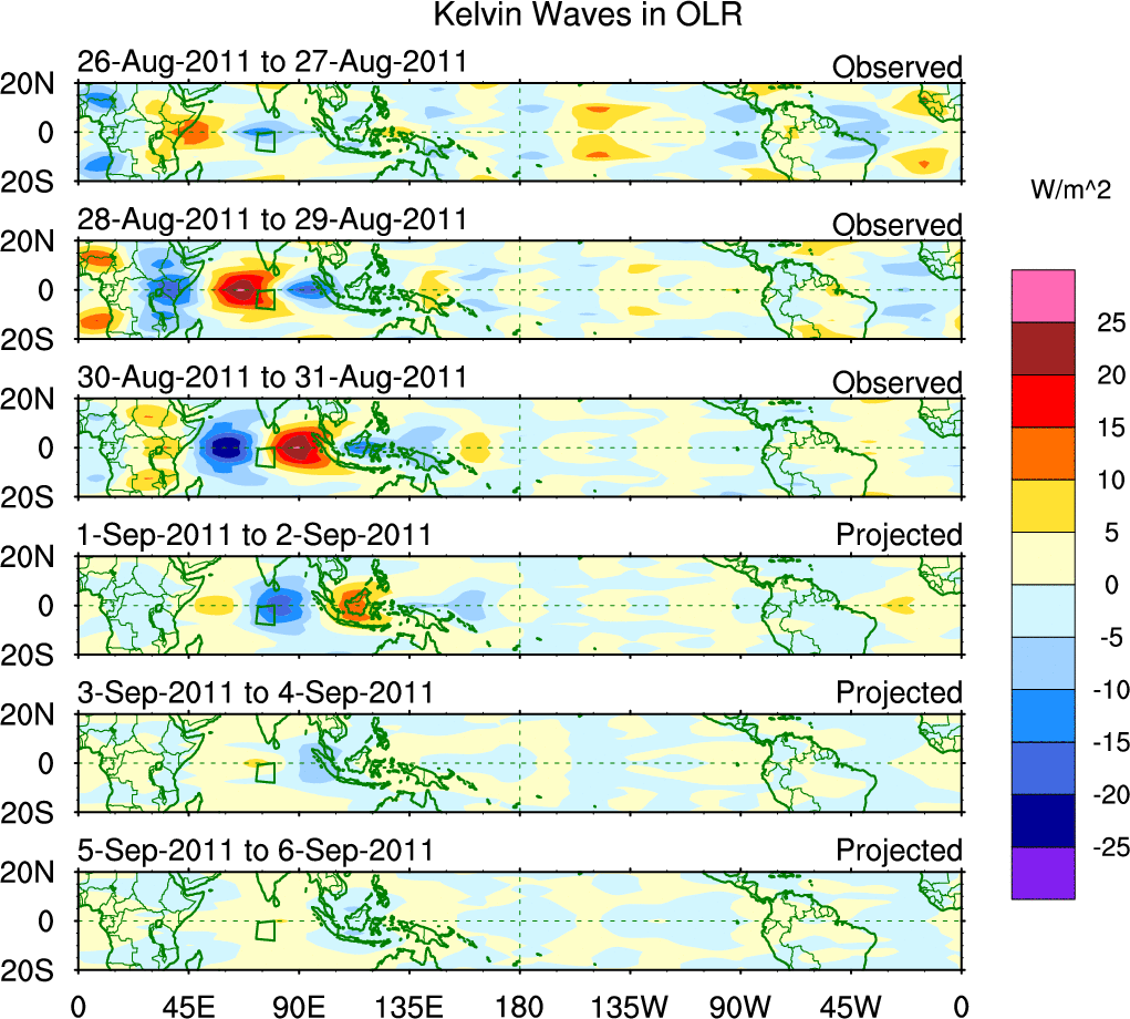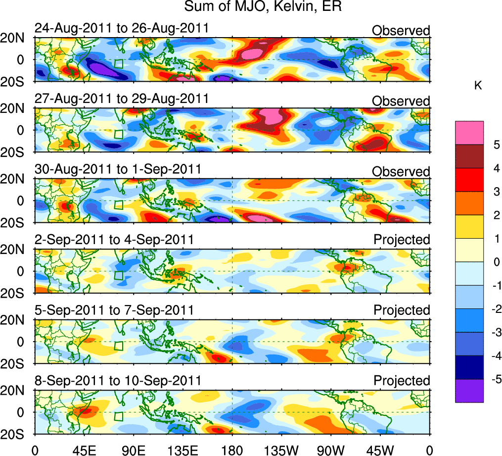 To identify tropical waves in near real-time, the OLR and UTWV data are filtered following Wheeler & Weickmann (2001 MWR). The daily anomalies are calculated using the first 3 harmonics of the seasonal cycle for 1979–2009. Missing values are then filled using linear interpolation in space and time. The most recent 365 days of anomalies are padded with 659 days of zeroes, and the result is filtered for each wave type.