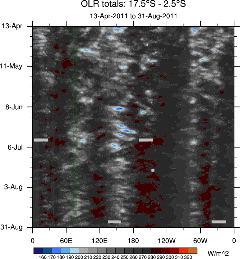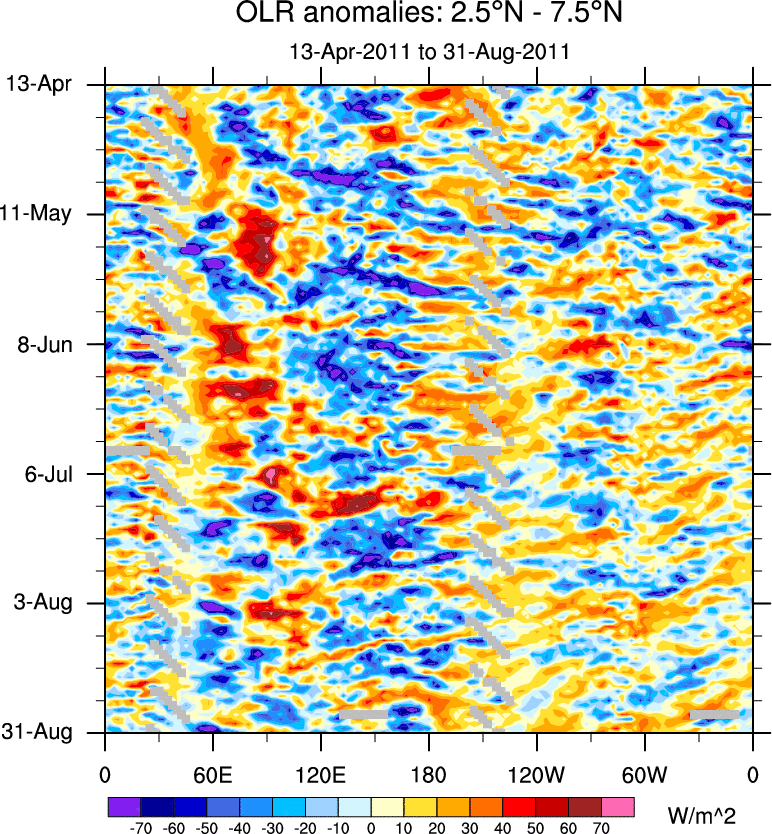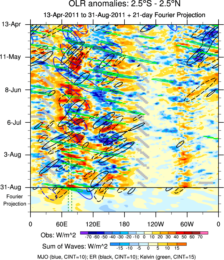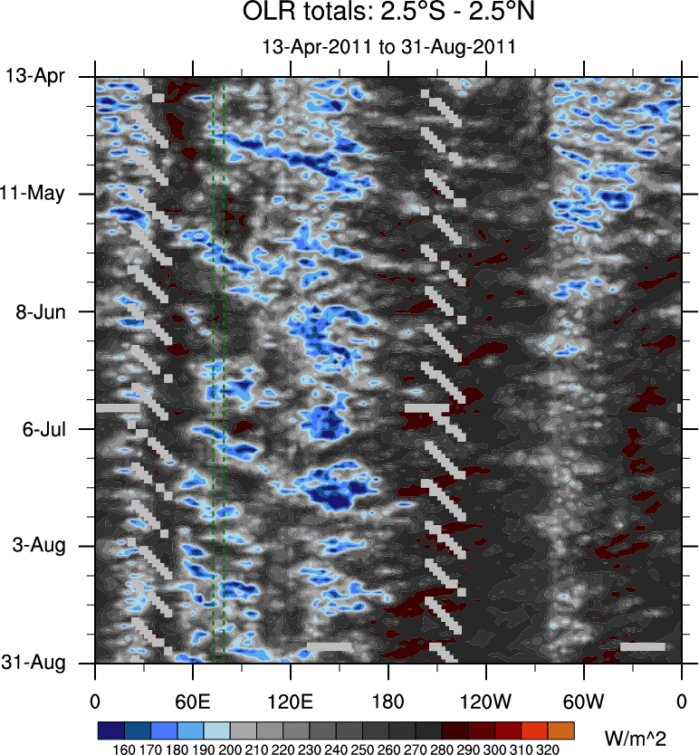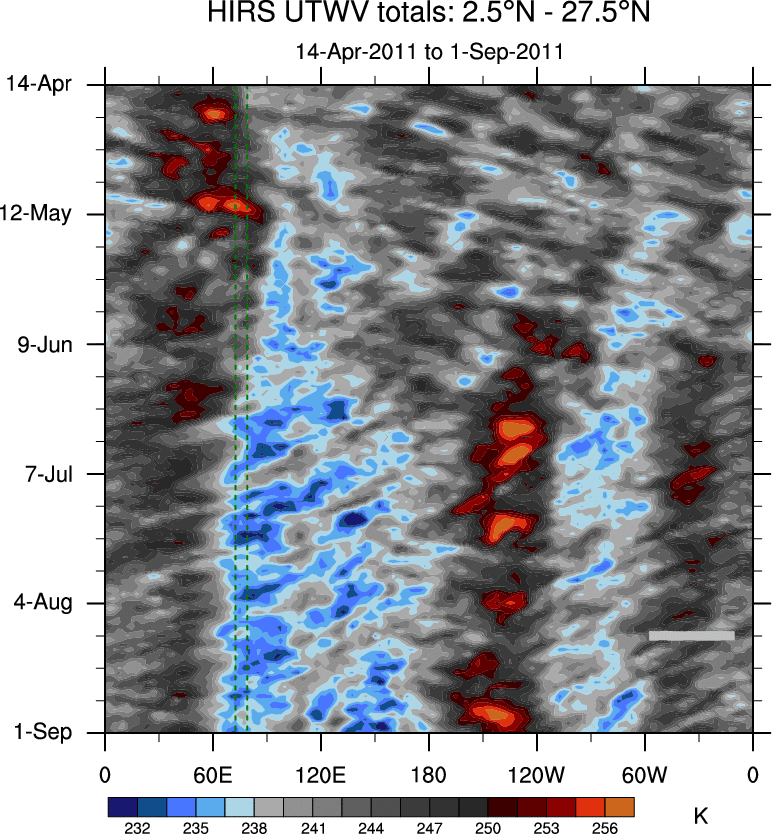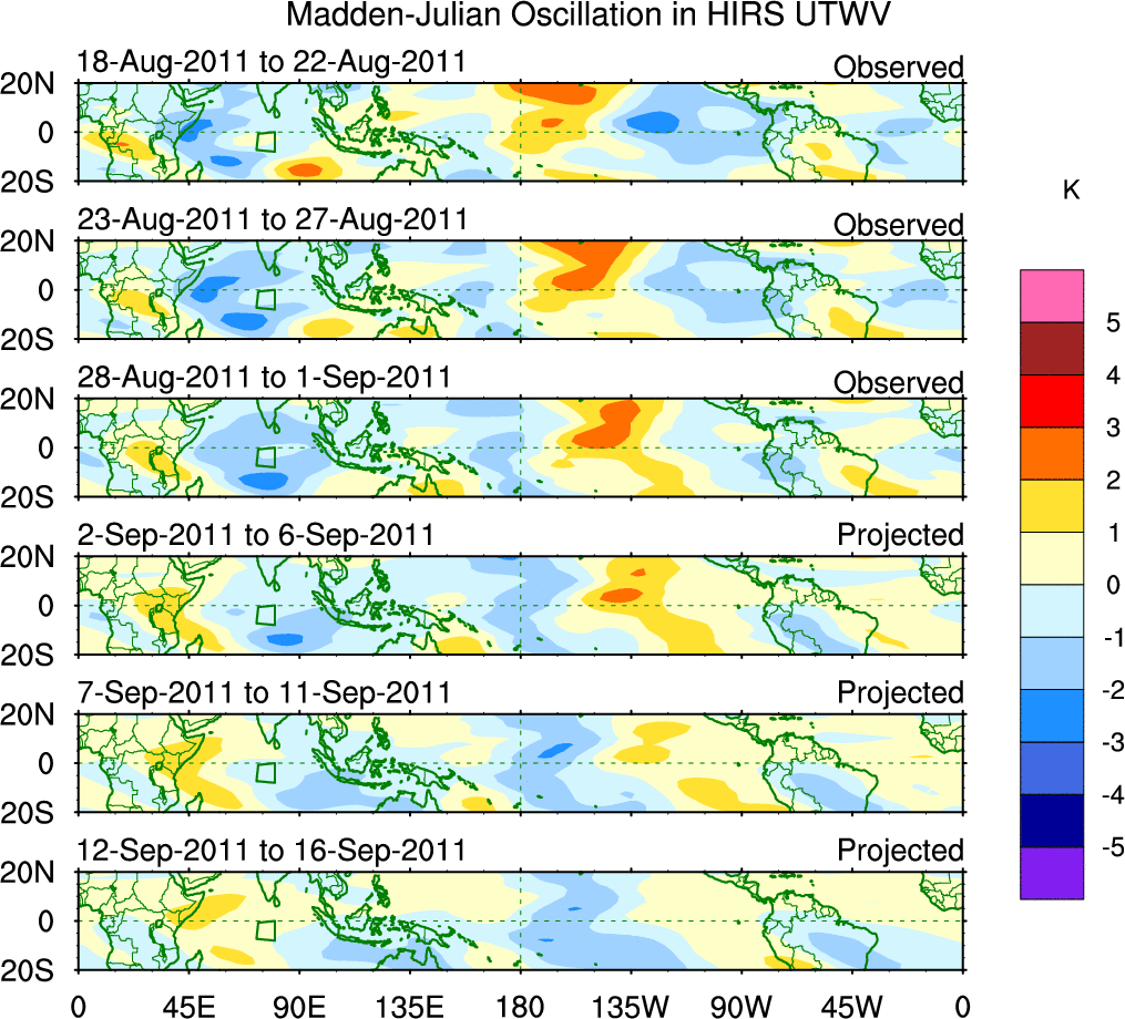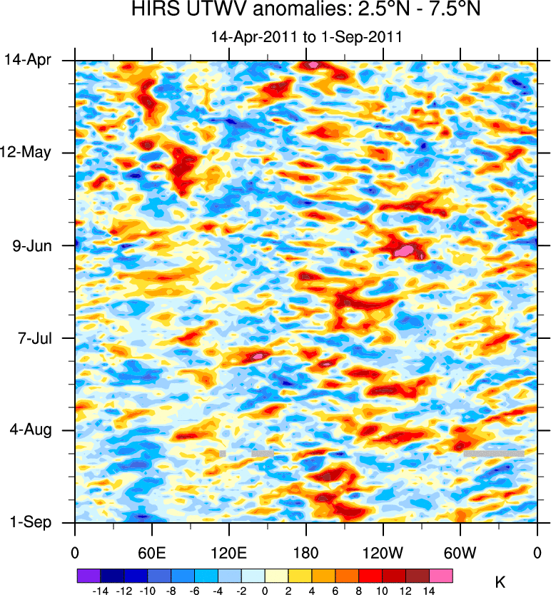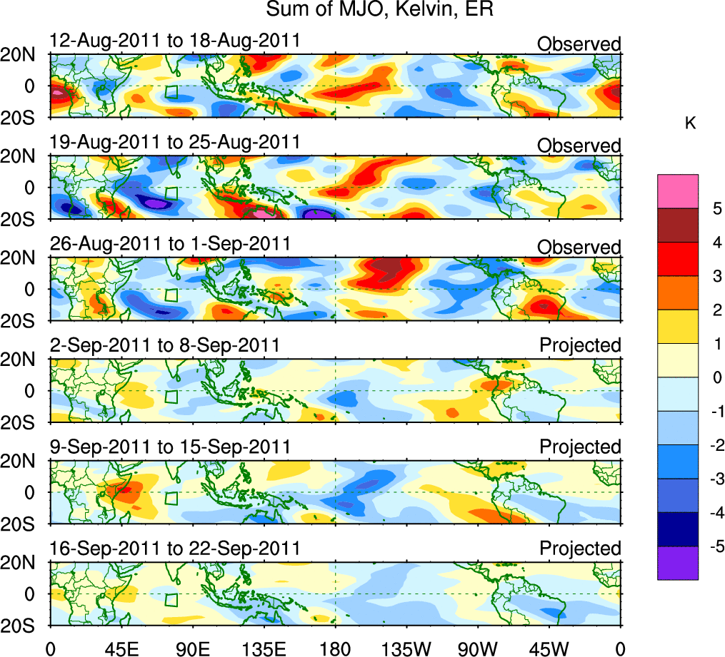 To identify tropical waves in near real-time, the OLR and UTWV data are filtered following Wheeler & Weickmann (2001 MWR). The daily anomalies are calculated using the first 3 harmonics of the seasonal cycle for 1979–2009. Missing values are then filled using linear interpolation in space and time. The most recent 365 days of anomalies are padded with 659 days of zeroes, and the result is filtered for each wave type.