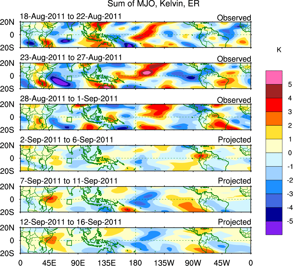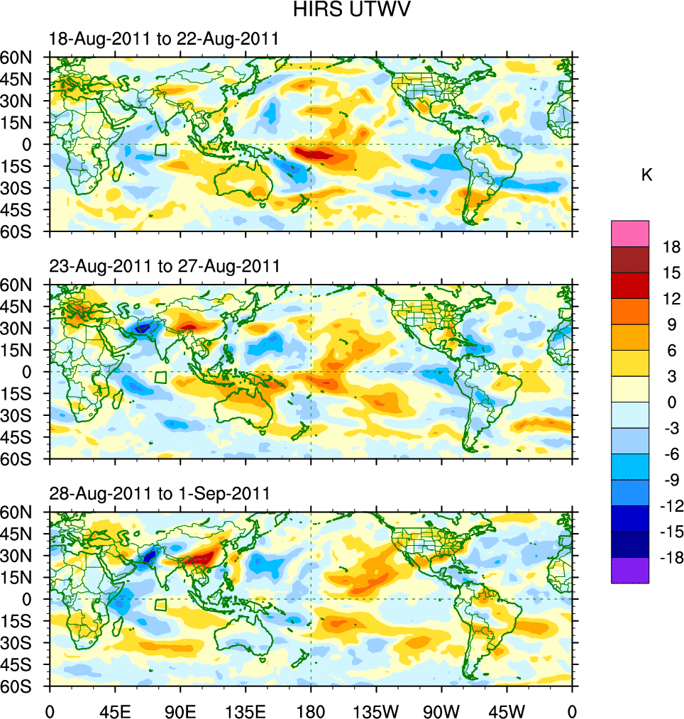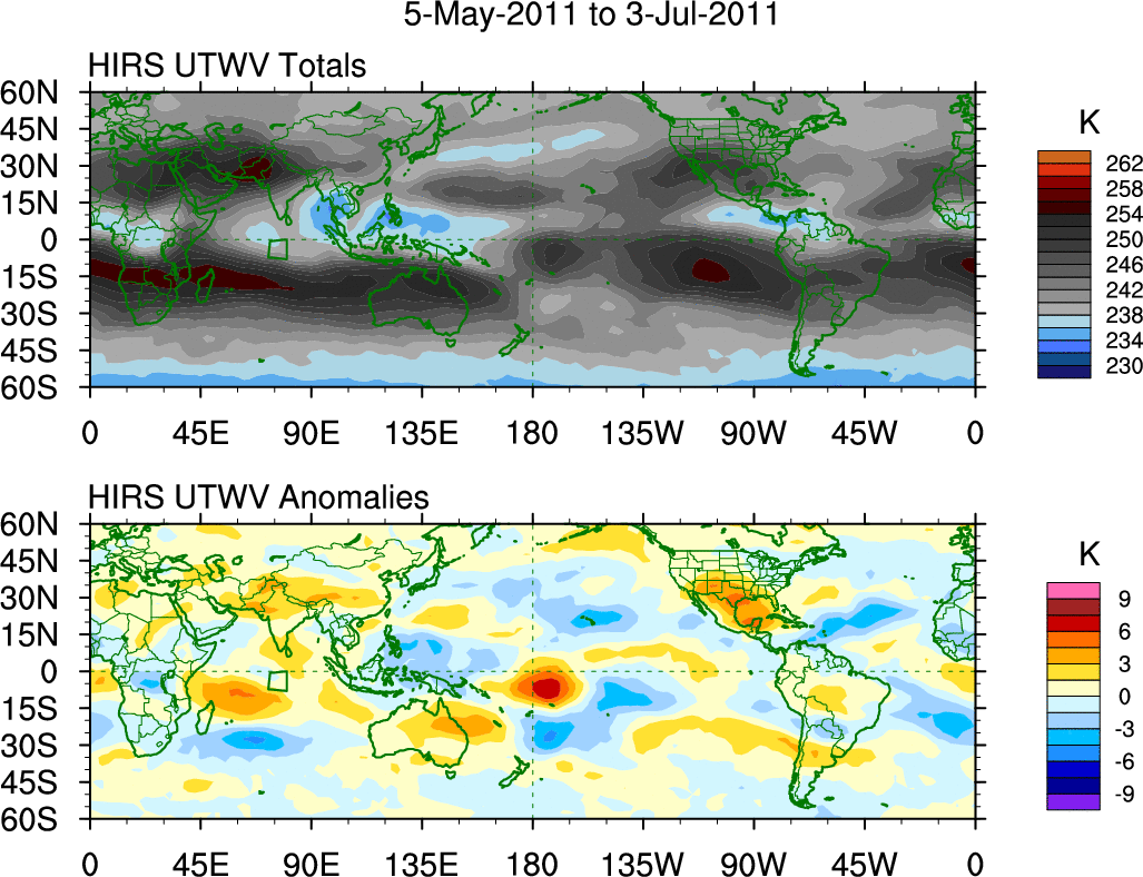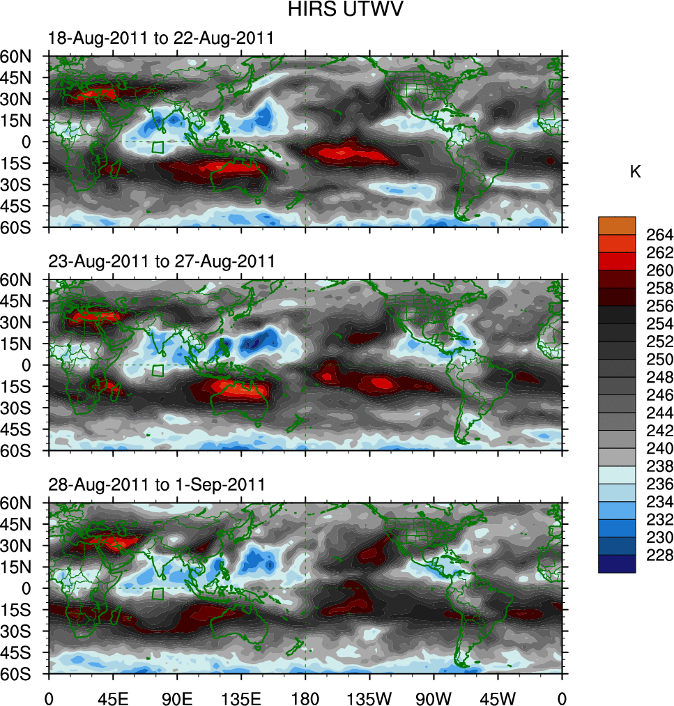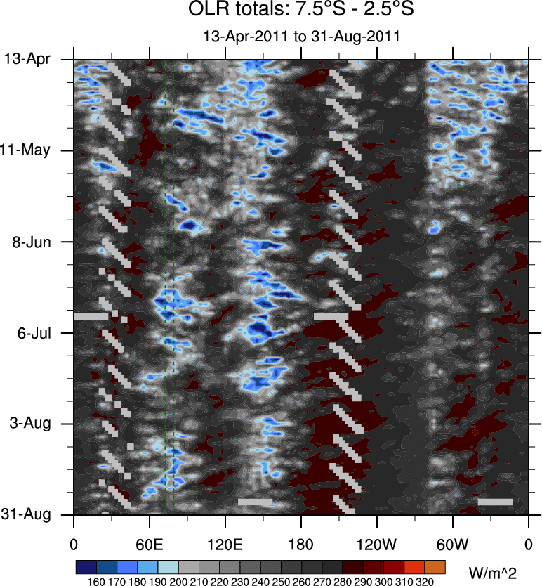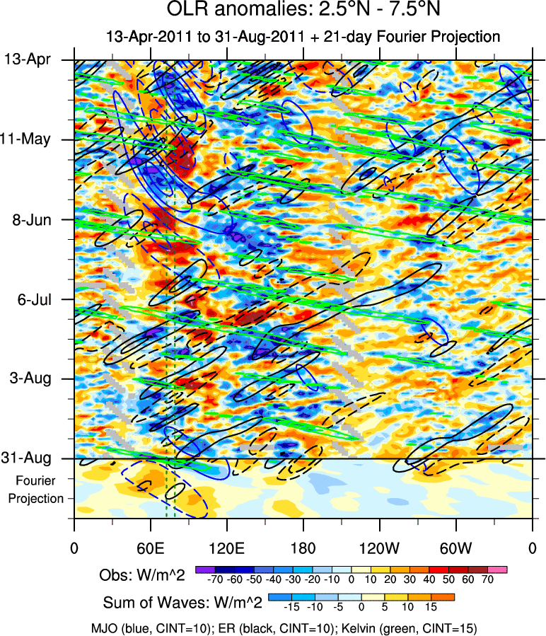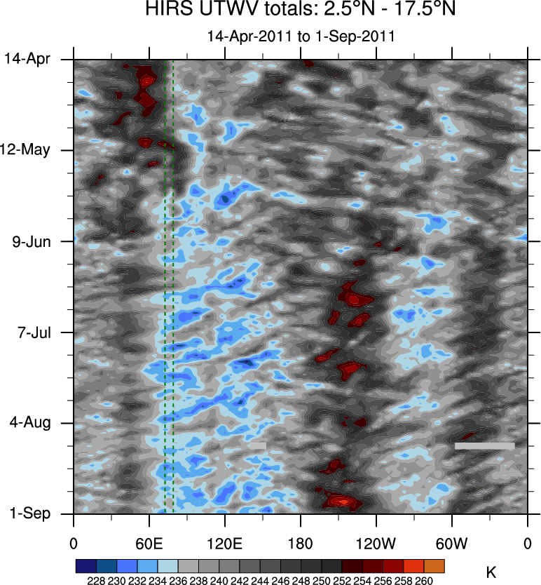 To identify tropical waves in near real-time, the OLR and UTWV data are filtered following Wheeler & Weickmann (2001 MWR). The daily anomalies are calculated using the first 3 harmonics of the seasonal cycle for 1979–2009. Missing values are then filled using linear interpolation in space and time. The most recent 365 days of anomalies are padded with 659 days of zeroes, and the result is filtered for each wave type.