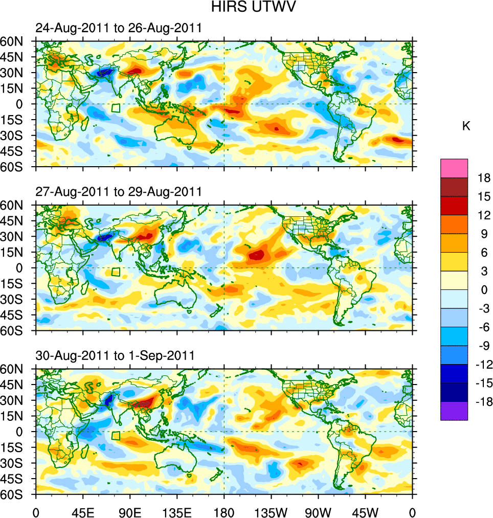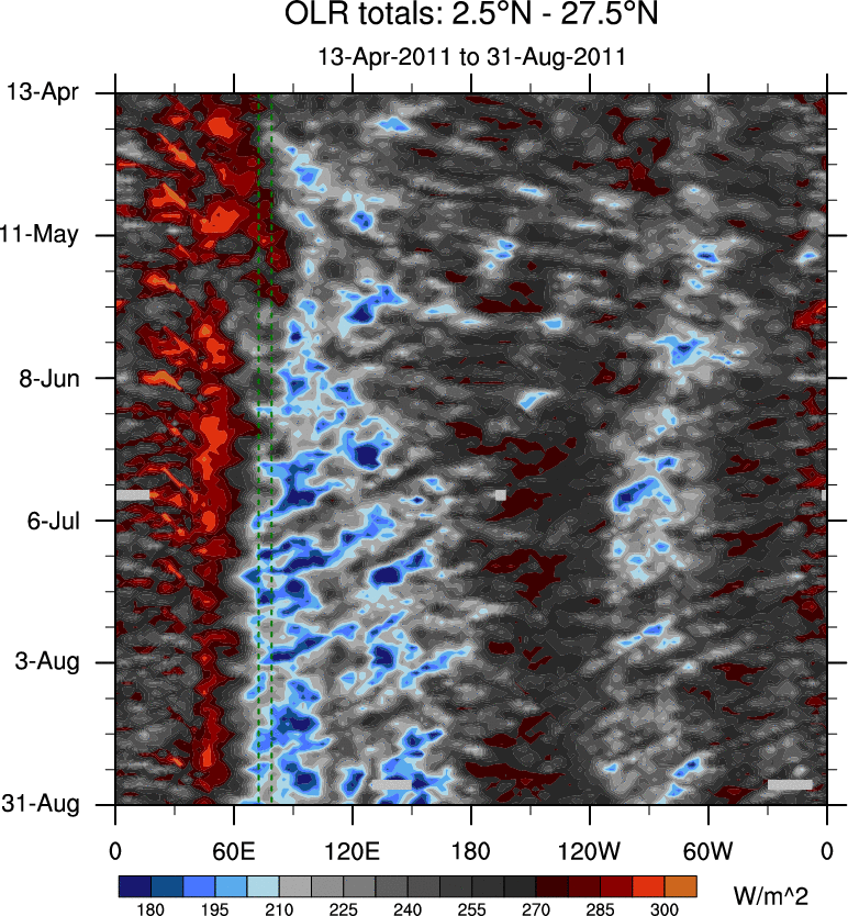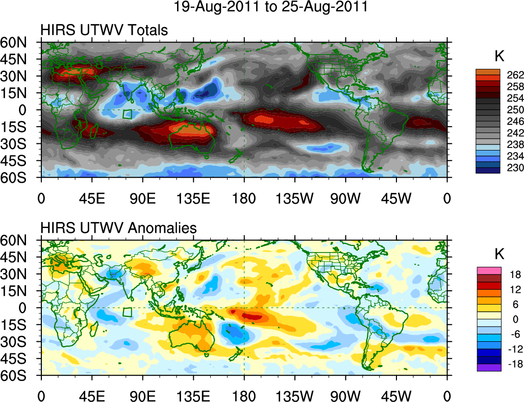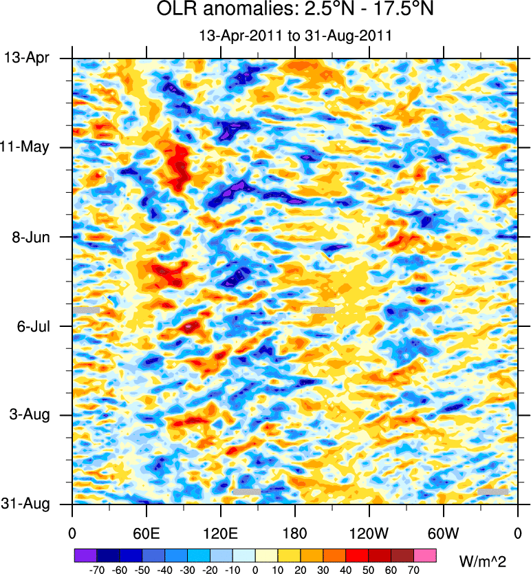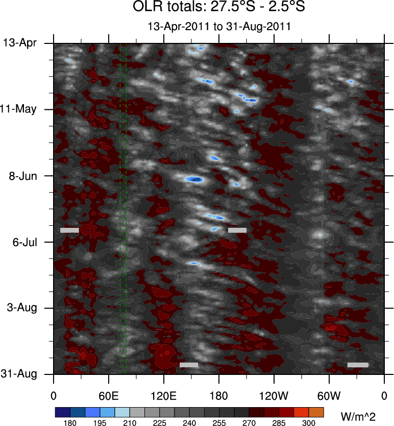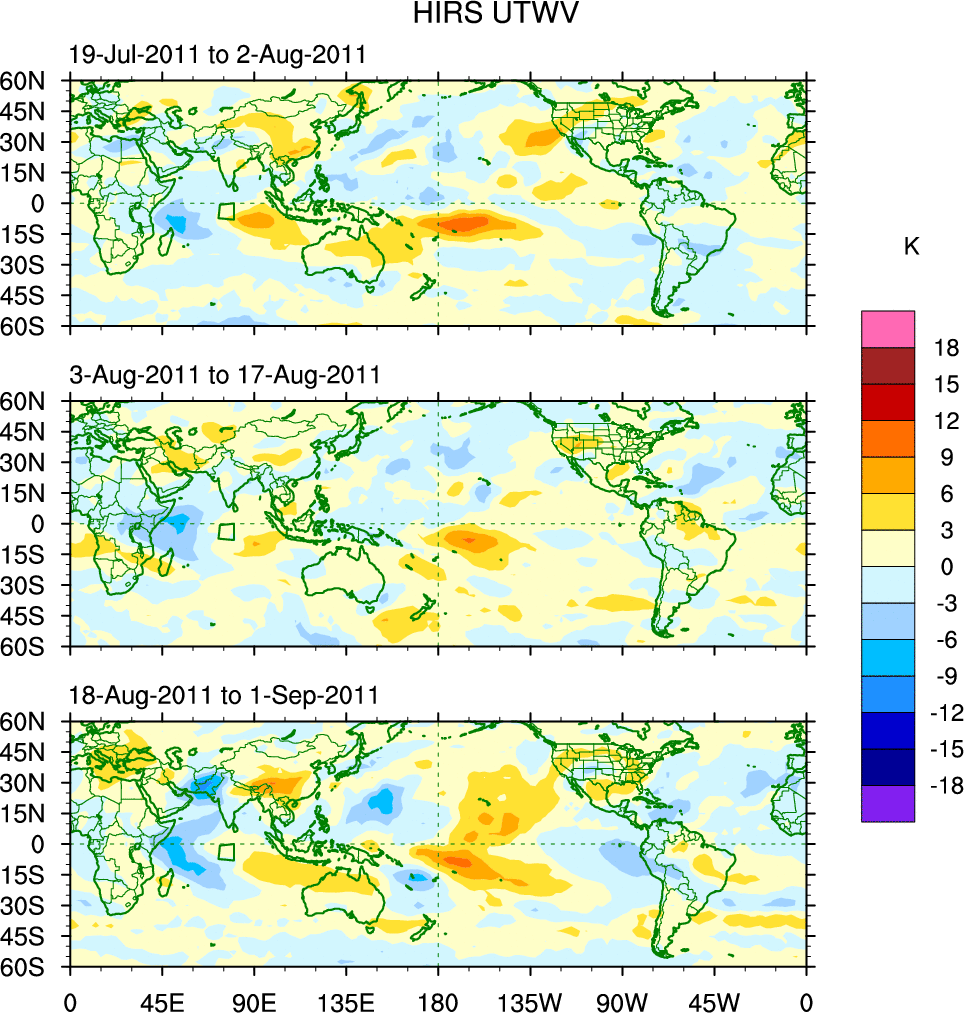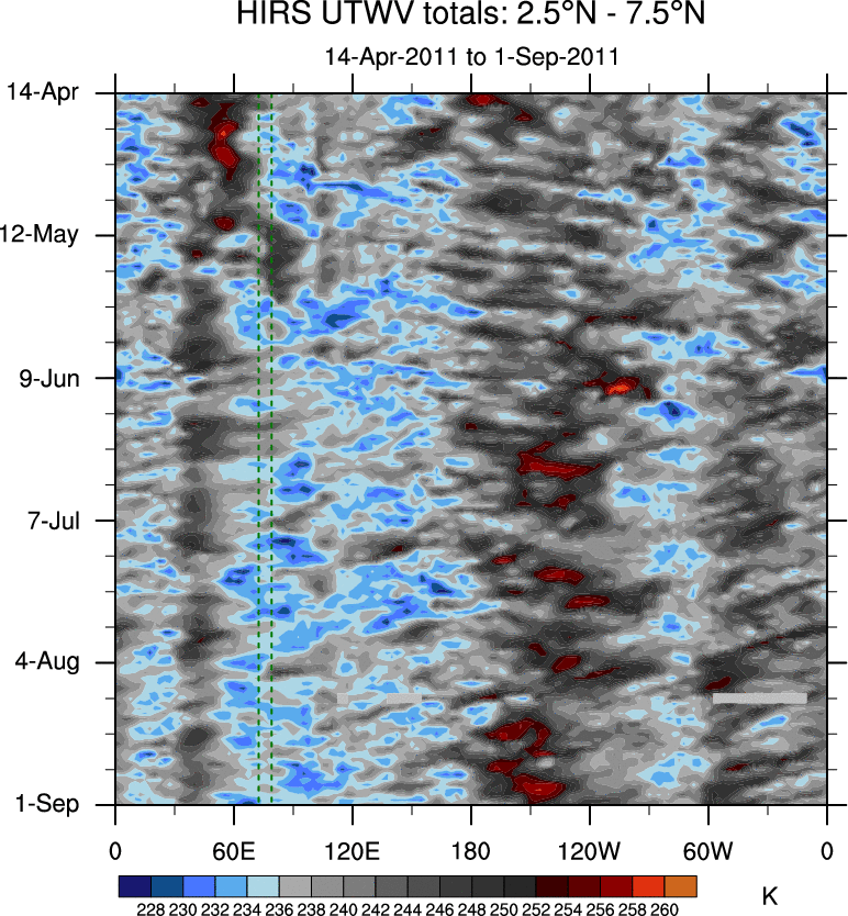 To identify tropical waves in near real-time, the OLR and UTWV data are filtered following Wheeler & Weickmann (2001 MWR). The daily anomalies are calculated using the first 3 harmonics of the seasonal cycle for 1979–2009. Missing values are then filled using linear interpolation in space and time. The most recent 365 days of anomalies are padded with 659 days of zeroes, and the result is filtered for each wave type.