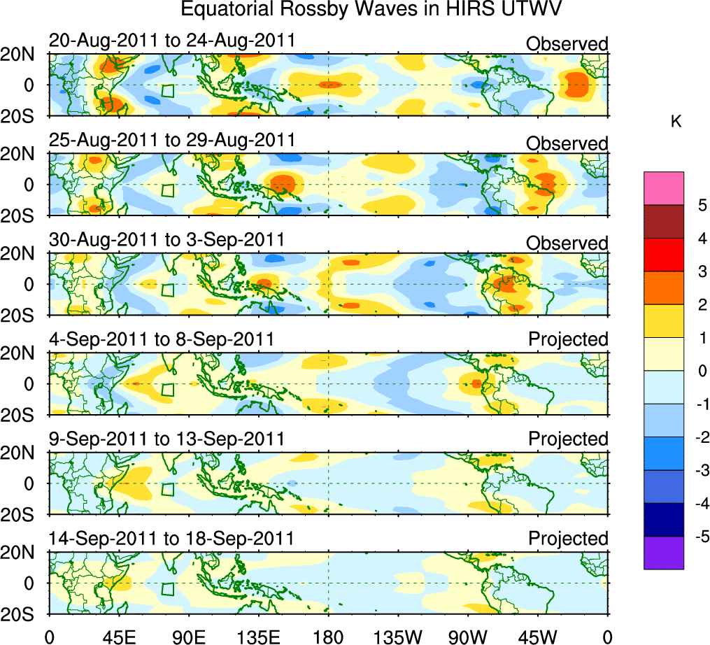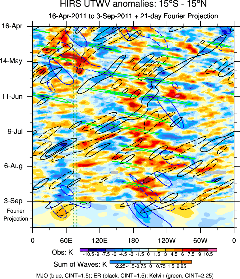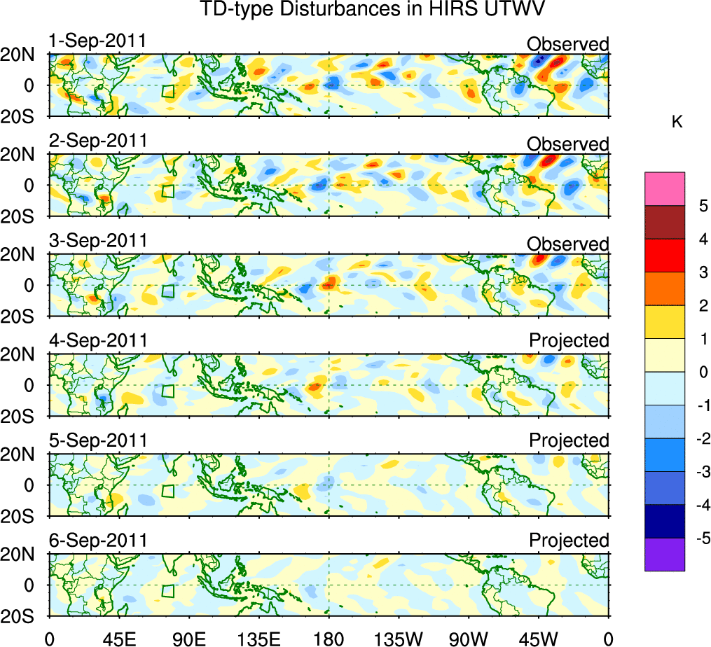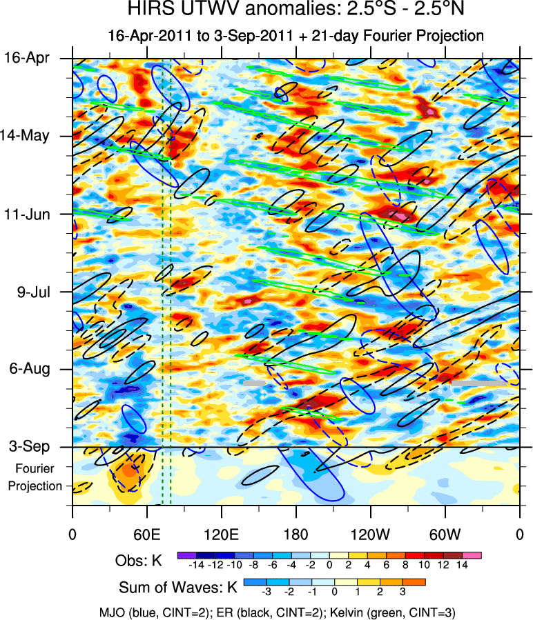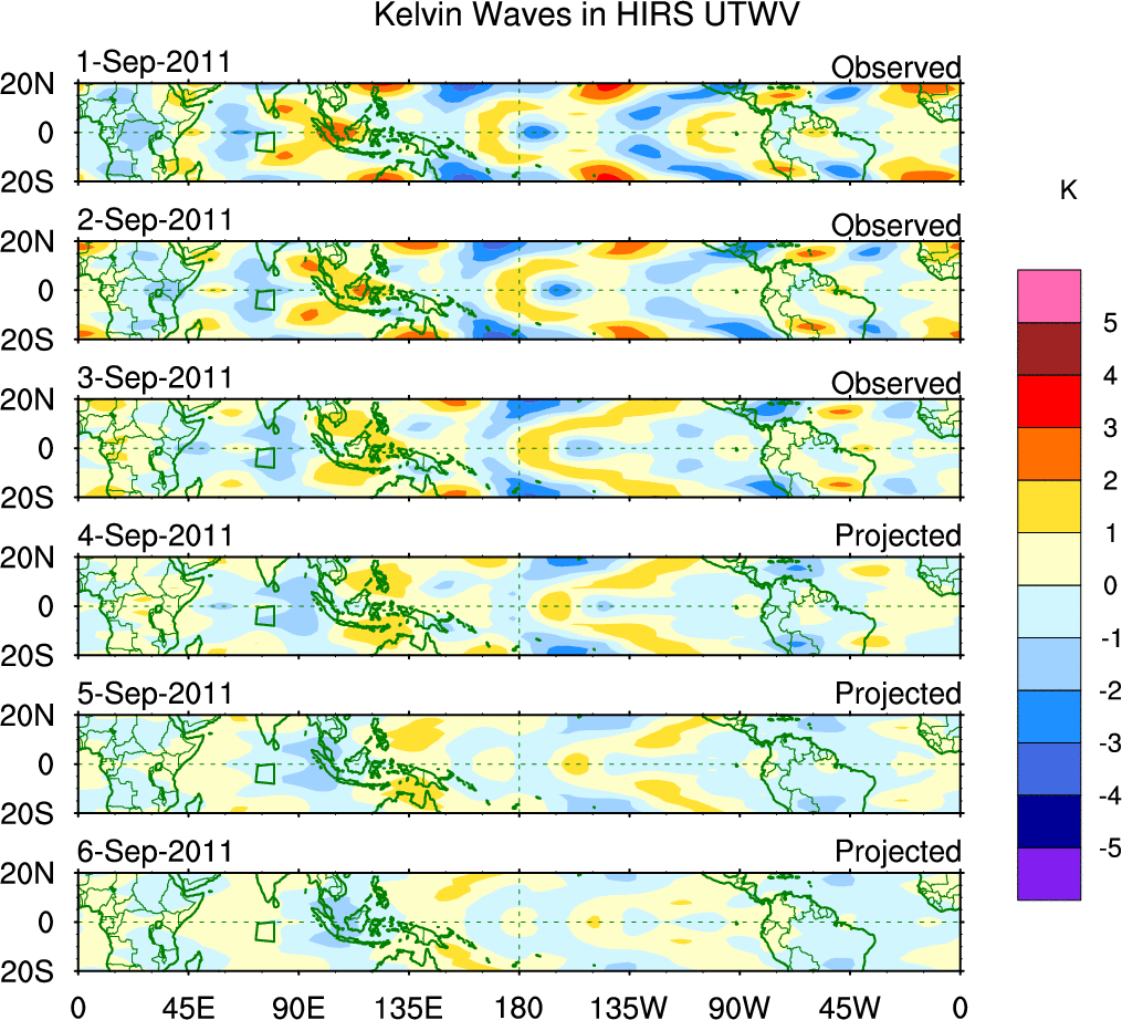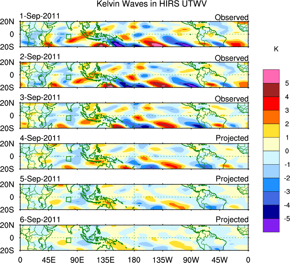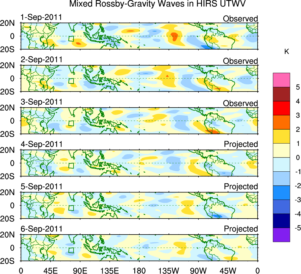 To identify tropical waves in near real-time, the OLR and UTWV data are filtered following Wheeler & Weickmann (2001 MWR). The daily anomalies are calculated using the first 3 harmonics of the seasonal cycle for 1979–2009. Missing values are then filled using linear interpolation in space and time. The most recent 365 days of anomalies are padded with 659 days of zeroes, and the result is filtered for each wave type.