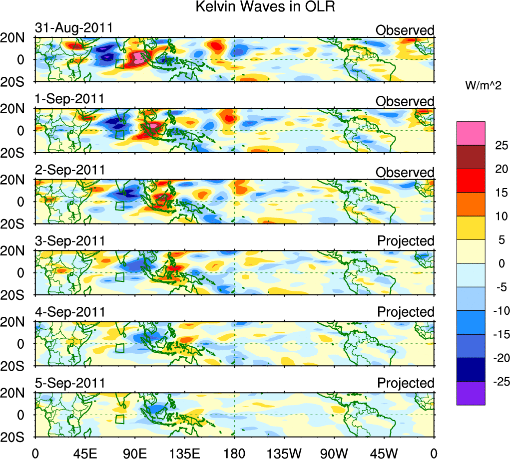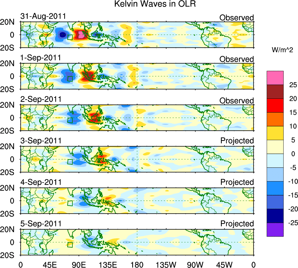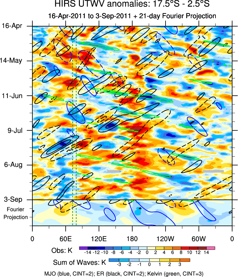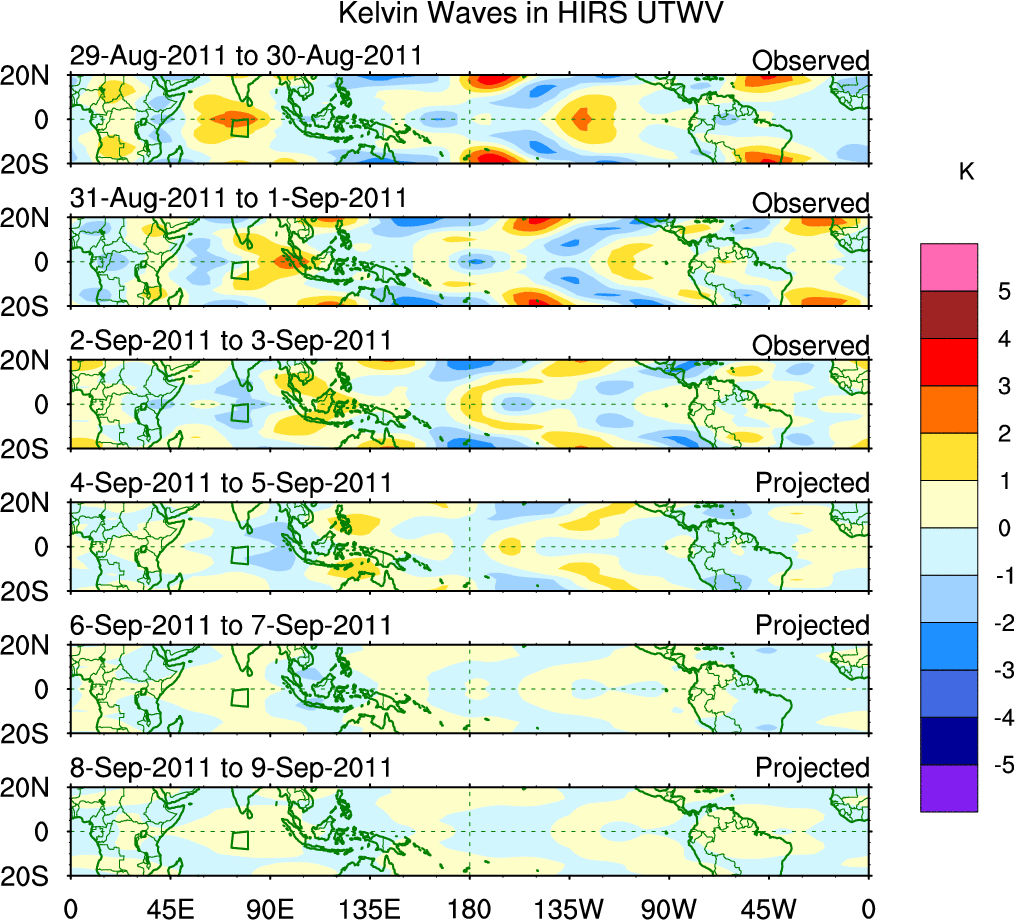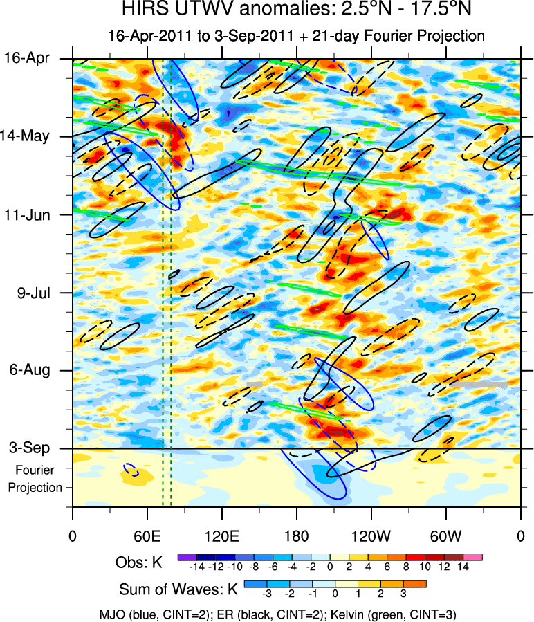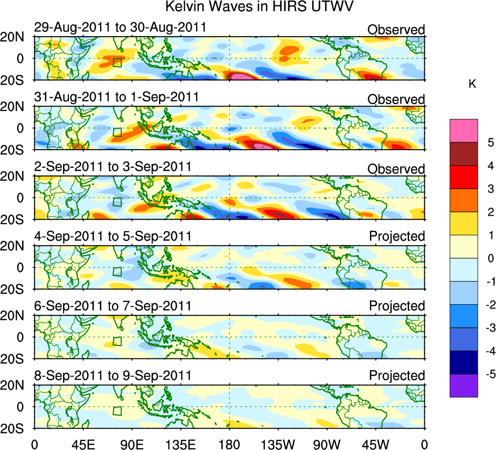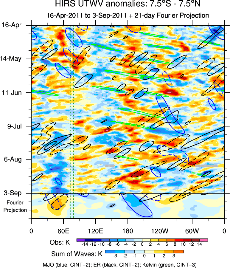To identify tropical waves in near real-time, the OLR and UTWV data are filtered following Wheeler & Weickmann (2001 MWR). The daily anomalies are calculated using the first 3 harmonics of the seasonal cycle for 1979–2009. Missing values are then filled using linear interpolation in space and time. The most recent 365 days of anomalies are padded with 659 days of zeroes, and the result is filtered for each wave type.