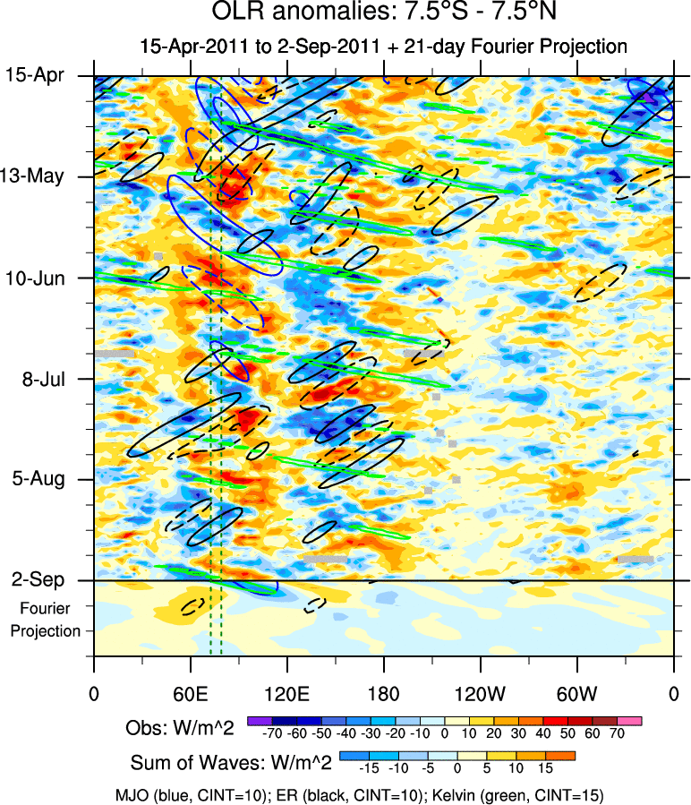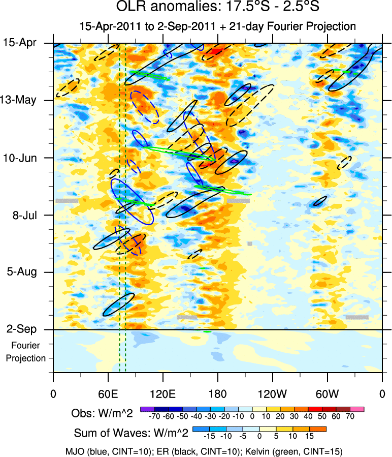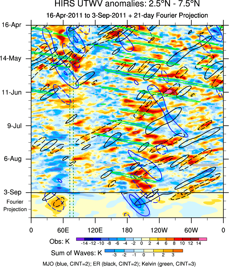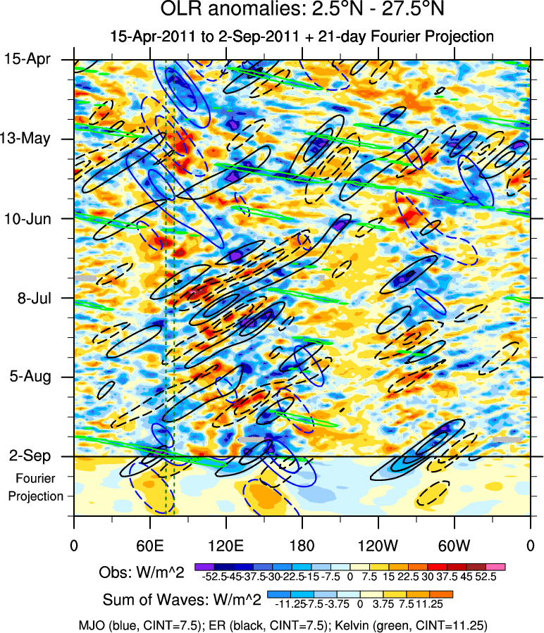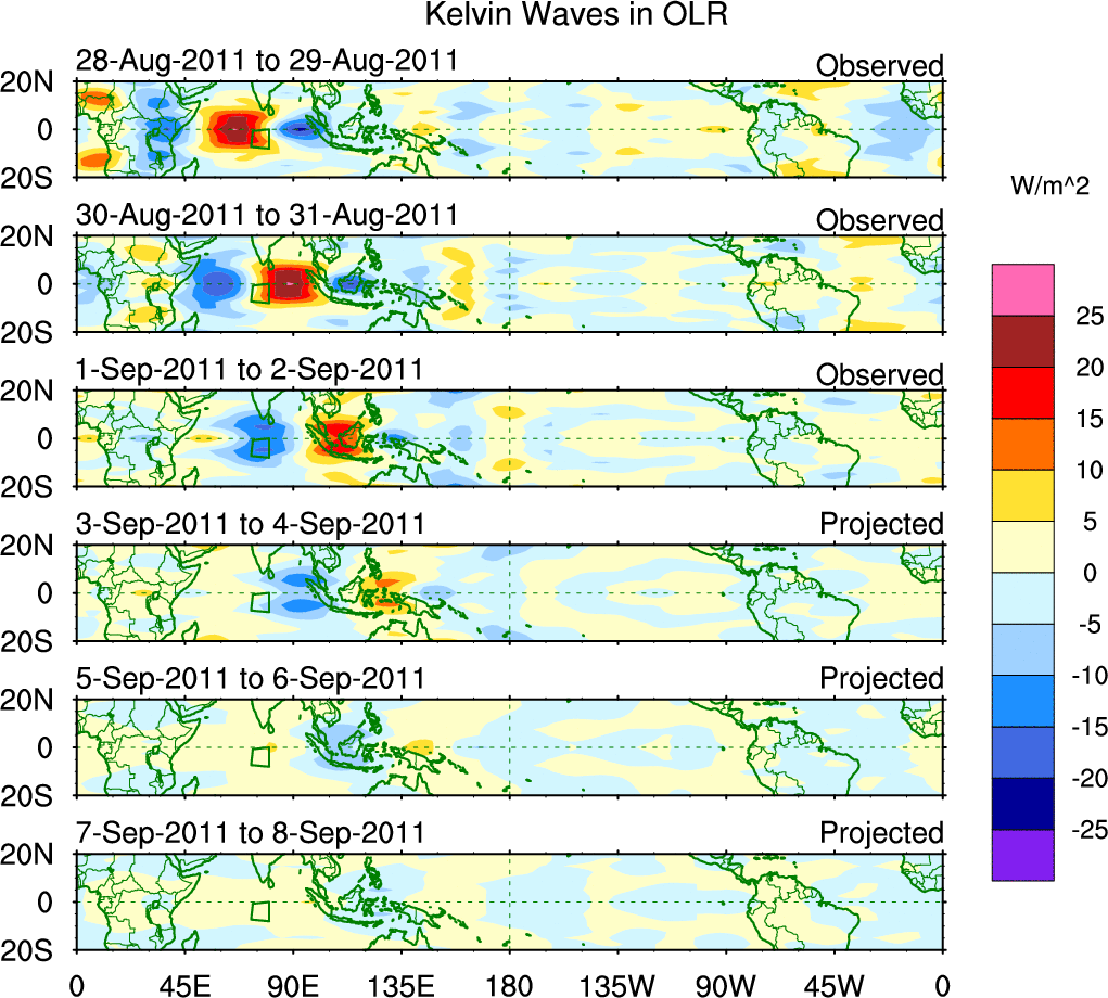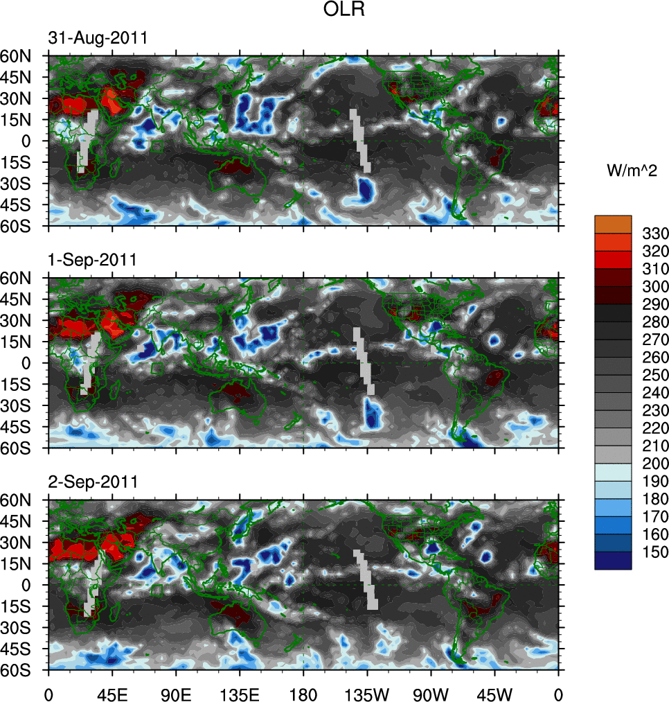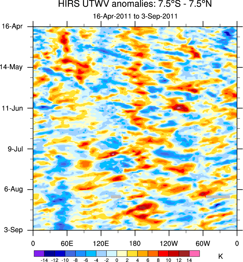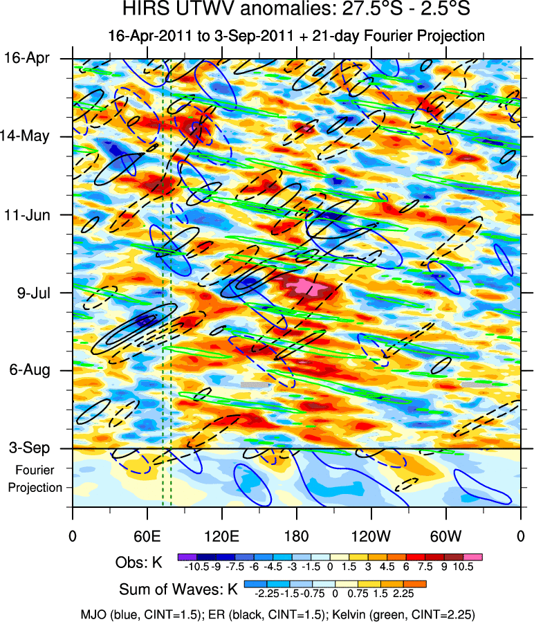 To identify tropical waves in near real-time, the OLR and UTWV data are filtered following Wheeler & Weickmann (2001 MWR). The daily anomalies are calculated using the first 3 harmonics of the seasonal cycle for 1979–2009. Missing values are then filled using linear interpolation in space and time. The most recent 365 days of anomalies are padded with 659 days of zeroes, and the result is filtered for each wave type.