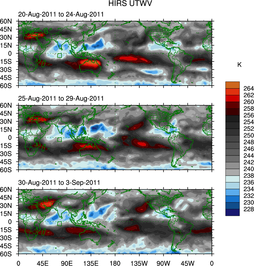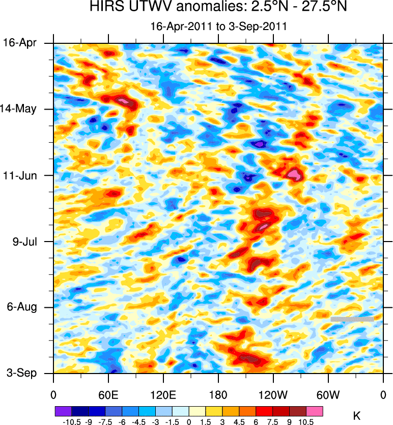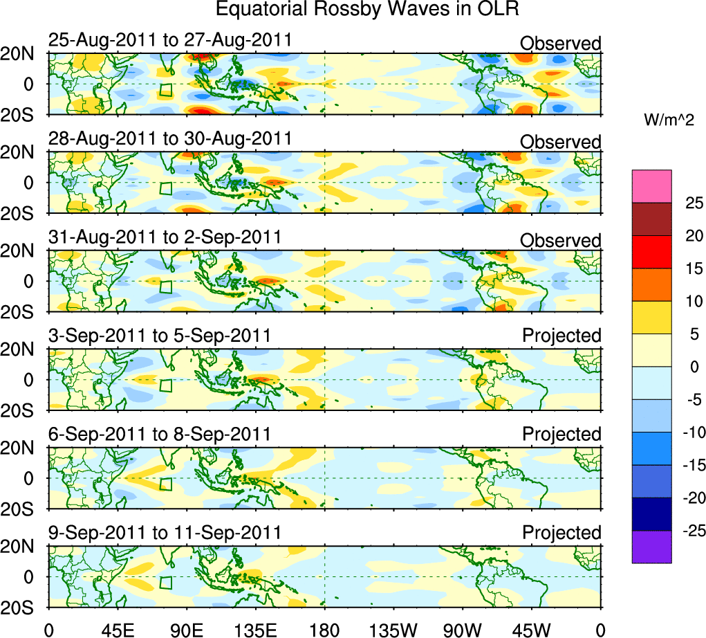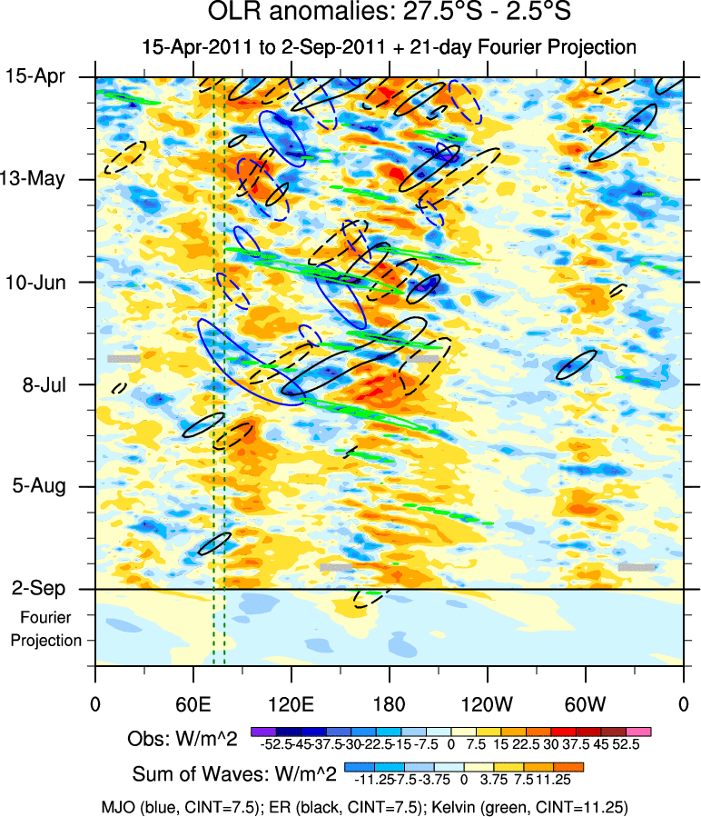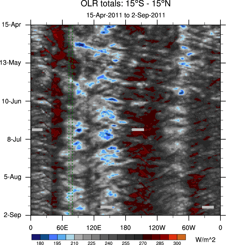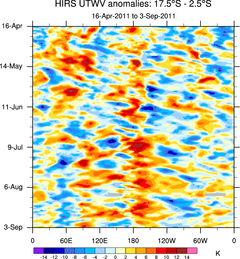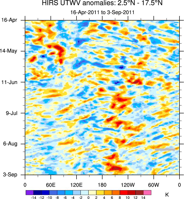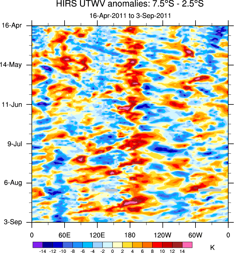 To identify tropical waves in near real-time, the OLR and UTWV data are filtered following Wheeler & Weickmann (2001 MWR). The daily anomalies are calculated using the first 3 harmonics of the seasonal cycle for 1979–2009. Missing values are then filled using linear interpolation in space and time. The most recent 365 days of anomalies are padded with 659 days of zeroes, and the result is filtered for each wave type.