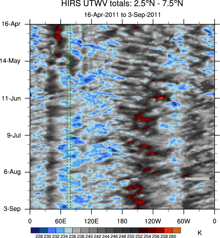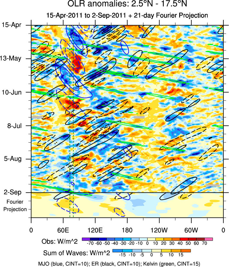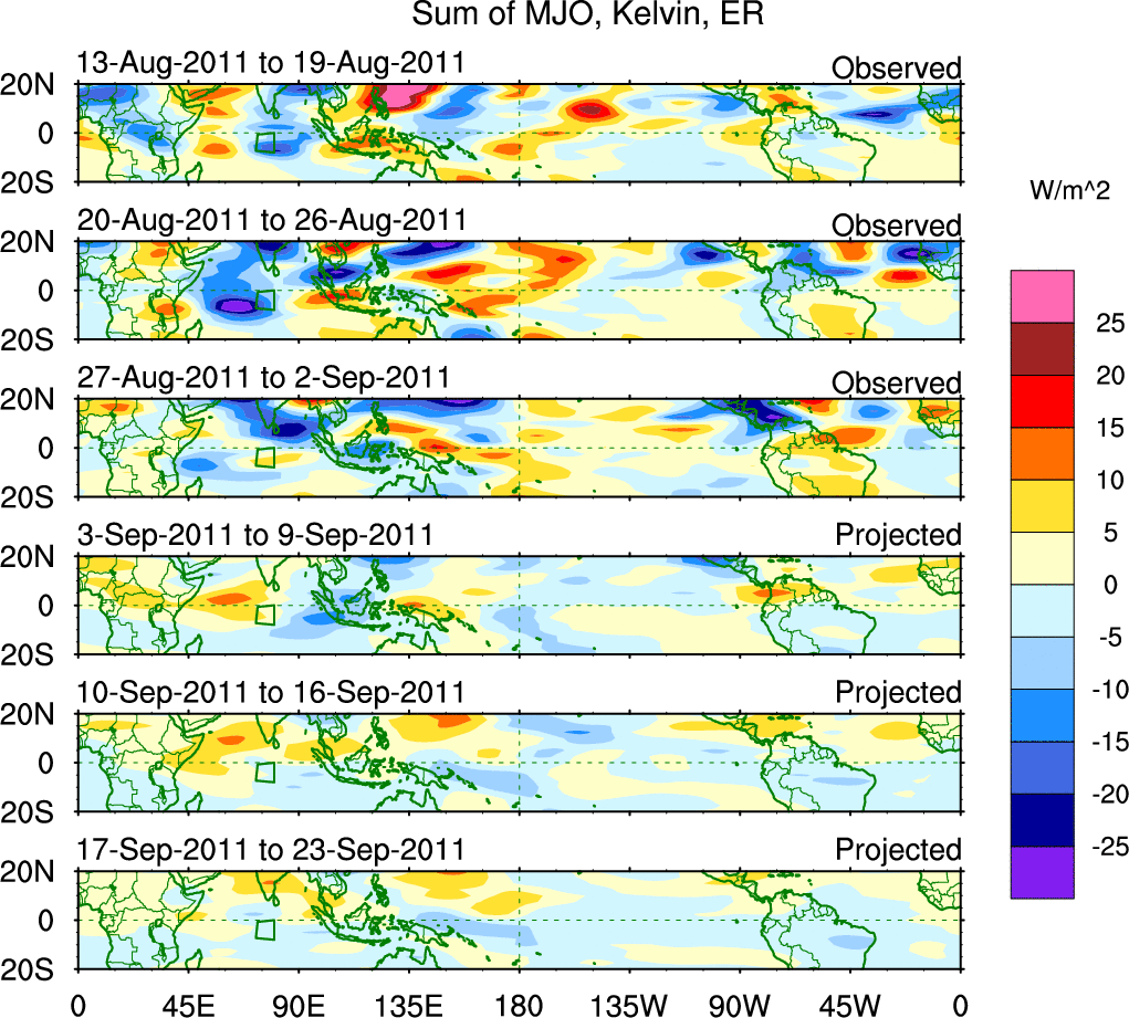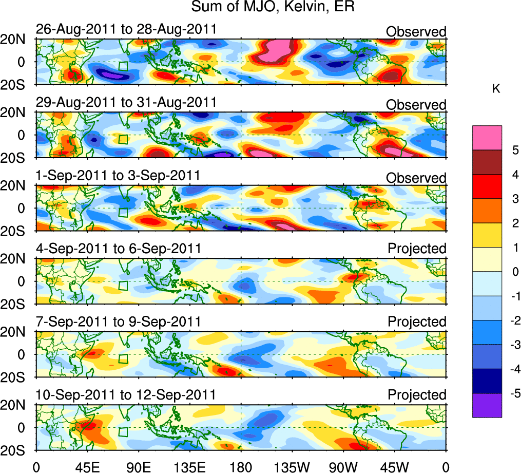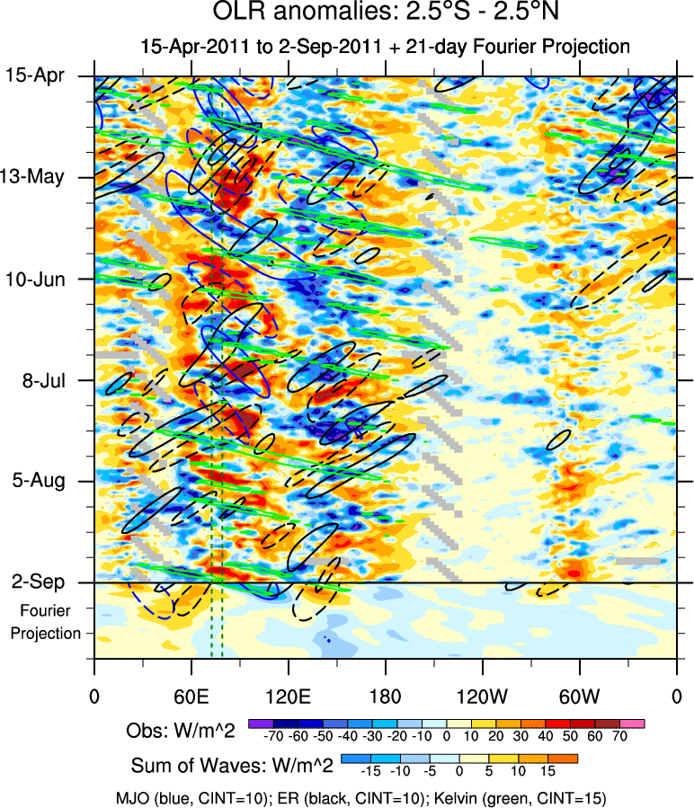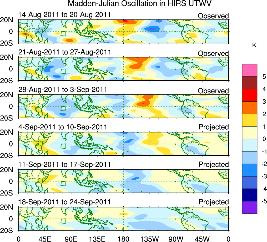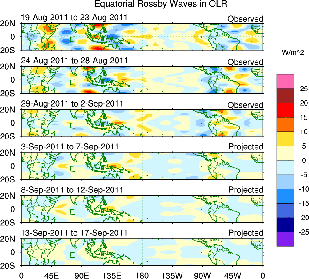 To identify tropical waves in near real-time, the OLR and UTWV data are filtered following Wheeler & Weickmann (2001 MWR). The daily anomalies are calculated using the first 3 harmonics of the seasonal cycle for 1979–2009. Missing values are then filled using linear interpolation in space and time. The most recent 365 days of anomalies are padded with 659 days of zeroes, and the result is filtered for each wave type.