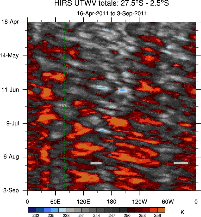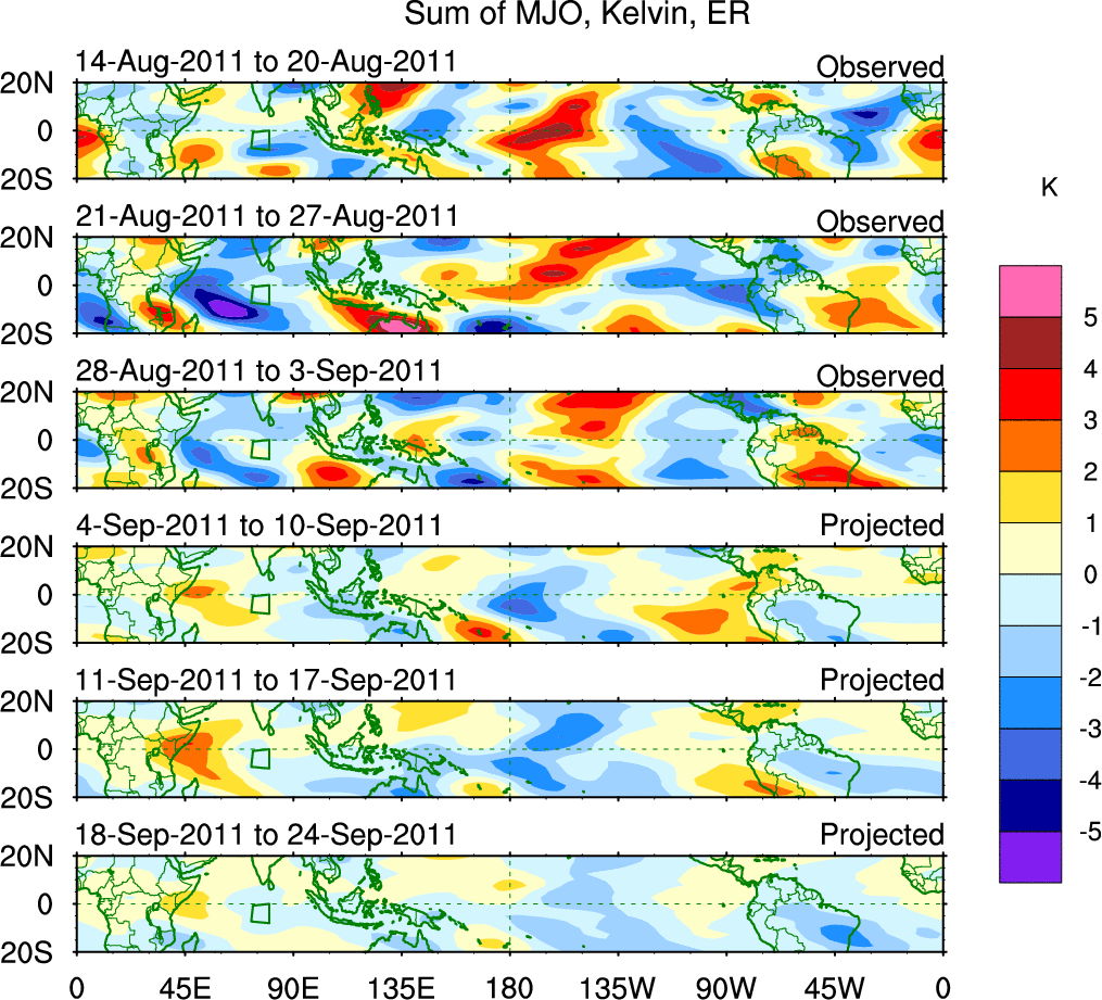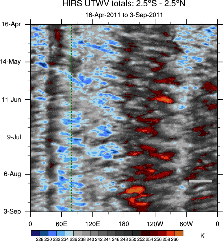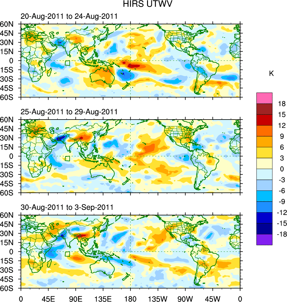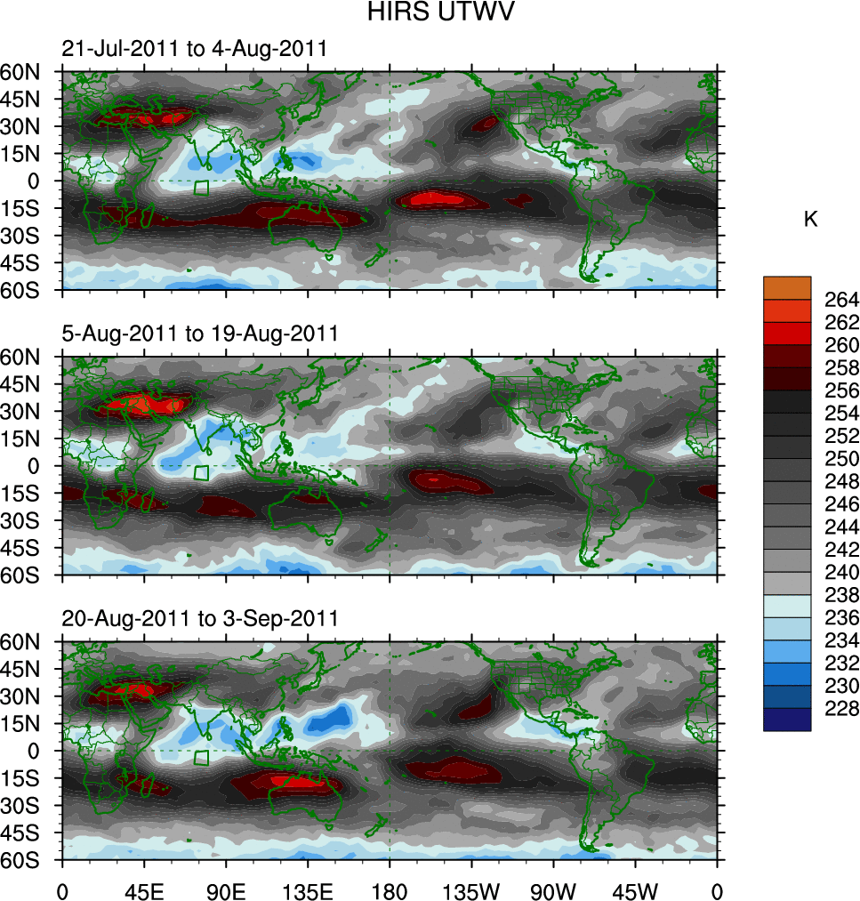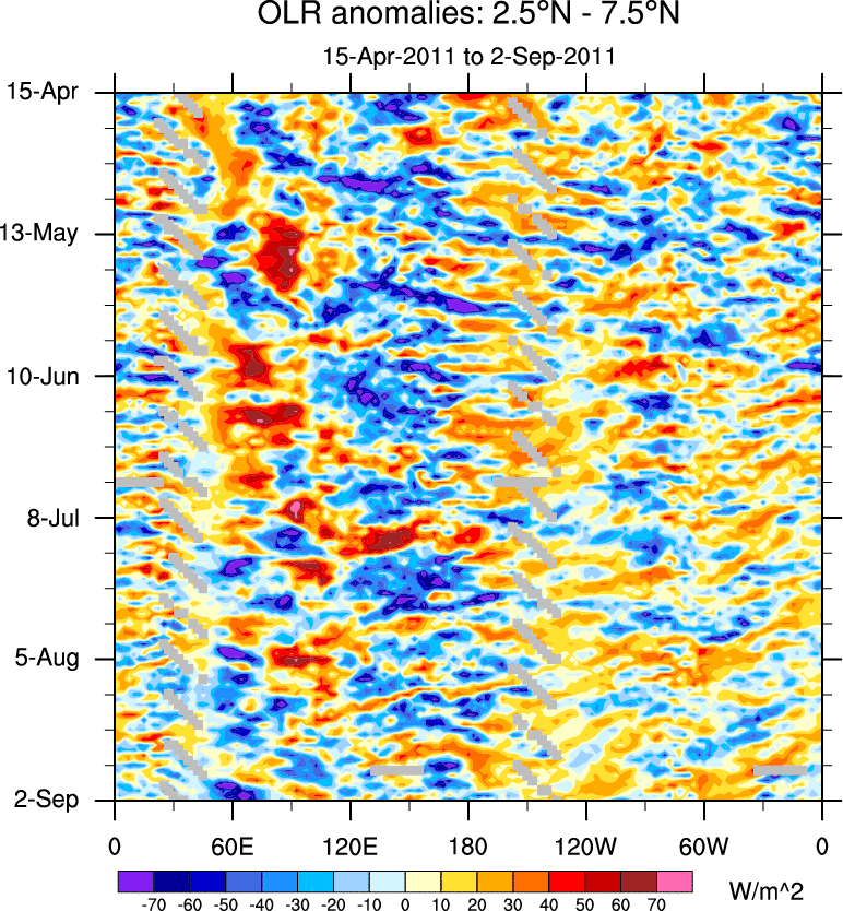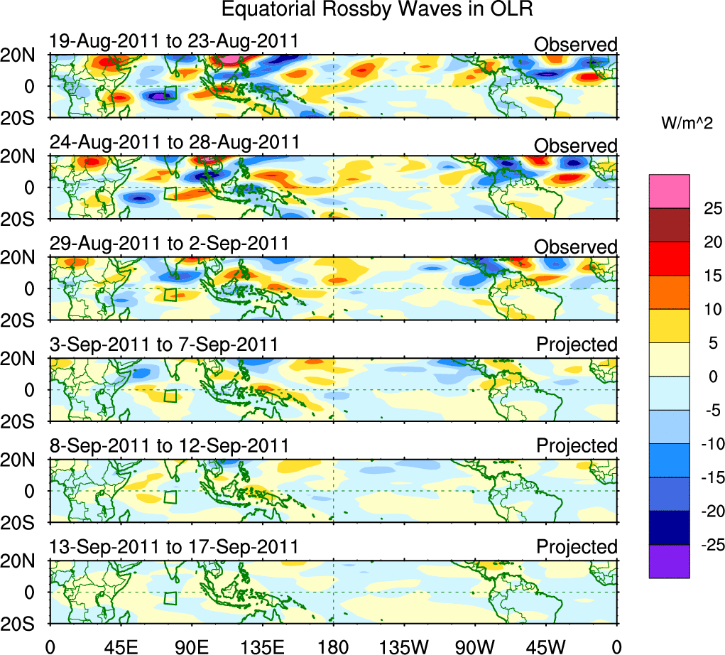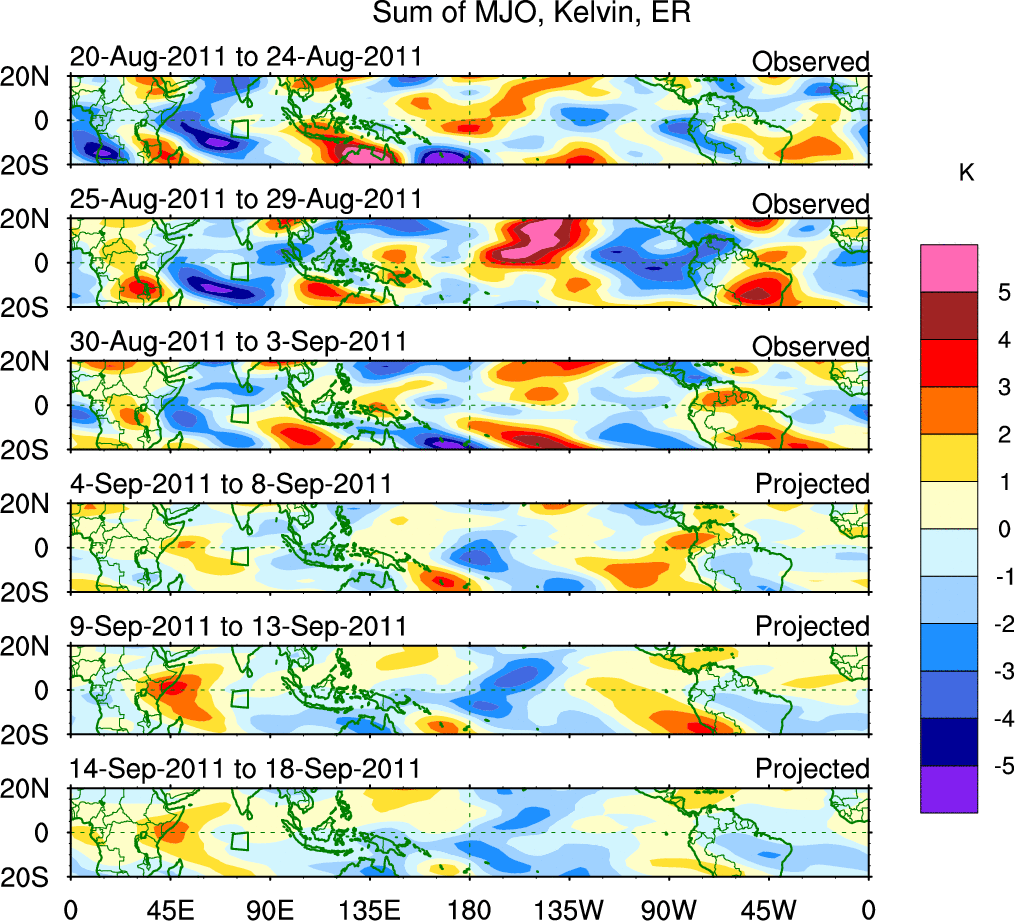 To identify tropical waves in near real-time, the OLR and UTWV data are filtered following Wheeler & Weickmann (2001 MWR). The daily anomalies are calculated using the first 3 harmonics of the seasonal cycle for 1979–2009. Missing values are then filled using linear interpolation in space and time. The most recent 365 days of anomalies are padded with 659 days of zeroes, and the result is filtered for each wave type.