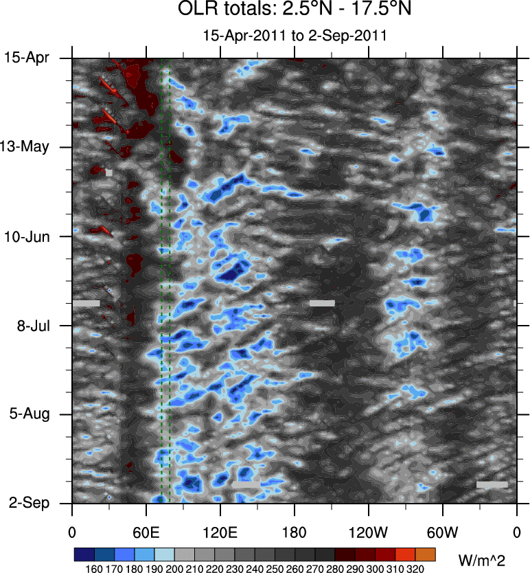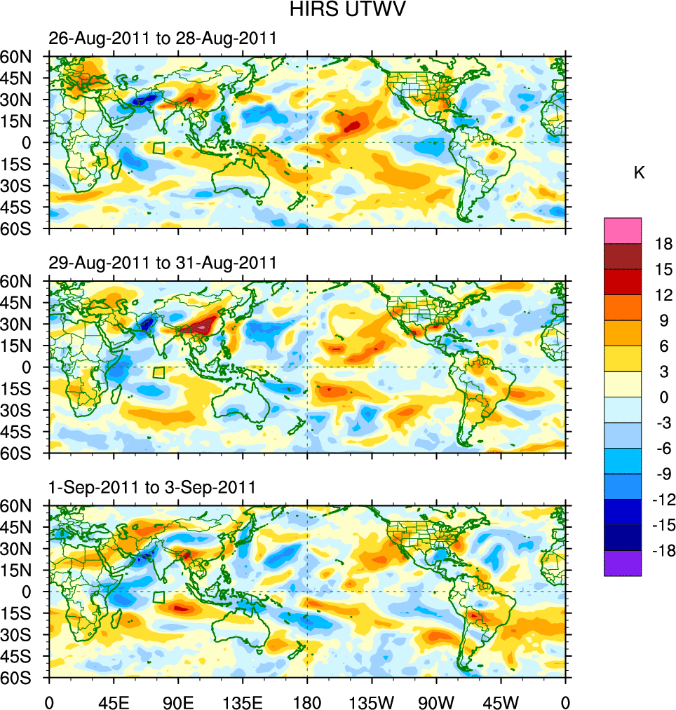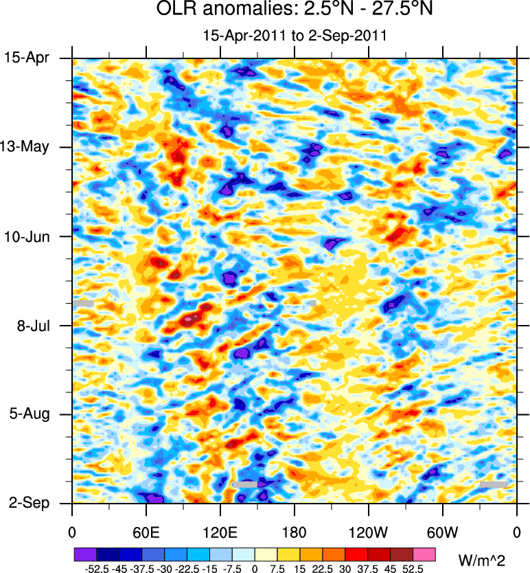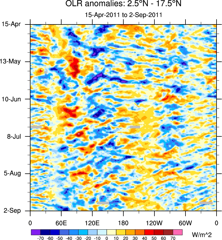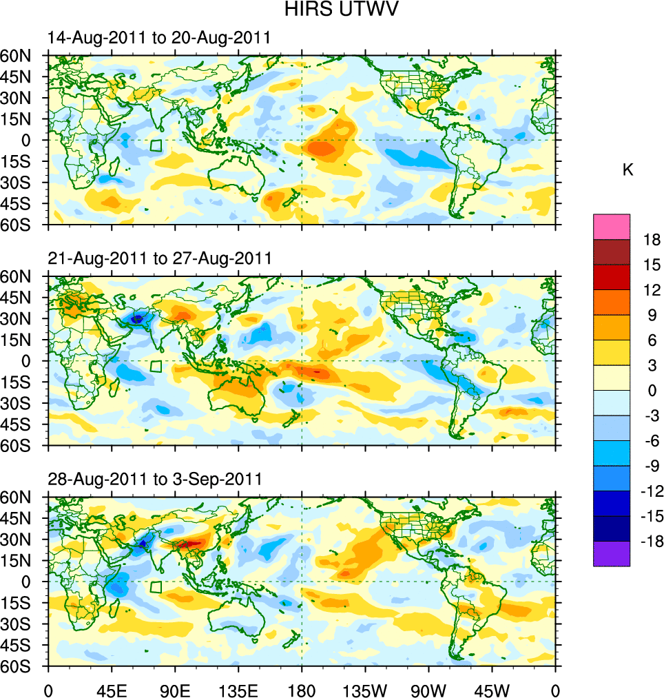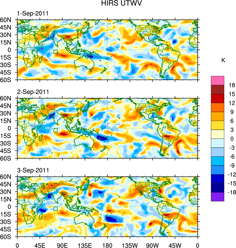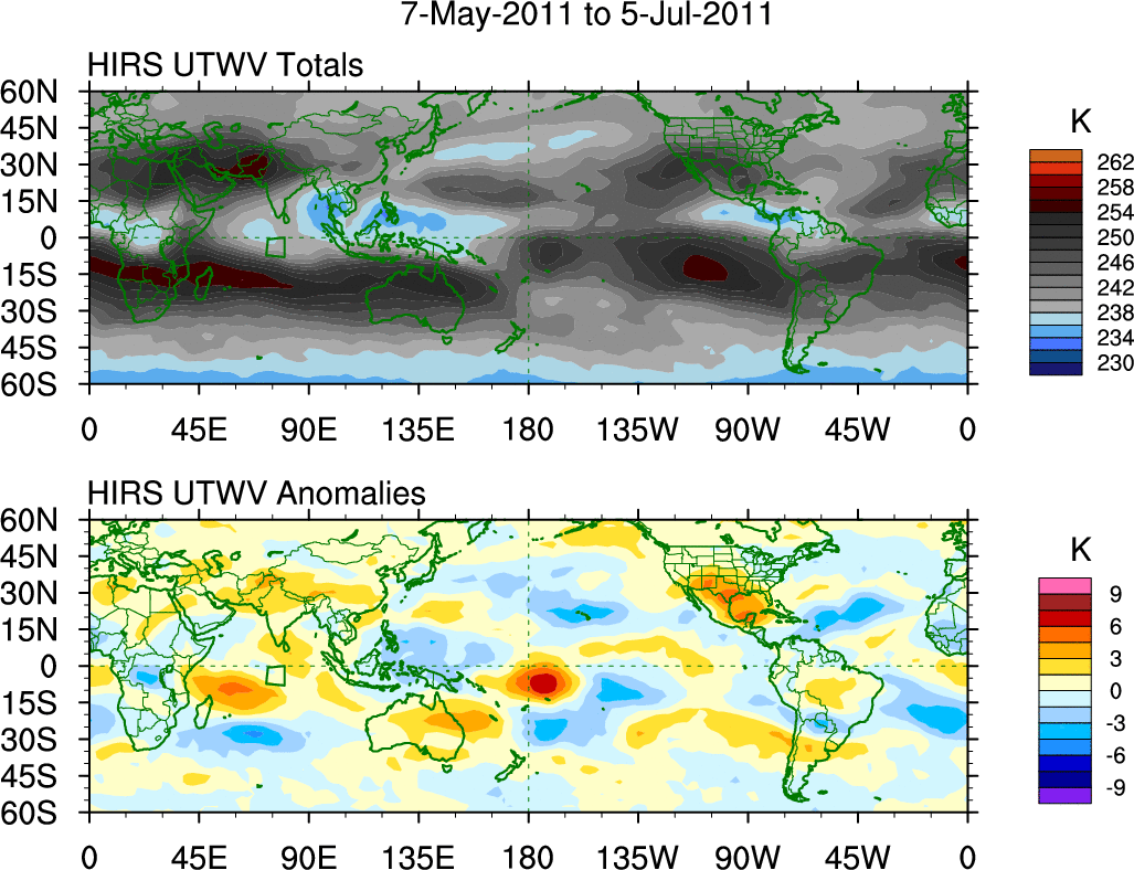 To identify tropical waves in near real-time, the OLR and UTWV data are filtered following Wheeler & Weickmann (2001 MWR). The daily anomalies are calculated using the first 3 harmonics of the seasonal cycle for 1979–2009. Missing values are then filled using linear interpolation in space and time. The most recent 365 days of anomalies are padded with 659 days of zeroes, and the result is filtered for each wave type.