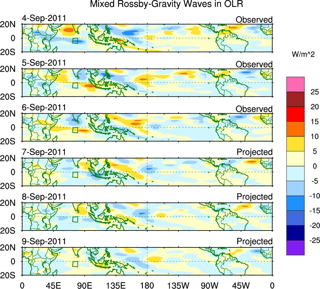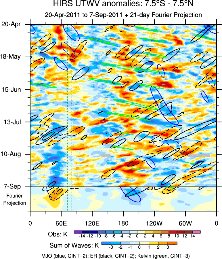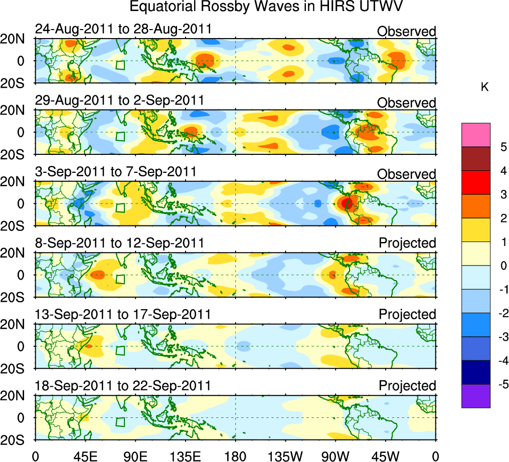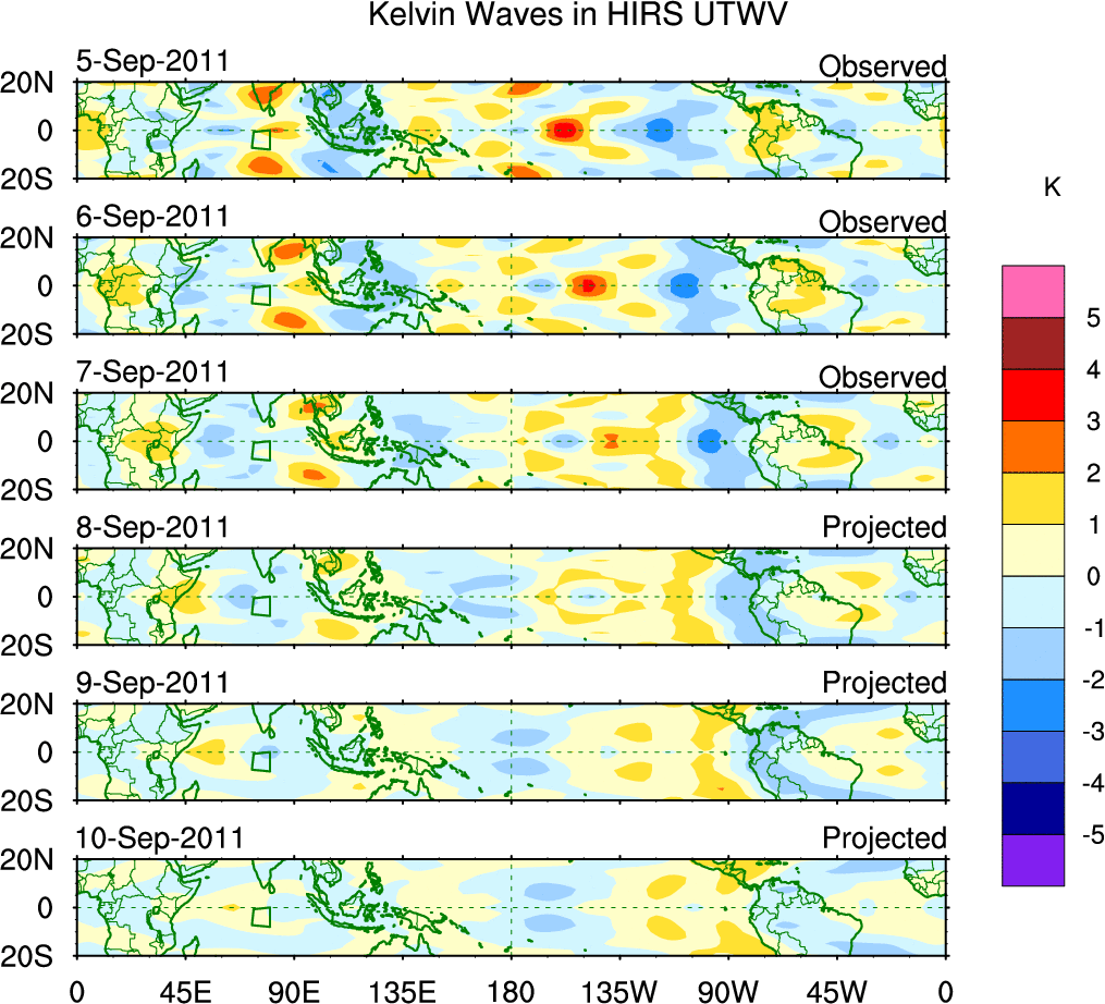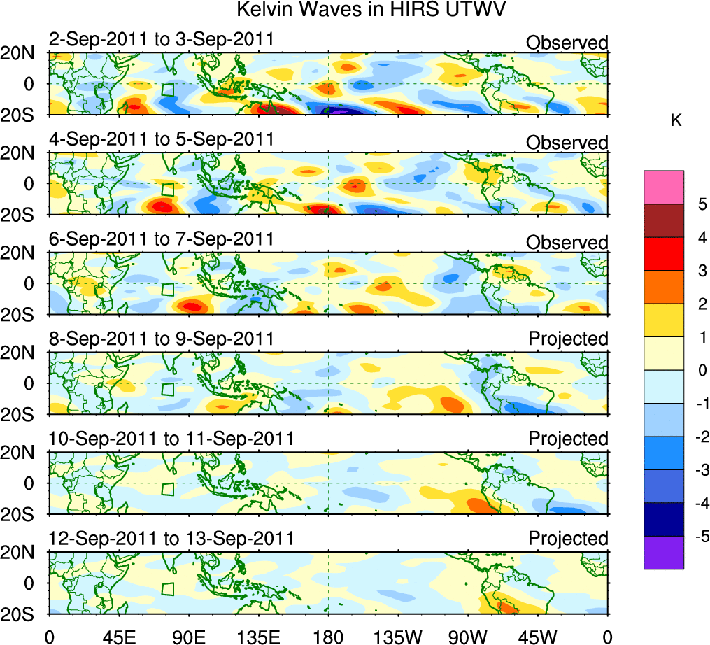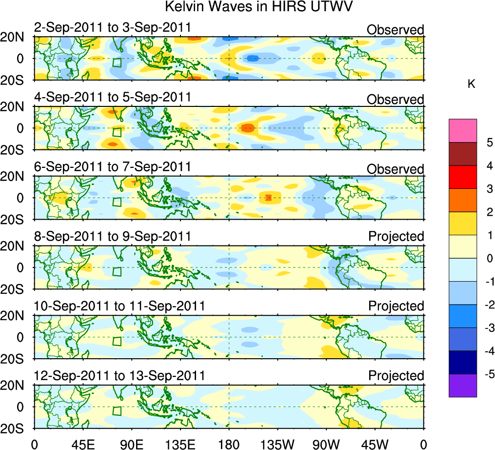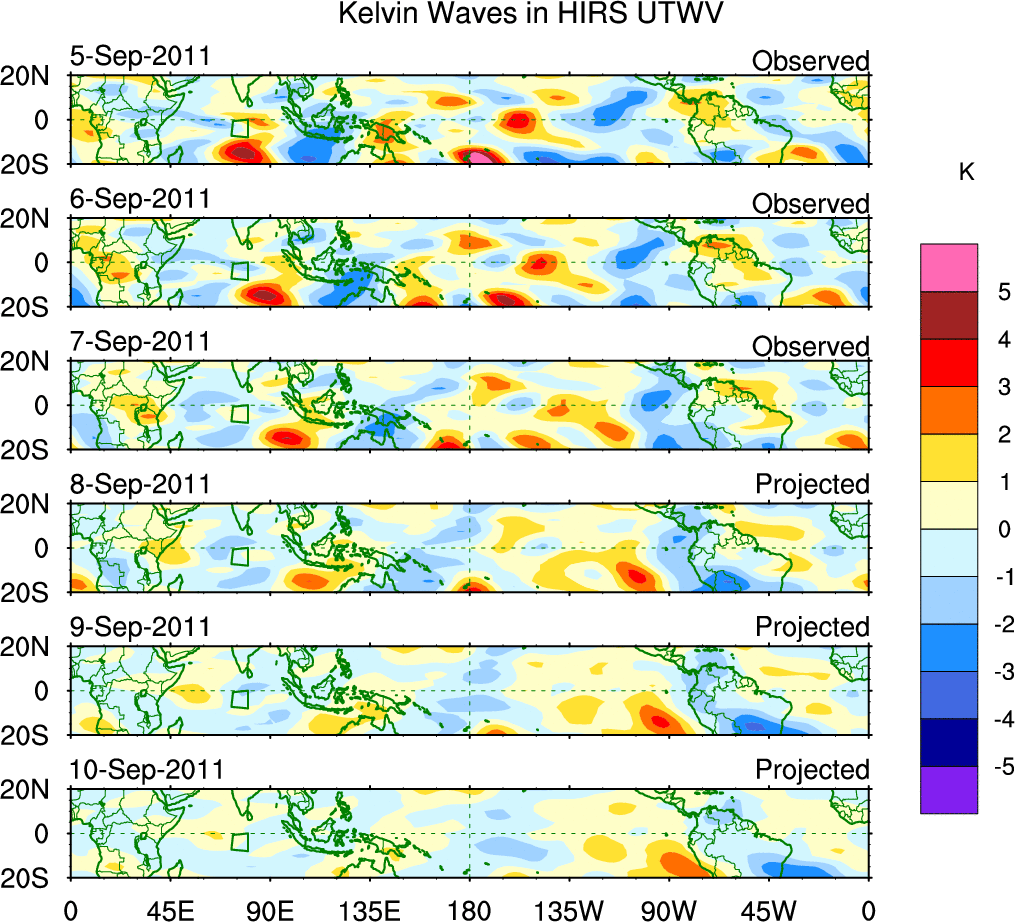 To identify tropical waves in near real-time, the OLR and UTWV data are filtered following Wheeler & Weickmann (2001 MWR). The daily anomalies are calculated using the first 3 harmonics of the seasonal cycle for 1979–2009. Missing values are then filled using linear interpolation in space and time. The most recent 365 days of anomalies are padded with 659 days of zeroes, and the result is filtered for each wave type.