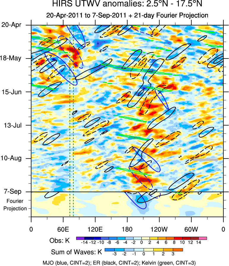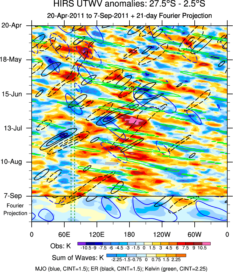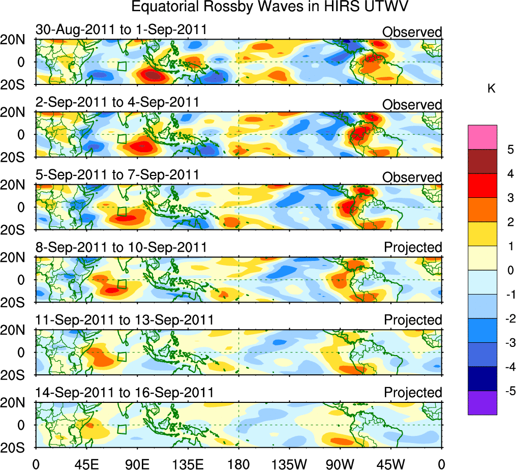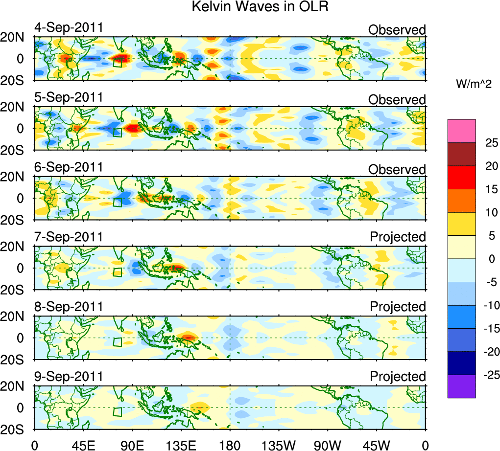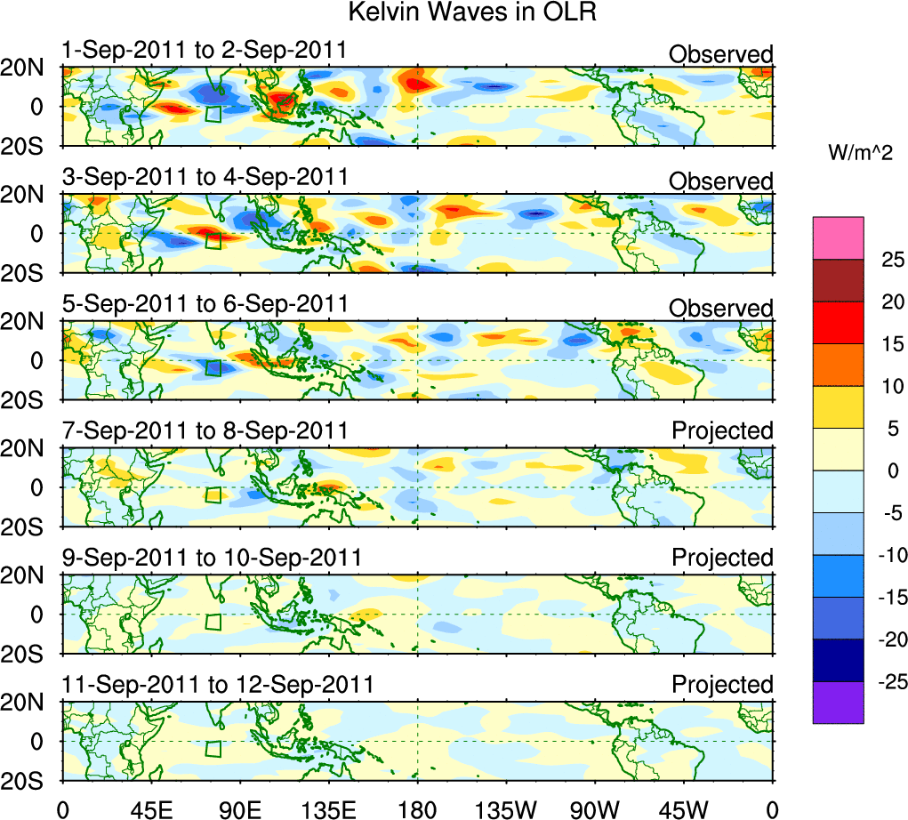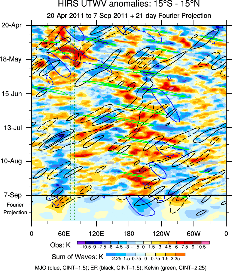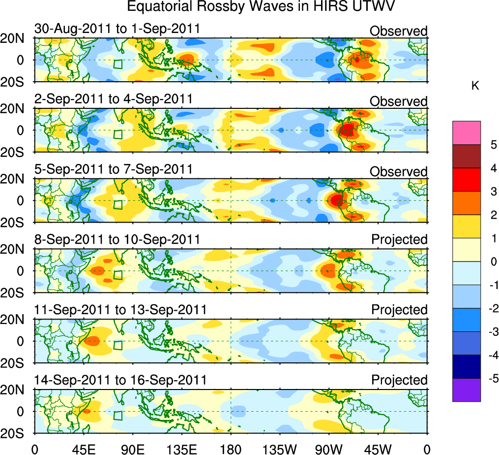 To identify tropical waves in near real-time, the OLR and UTWV data are filtered following Wheeler & Weickmann (2001 MWR). The daily anomalies are calculated using the first 3 harmonics of the seasonal cycle for 1979–2009. Missing values are then filled using linear interpolation in space and time. The most recent 365 days of anomalies are padded with 659 days of zeroes, and the result is filtered for each wave type.