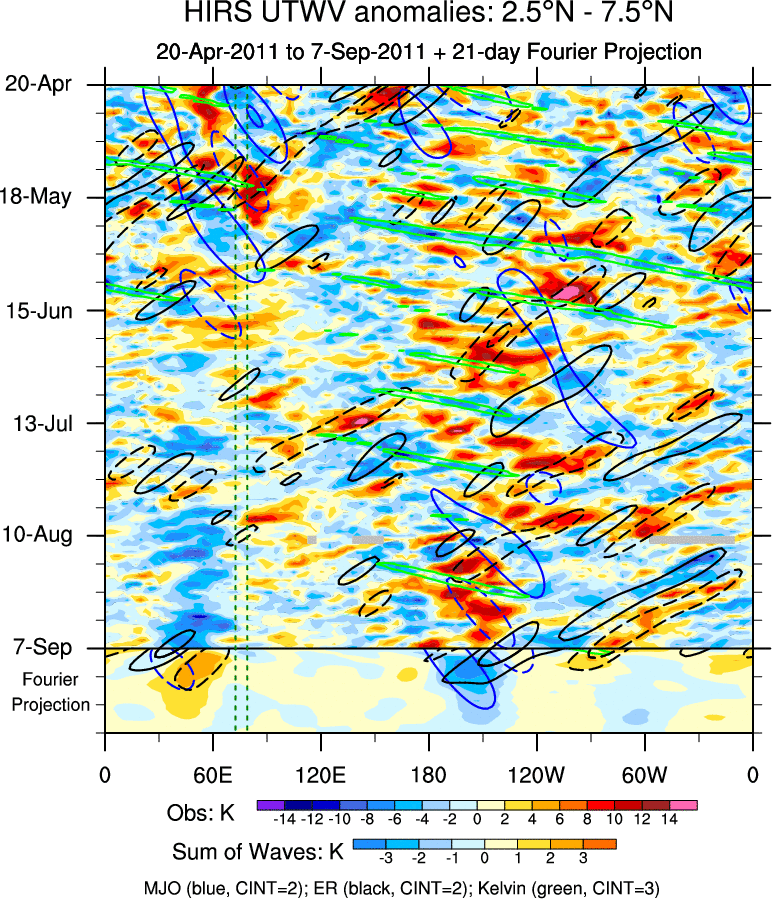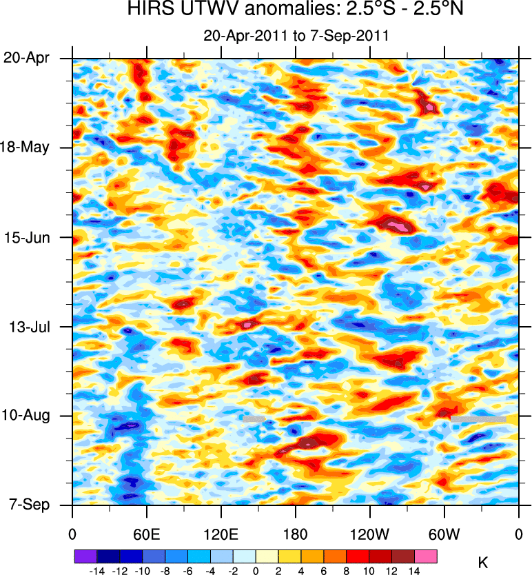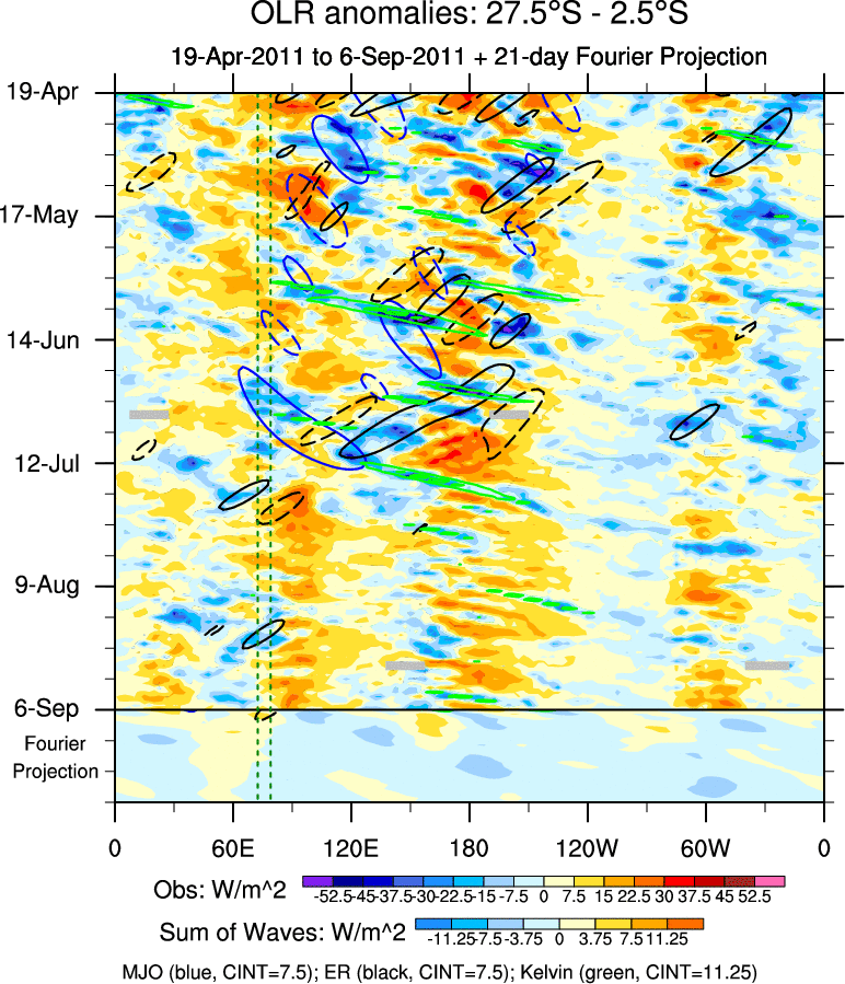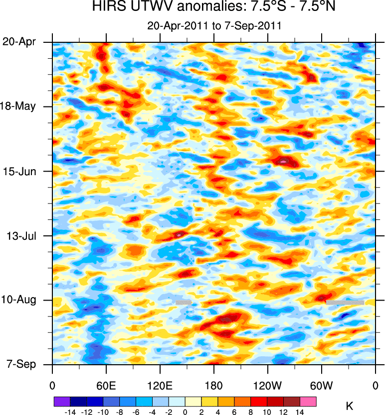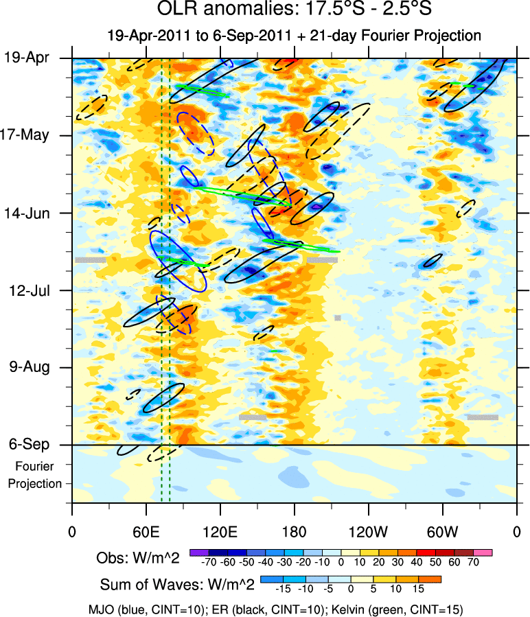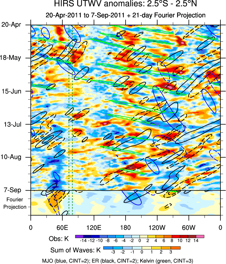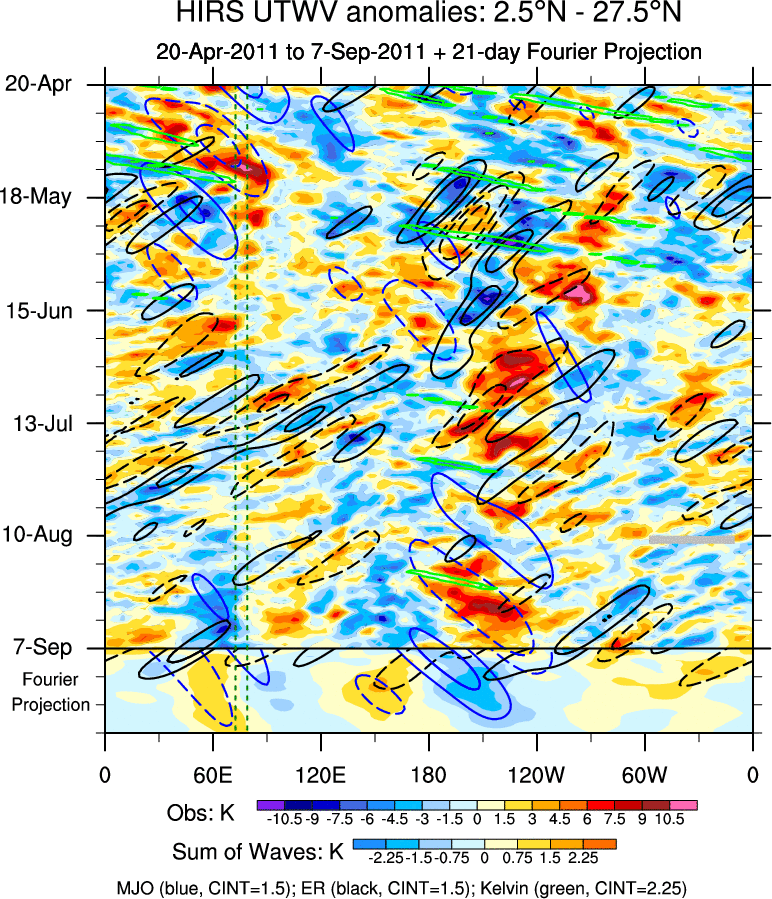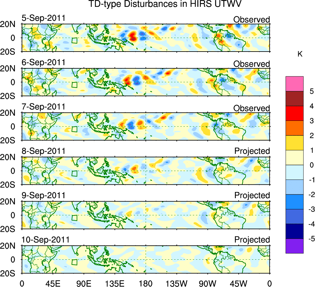 To identify tropical waves in near real-time, the OLR and UTWV data are filtered following Wheeler & Weickmann (2001 MWR). The daily anomalies are calculated using the first 3 harmonics of the seasonal cycle for 1979–2009. Missing values are then filled using linear interpolation in space and time. The most recent 365 days of anomalies are padded with 659 days of zeroes, and the result is filtered for each wave type.