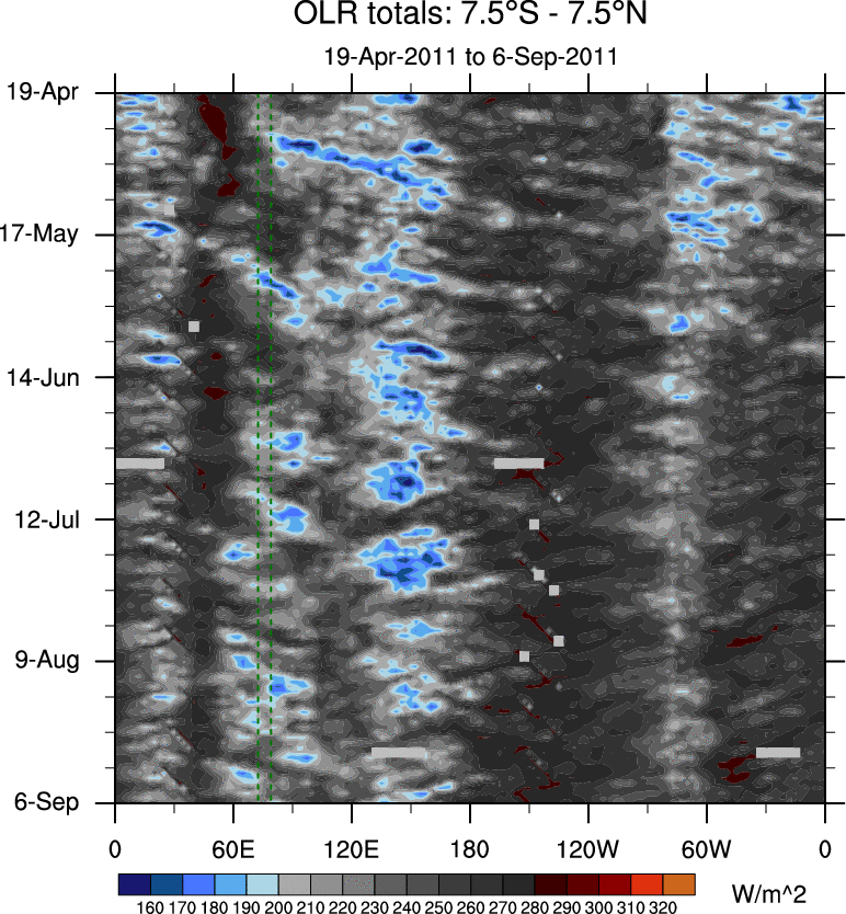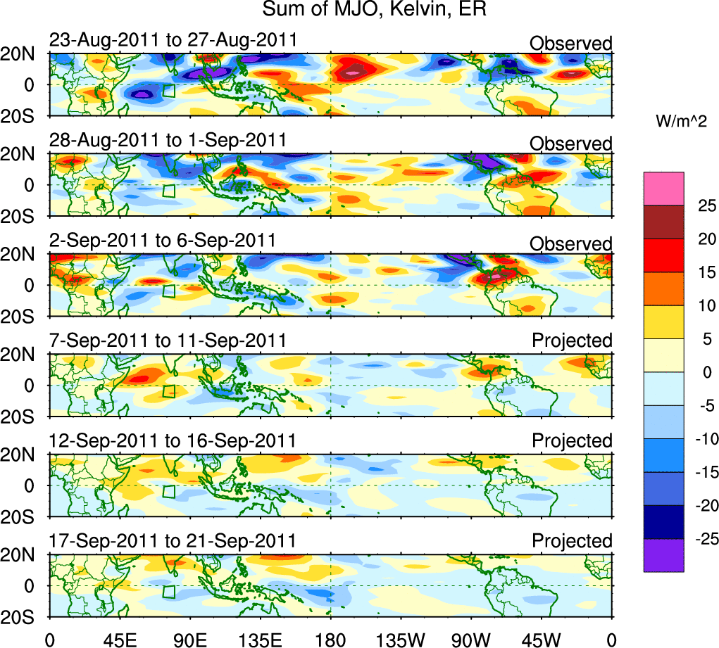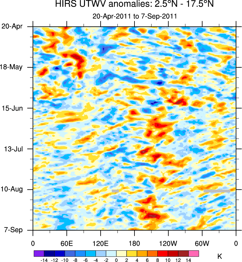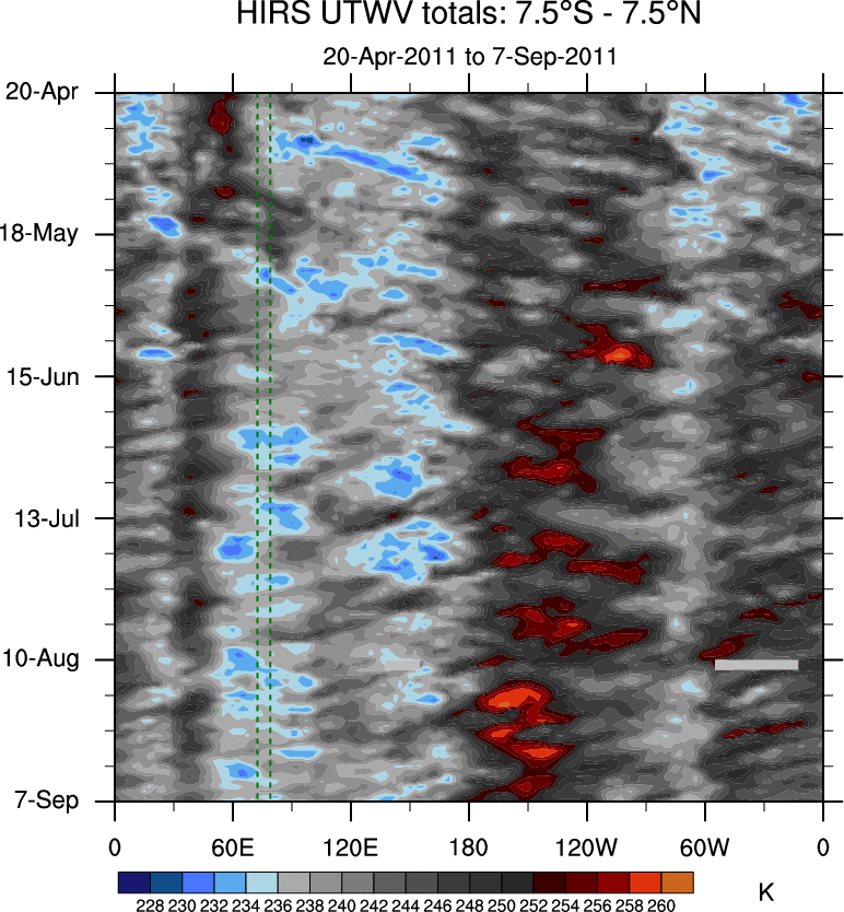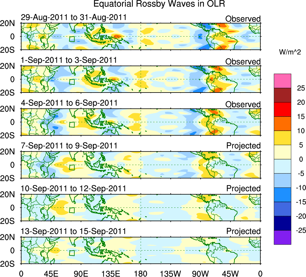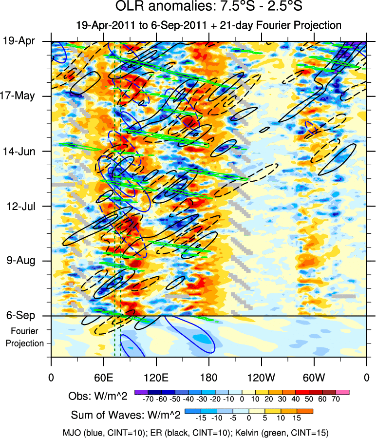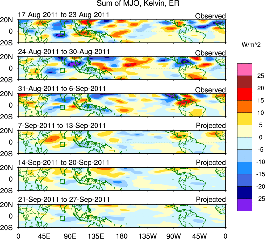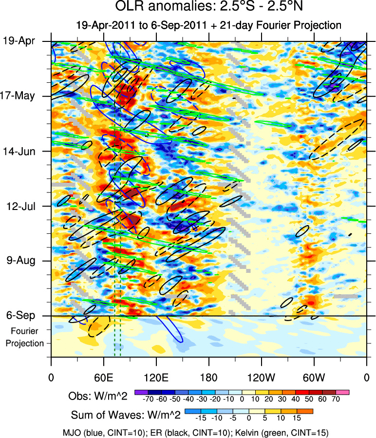 To identify tropical waves in near real-time, the OLR and UTWV data are filtered following Wheeler & Weickmann (2001 MWR). The daily anomalies are calculated using the first 3 harmonics of the seasonal cycle for 1979–2009. Missing values are then filled using linear interpolation in space and time. The most recent 365 days of anomalies are padded with 659 days of zeroes, and the result is filtered for each wave type.