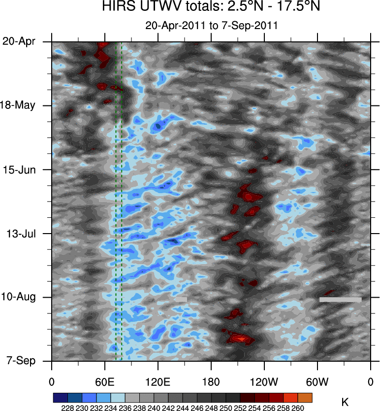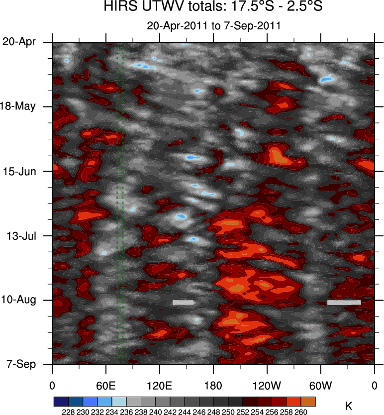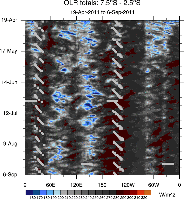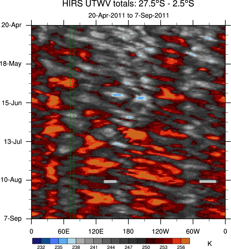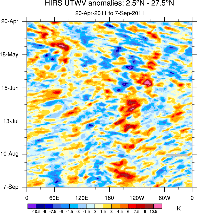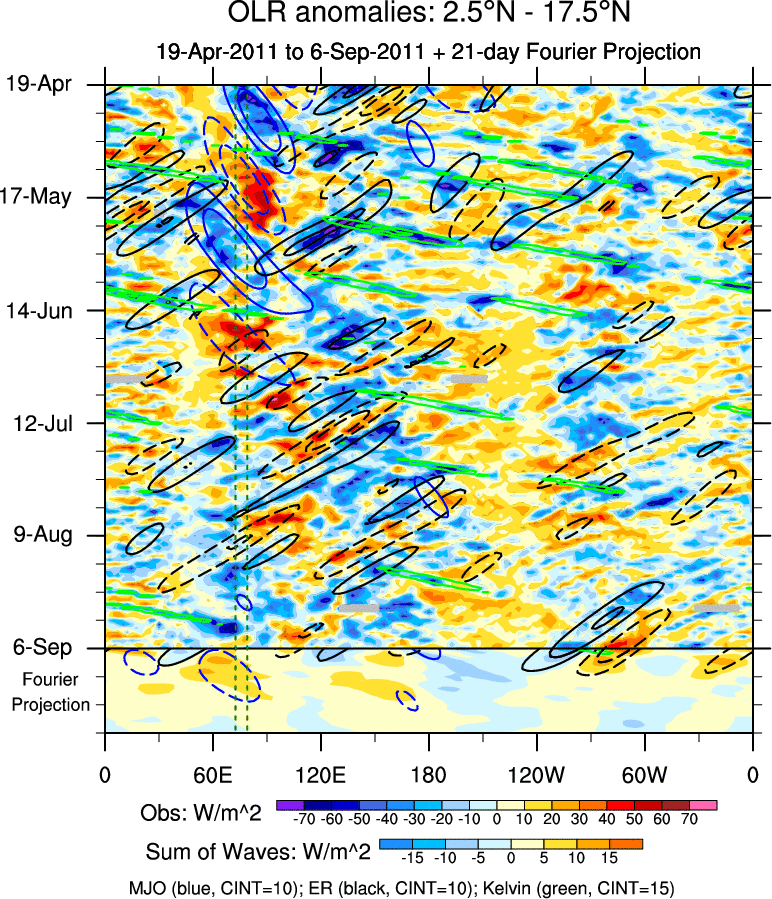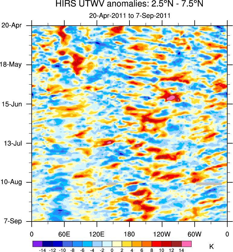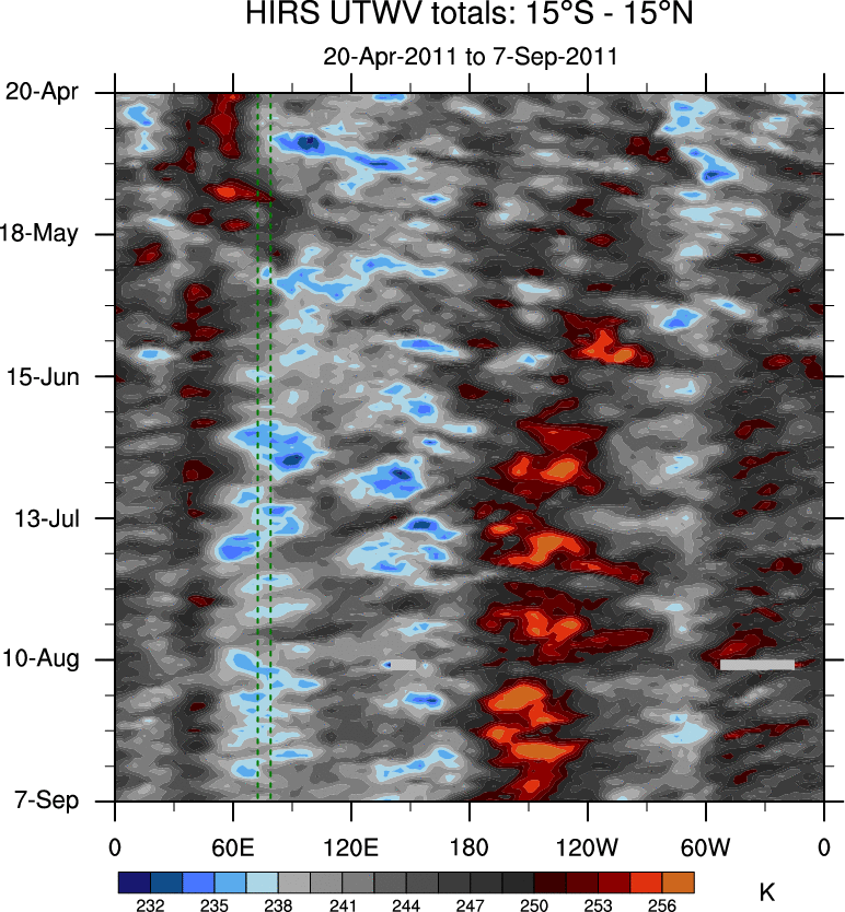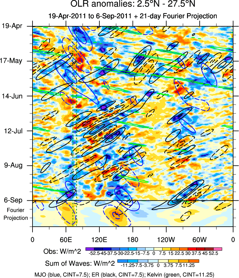 To identify tropical waves in near real-time, the OLR and UTWV data are filtered following Wheeler & Weickmann (2001 MWR). The daily anomalies are calculated using the first 3 harmonics of the seasonal cycle for 1979–2009. Missing values are then filled using linear interpolation in space and time. The most recent 365 days of anomalies are padded with 659 days of zeroes, and the result is filtered for each wave type.