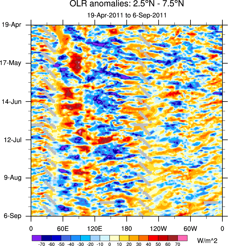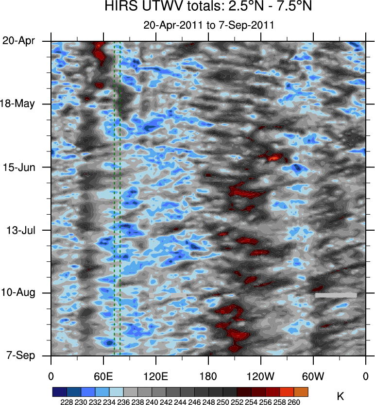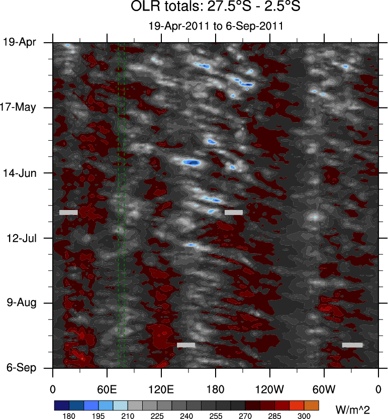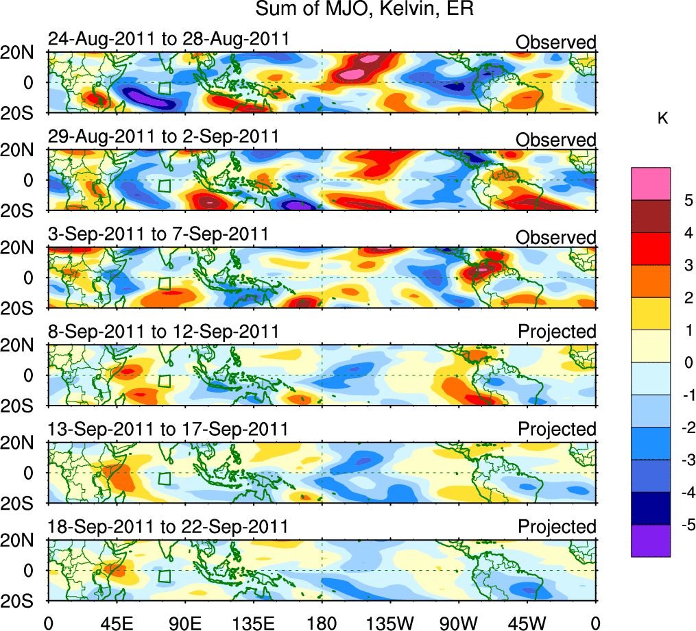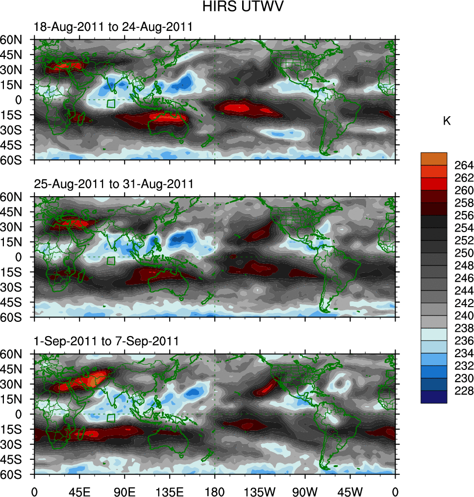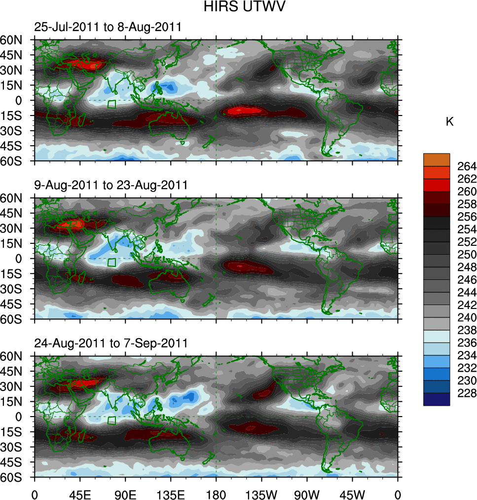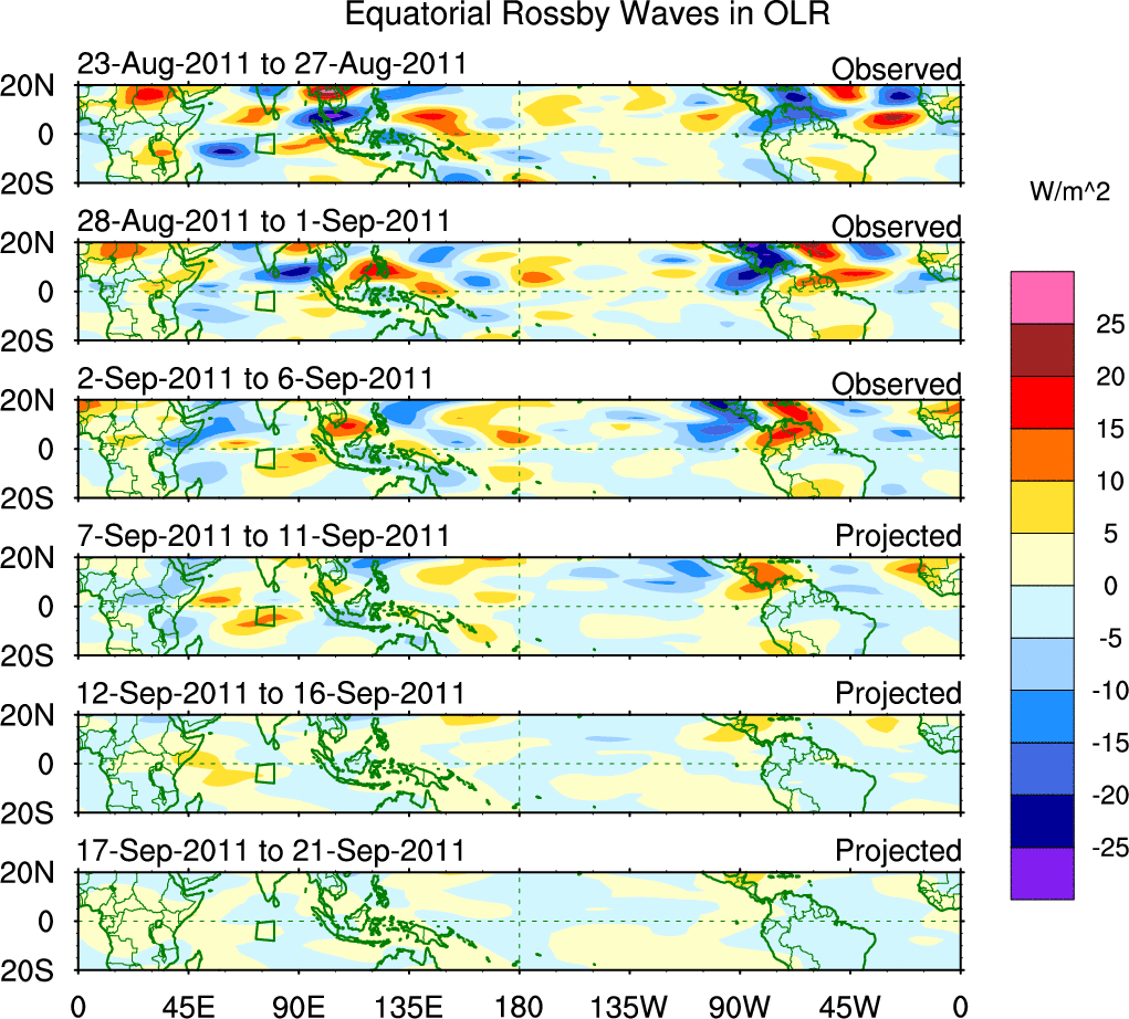 To identify tropical waves in near real-time, the OLR and UTWV data are filtered following Wheeler & Weickmann (2001 MWR). The daily anomalies are calculated using the first 3 harmonics of the seasonal cycle for 1979–2009. Missing values are then filled using linear interpolation in space and time. The most recent 365 days of anomalies are padded with 659 days of zeroes, and the result is filtered for each wave type.