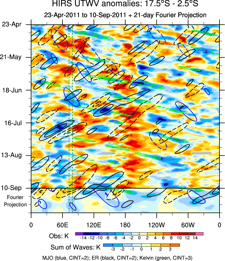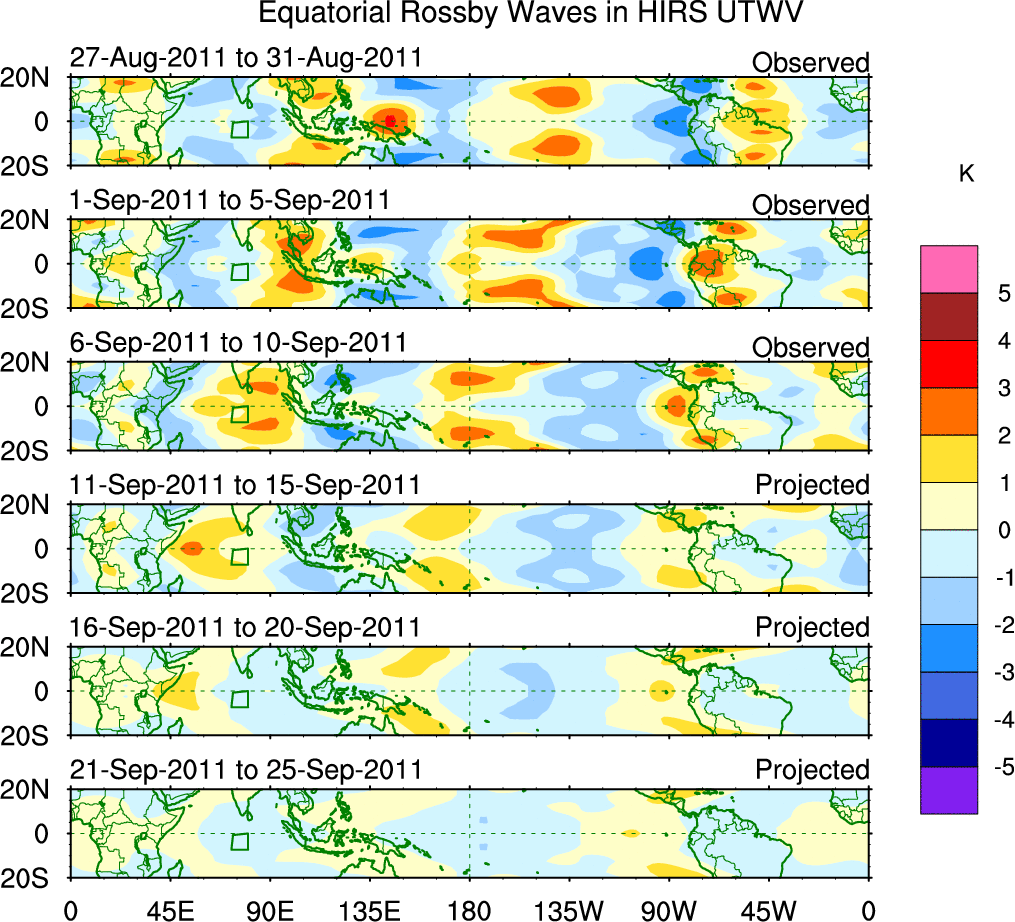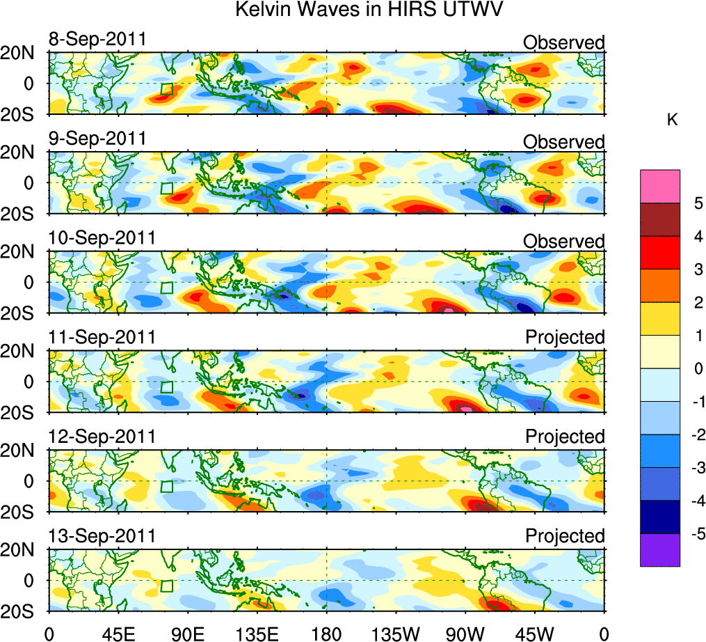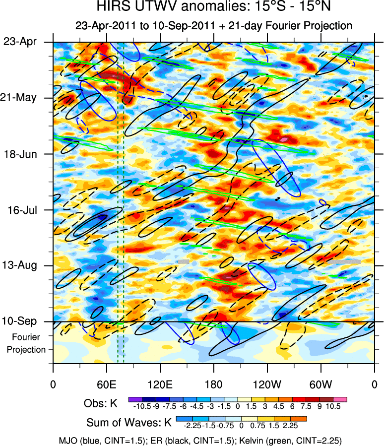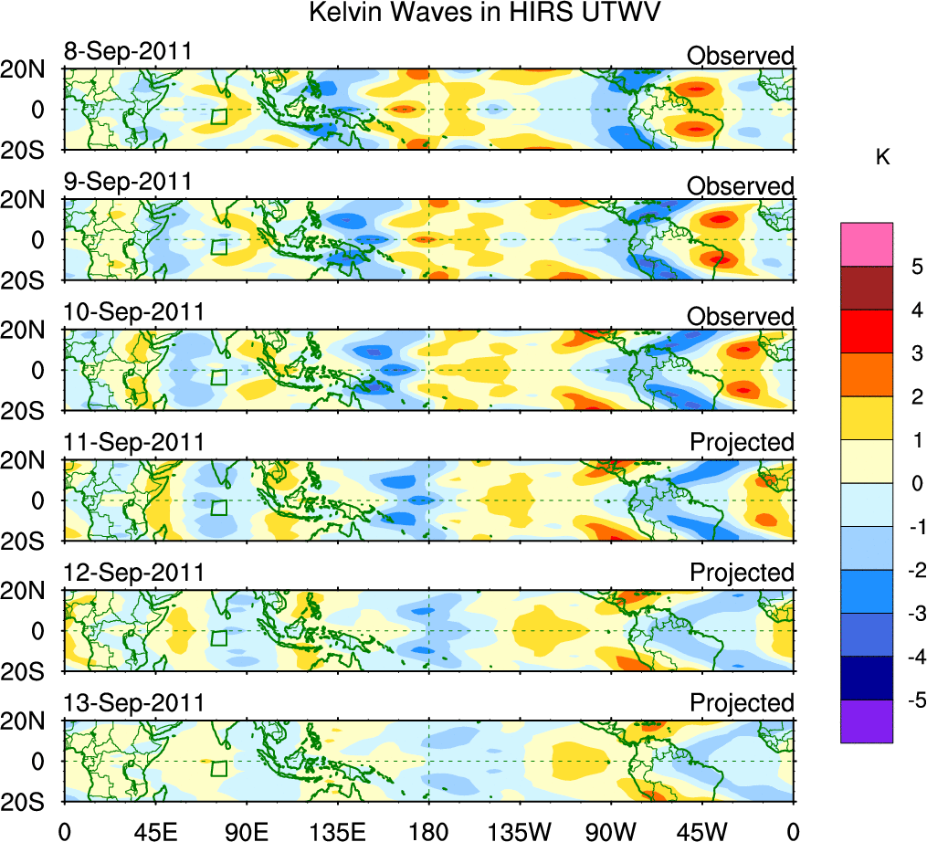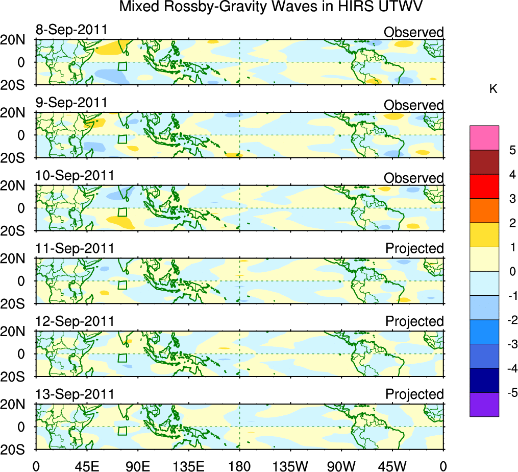 To identify tropical waves in near real-time, the OLR and UTWV data are filtered following Wheeler & Weickmann (2001 MWR). The daily anomalies are calculated using the first 3 harmonics of the seasonal cycle for 1979–2009. Missing values are then filled using linear interpolation in space and time. The most recent 365 days of anomalies are padded with 659 days of zeroes, and the result is filtered for each wave type.