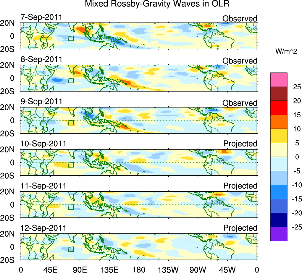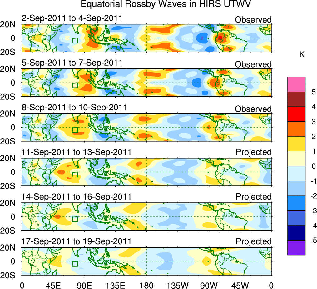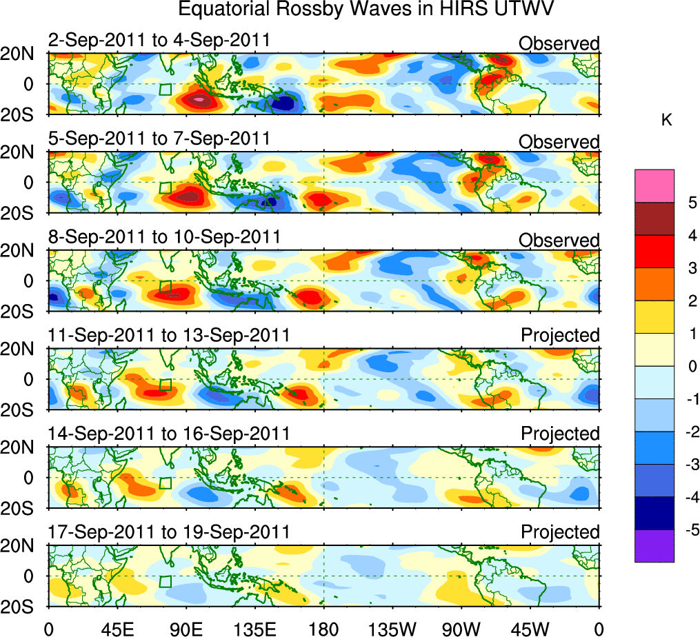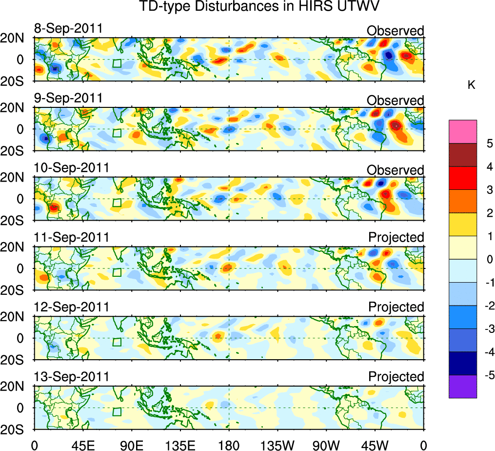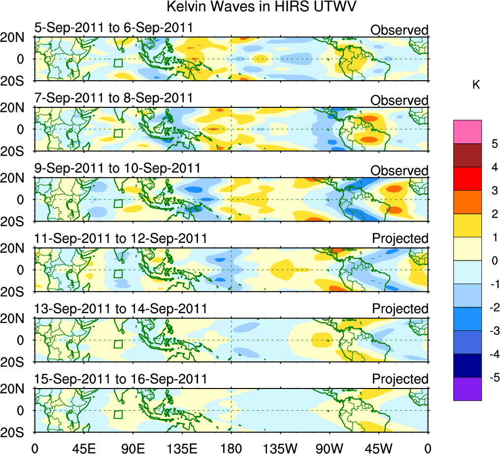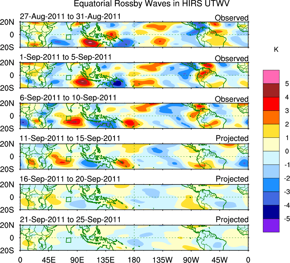 To identify tropical waves in near real-time, the OLR and UTWV data are filtered following Wheeler & Weickmann (2001 MWR). The daily anomalies are calculated using the first 3 harmonics of the seasonal cycle for 1979–2009. Missing values are then filled using linear interpolation in space and time. The most recent 365 days of anomalies are padded with 659 days of zeroes, and the result is filtered for each wave type.