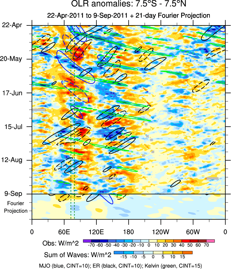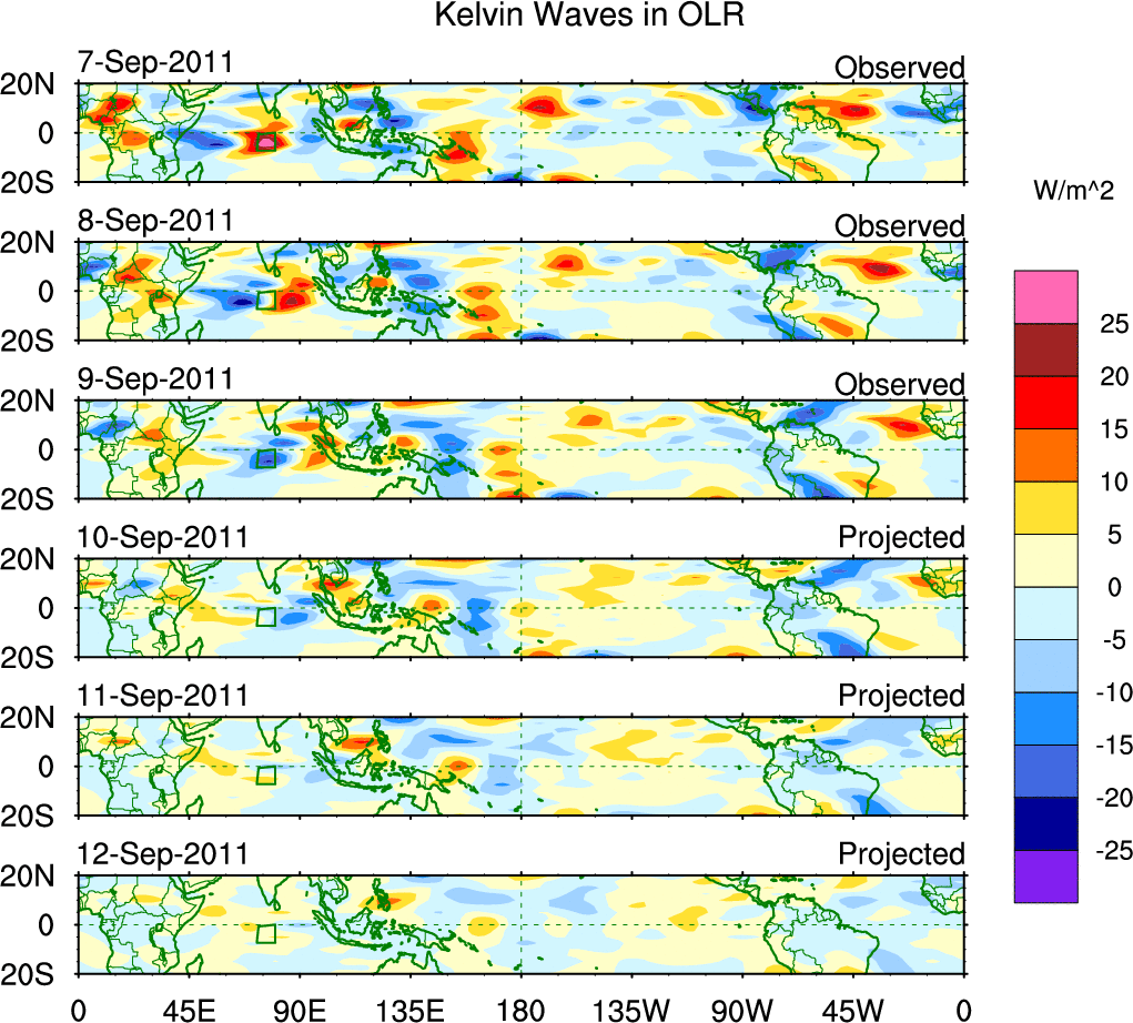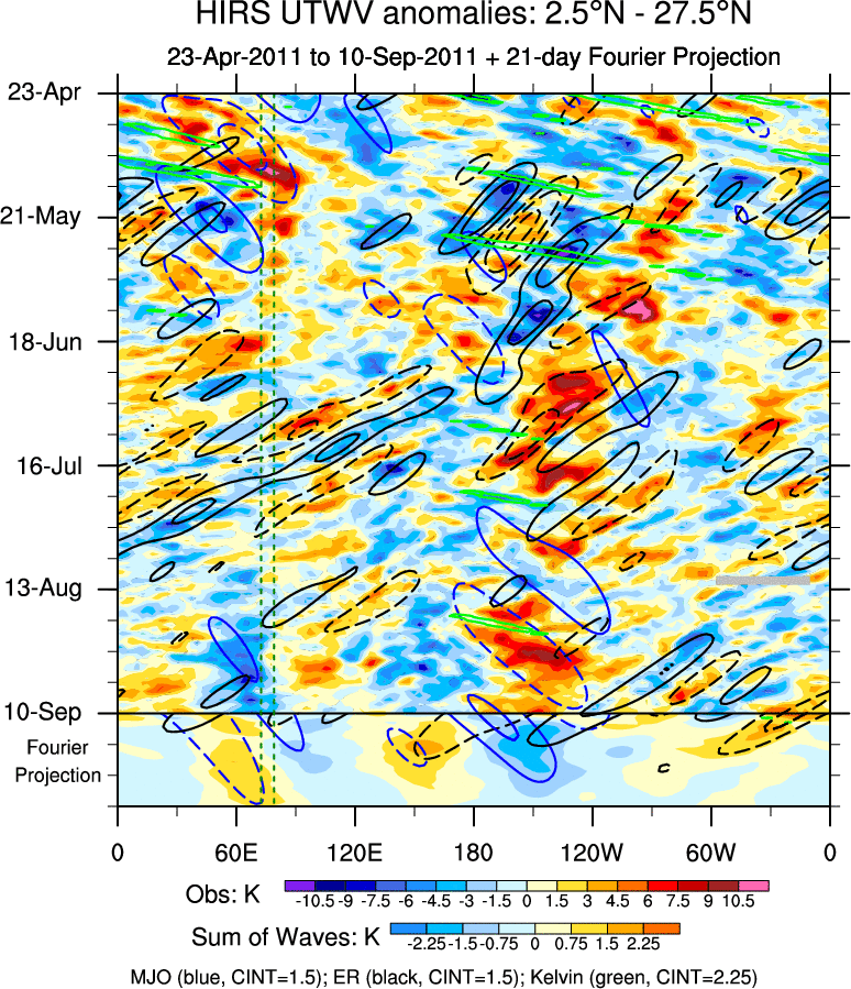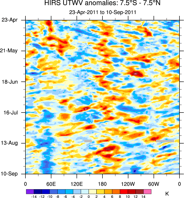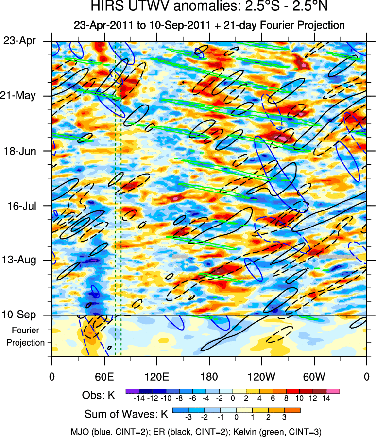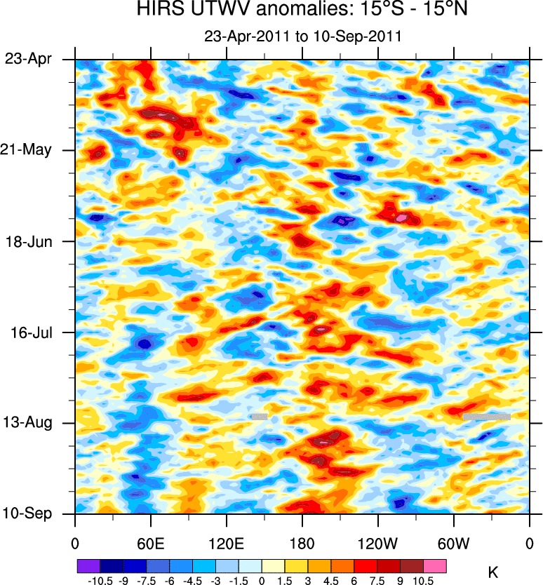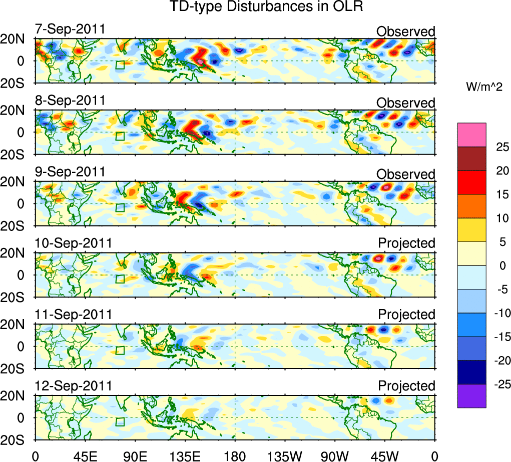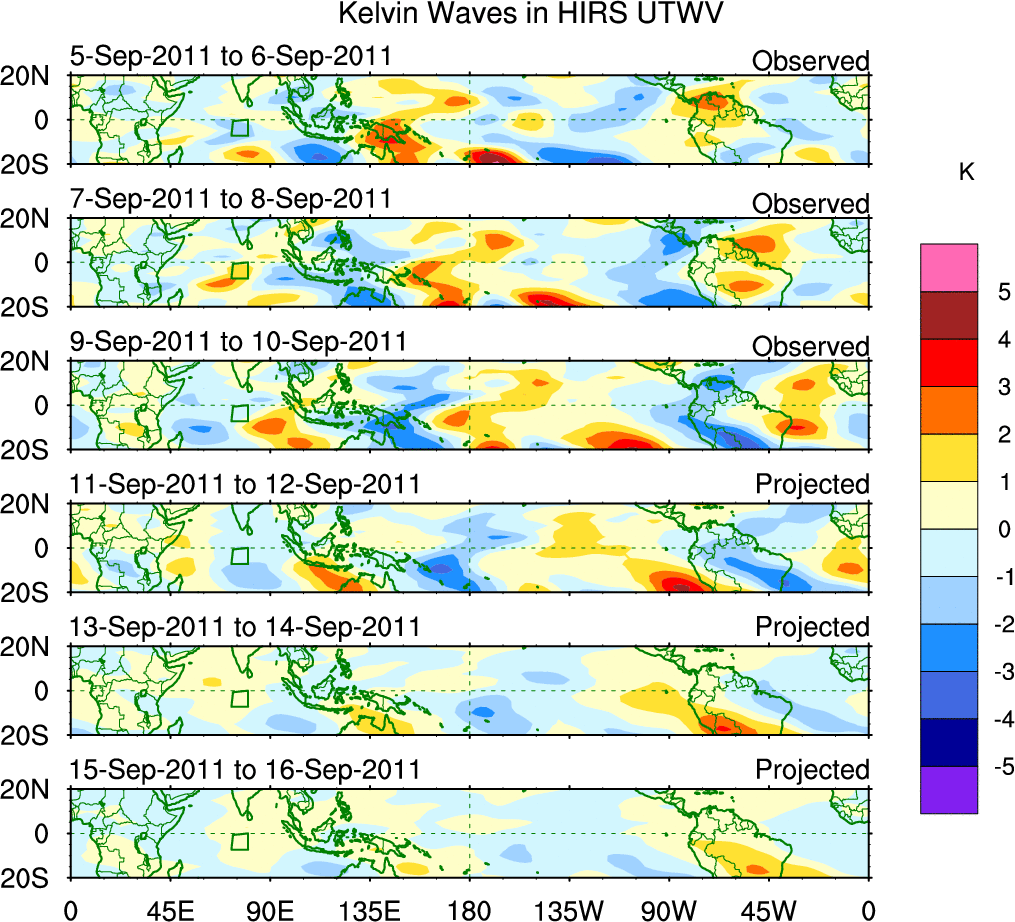 To identify tropical waves in near real-time, the OLR and UTWV data are filtered following Wheeler & Weickmann (2001 MWR). The daily anomalies are calculated using the first 3 harmonics of the seasonal cycle for 1979–2009. Missing values are then filled using linear interpolation in space and time. The most recent 365 days of anomalies are padded with 659 days of zeroes, and the result is filtered for each wave type.