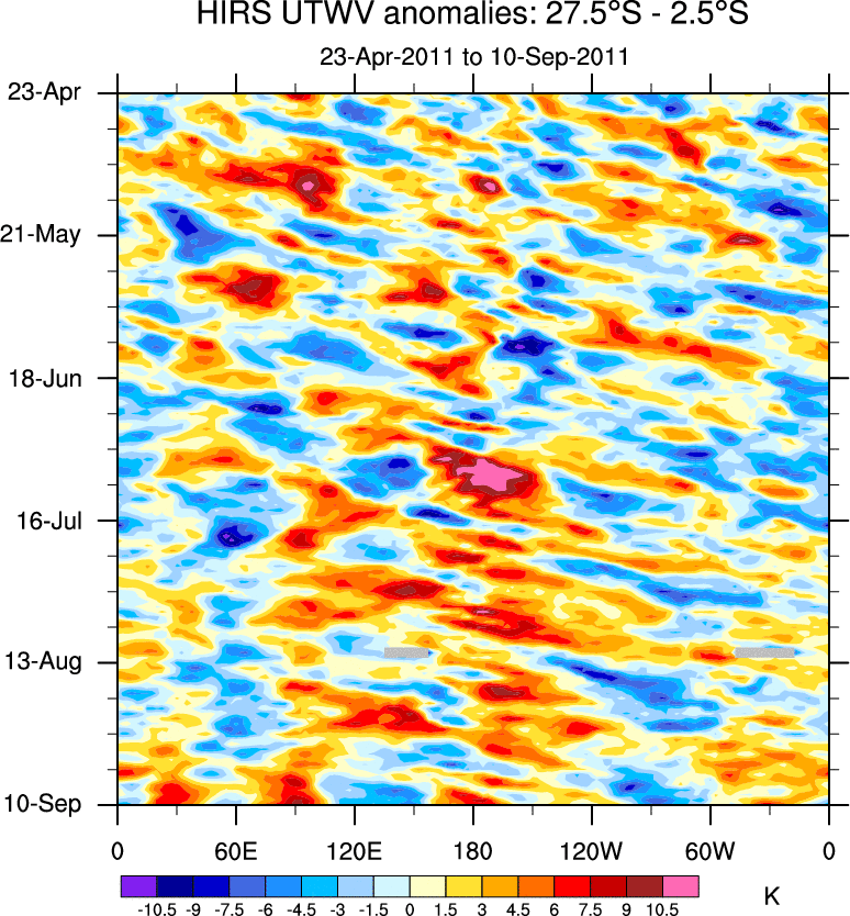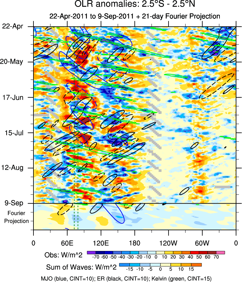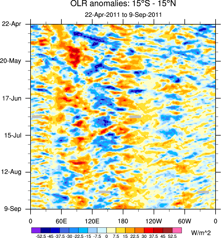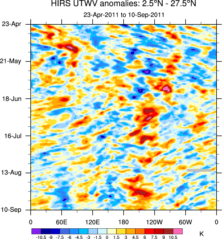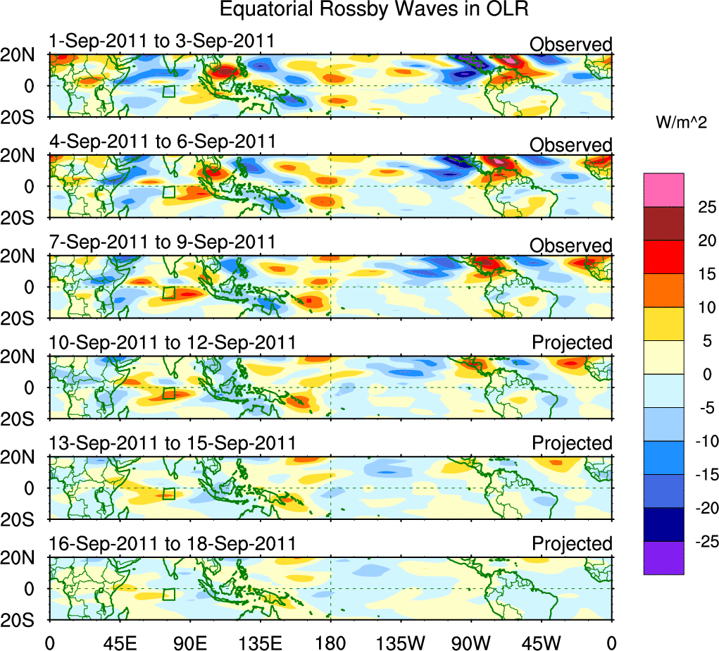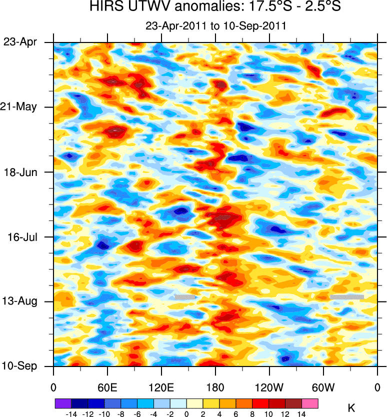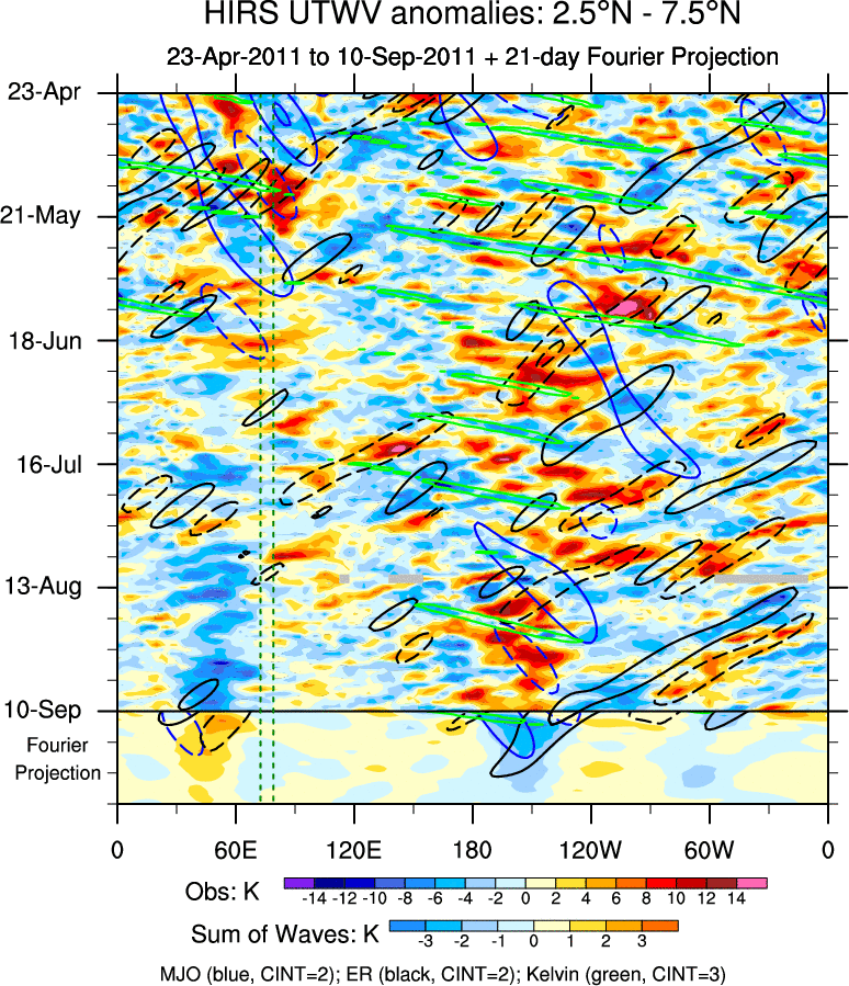 To identify tropical waves in near real-time, the OLR and UTWV data are filtered following Wheeler & Weickmann (2001 MWR). The daily anomalies are calculated using the first 3 harmonics of the seasonal cycle for 1979–2009. Missing values are then filled using linear interpolation in space and time. The most recent 365 days of anomalies are padded with 659 days of zeroes, and the result is filtered for each wave type.