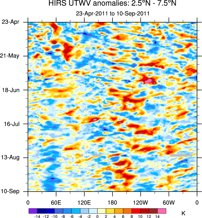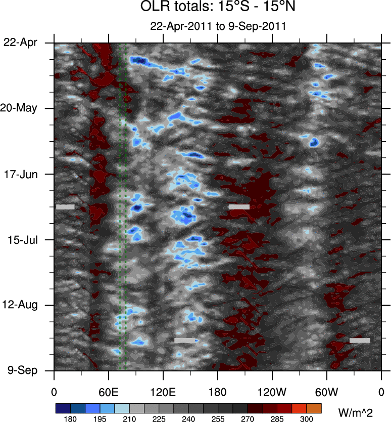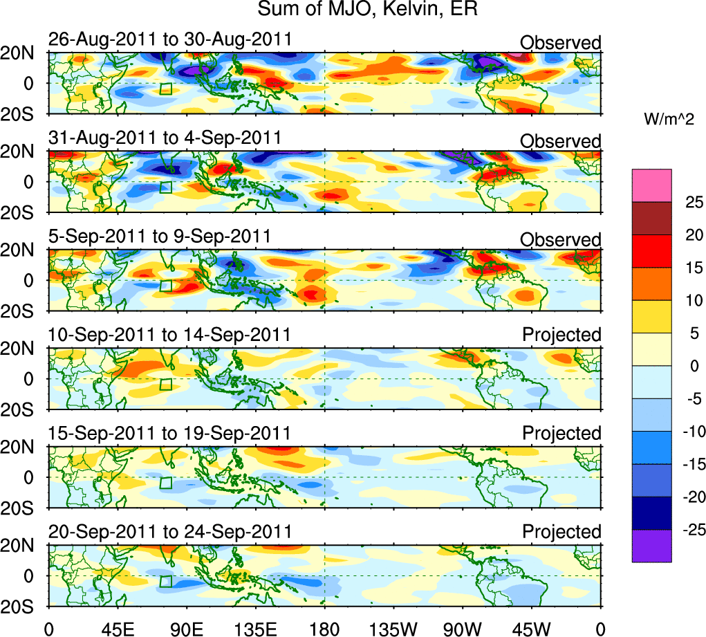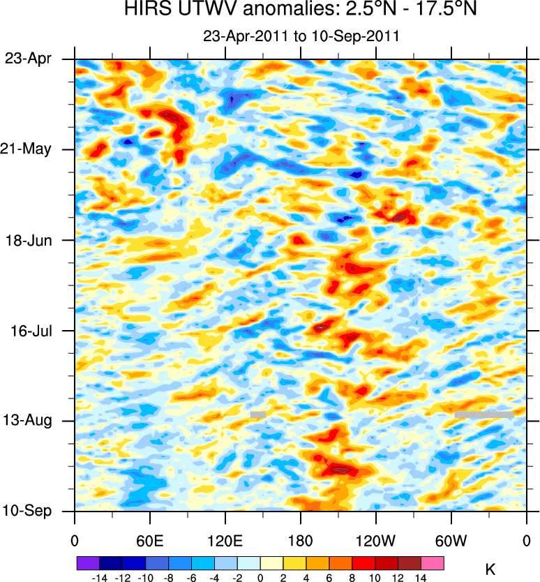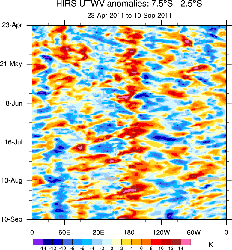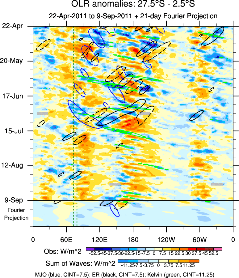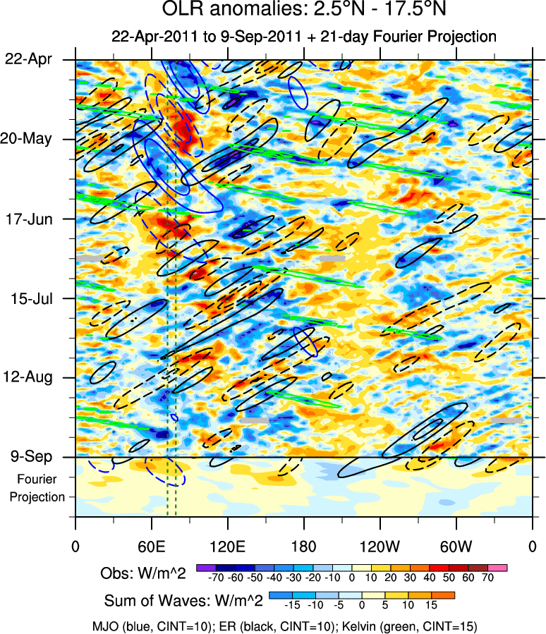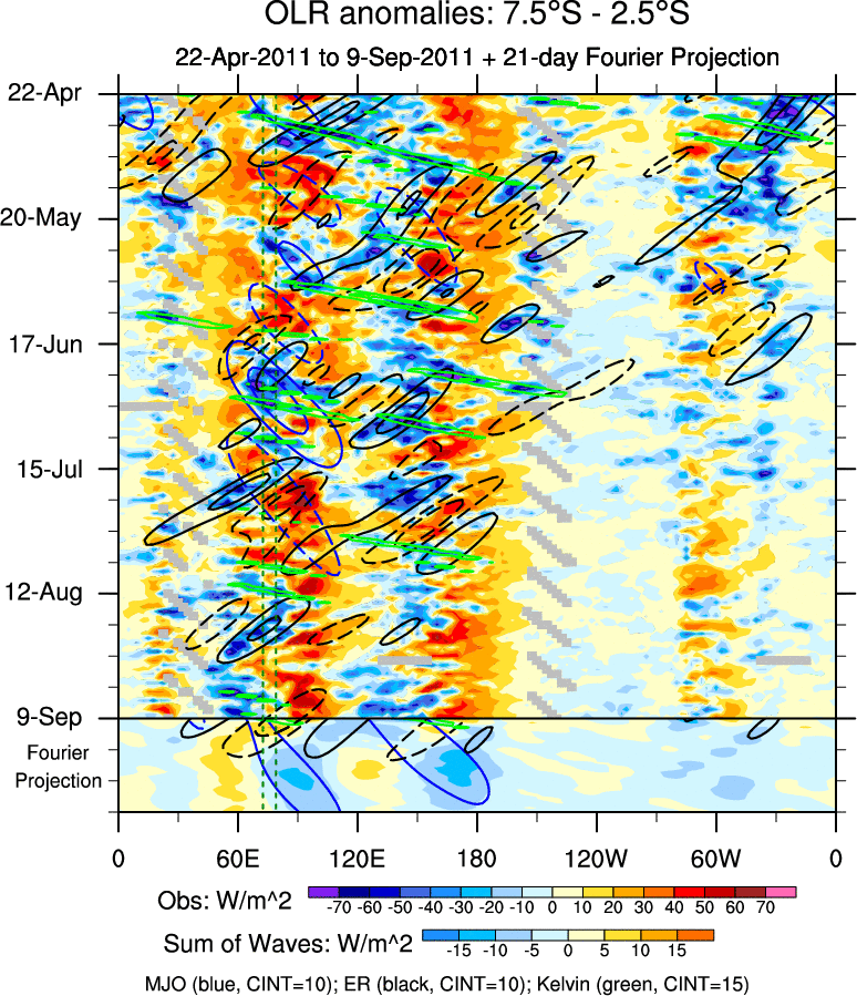 To identify tropical waves in near real-time, the OLR and UTWV data are filtered following Wheeler & Weickmann (2001 MWR). The daily anomalies are calculated using the first 3 harmonics of the seasonal cycle for 1979–2009. Missing values are then filled using linear interpolation in space and time. The most recent 365 days of anomalies are padded with 659 days of zeroes, and the result is filtered for each wave type.