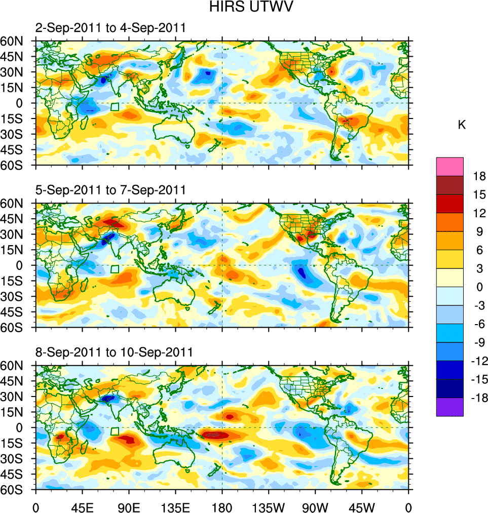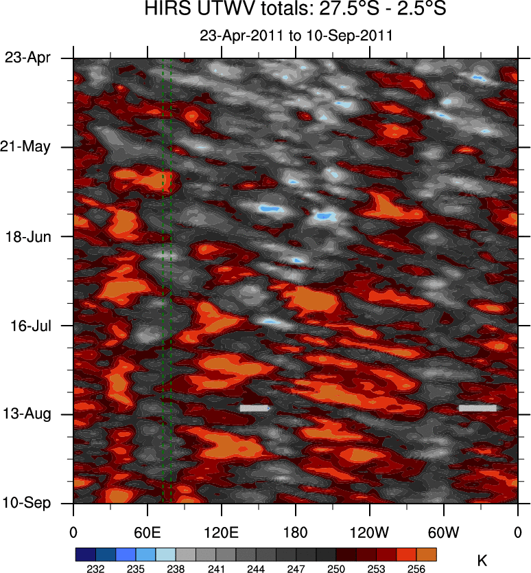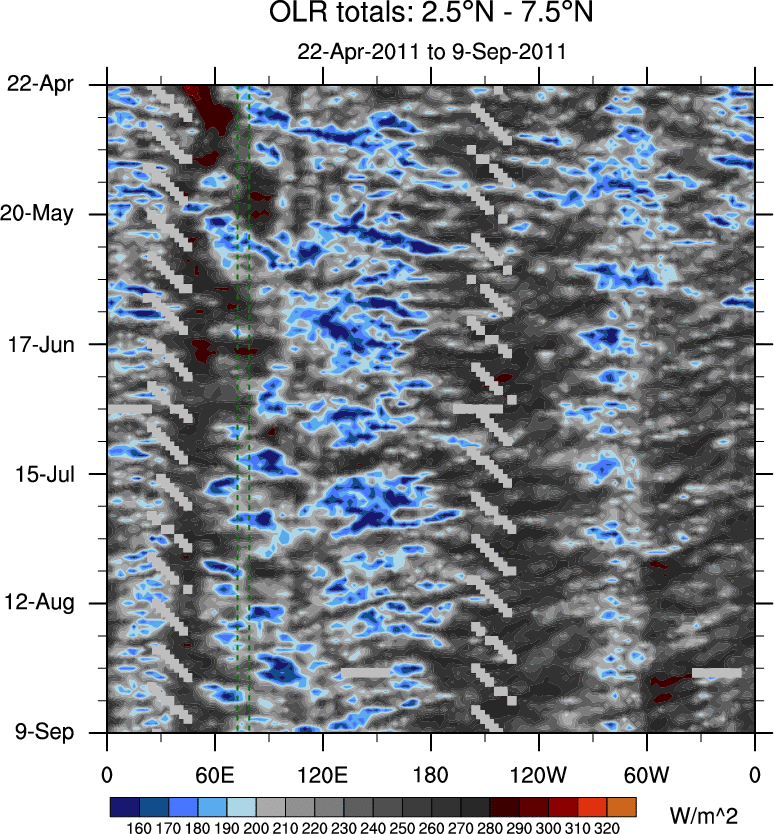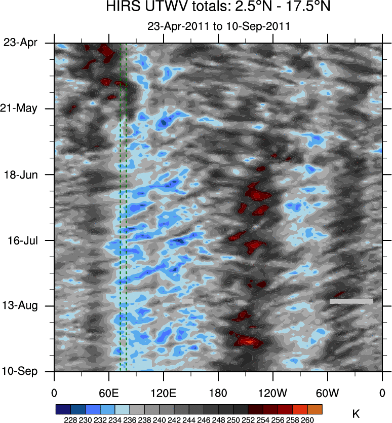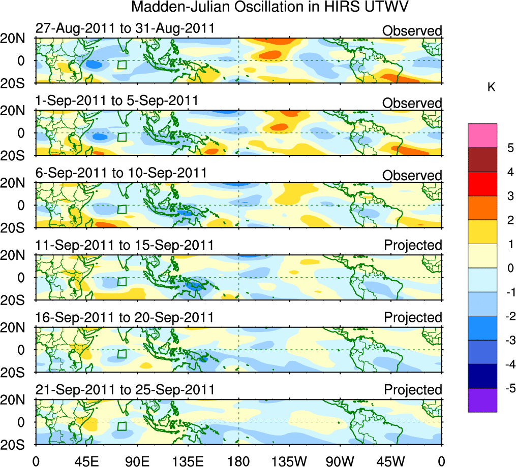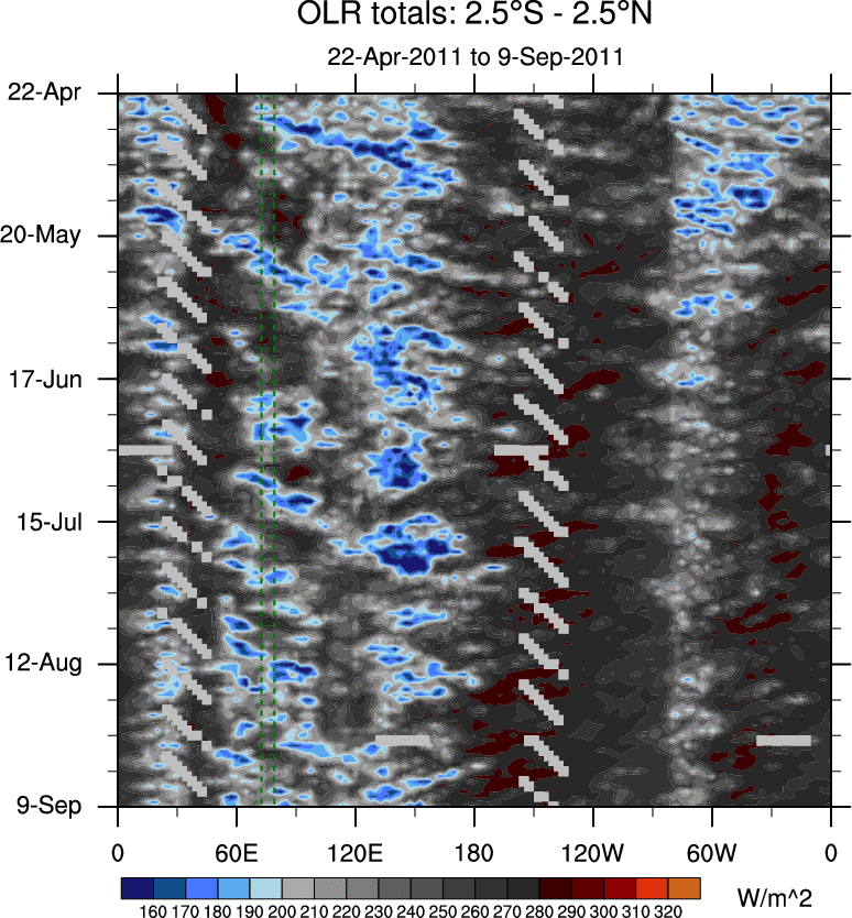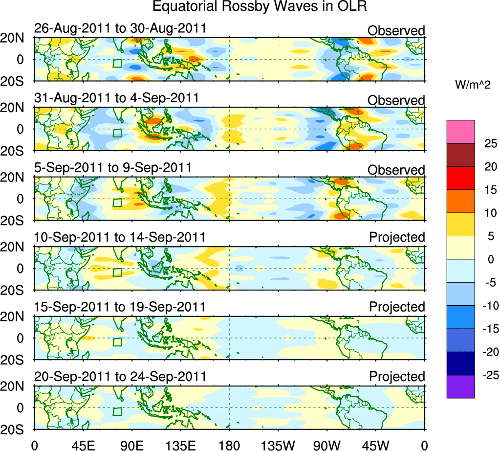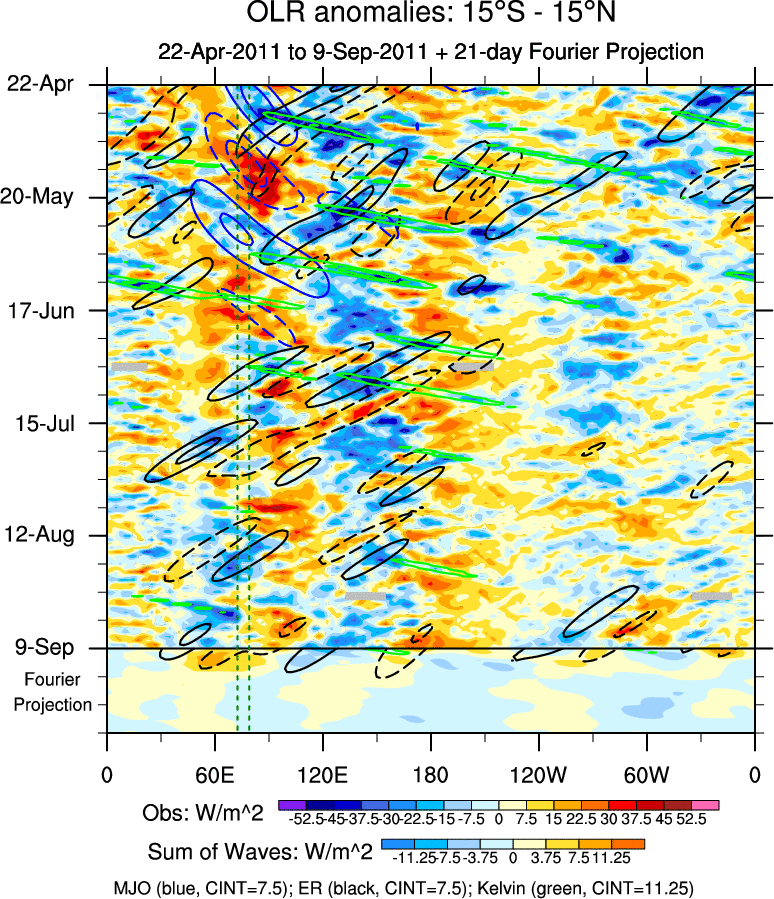 To identify tropical waves in near real-time, the OLR and UTWV data are filtered following Wheeler & Weickmann (2001 MWR). The daily anomalies are calculated using the first 3 harmonics of the seasonal cycle for 1979–2009. Missing values are then filled using linear interpolation in space and time. The most recent 365 days of anomalies are padded with 659 days of zeroes, and the result is filtered for each wave type.