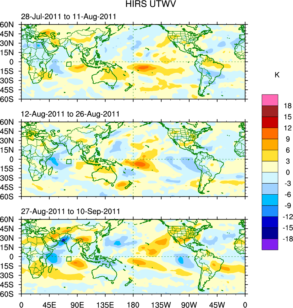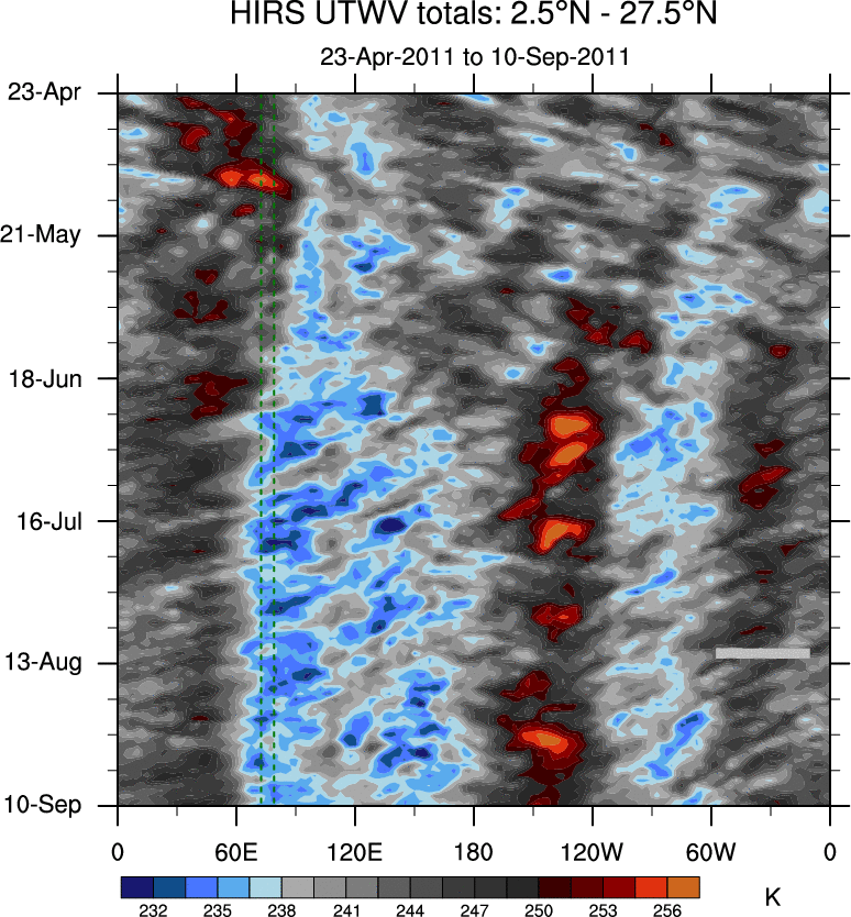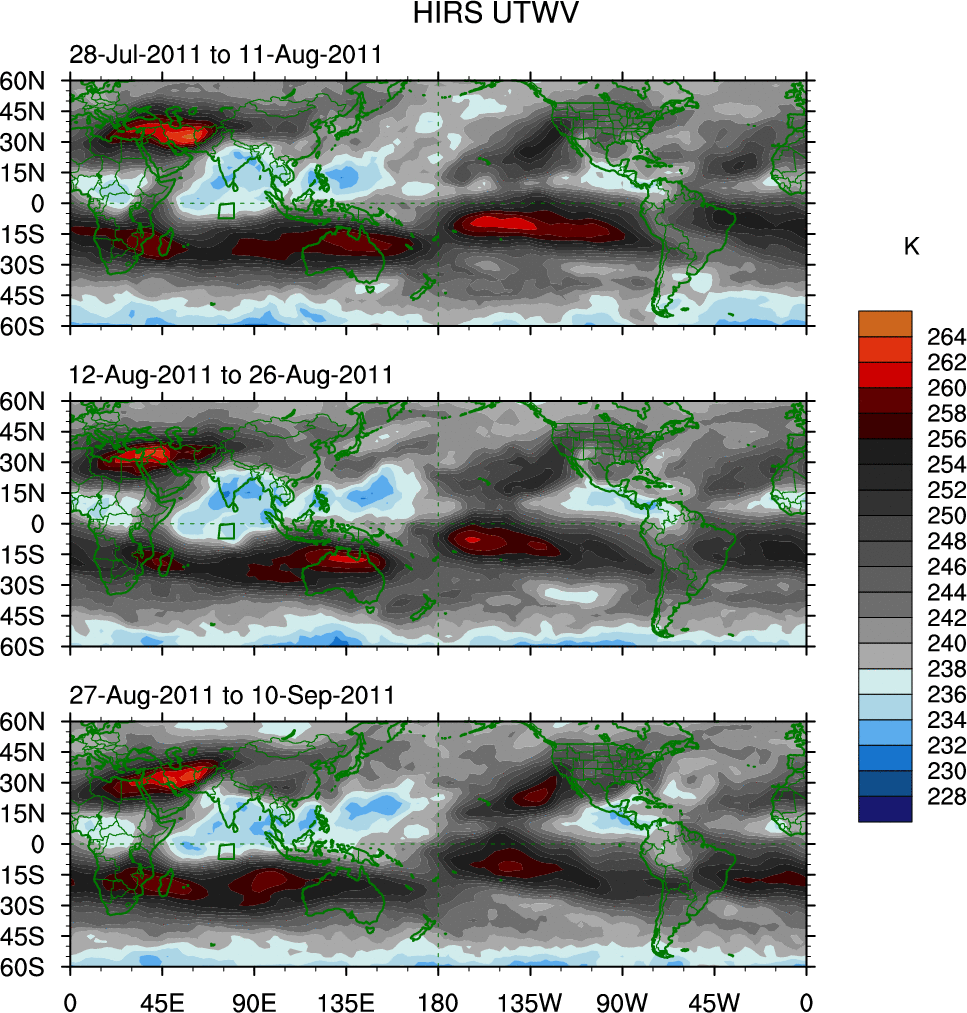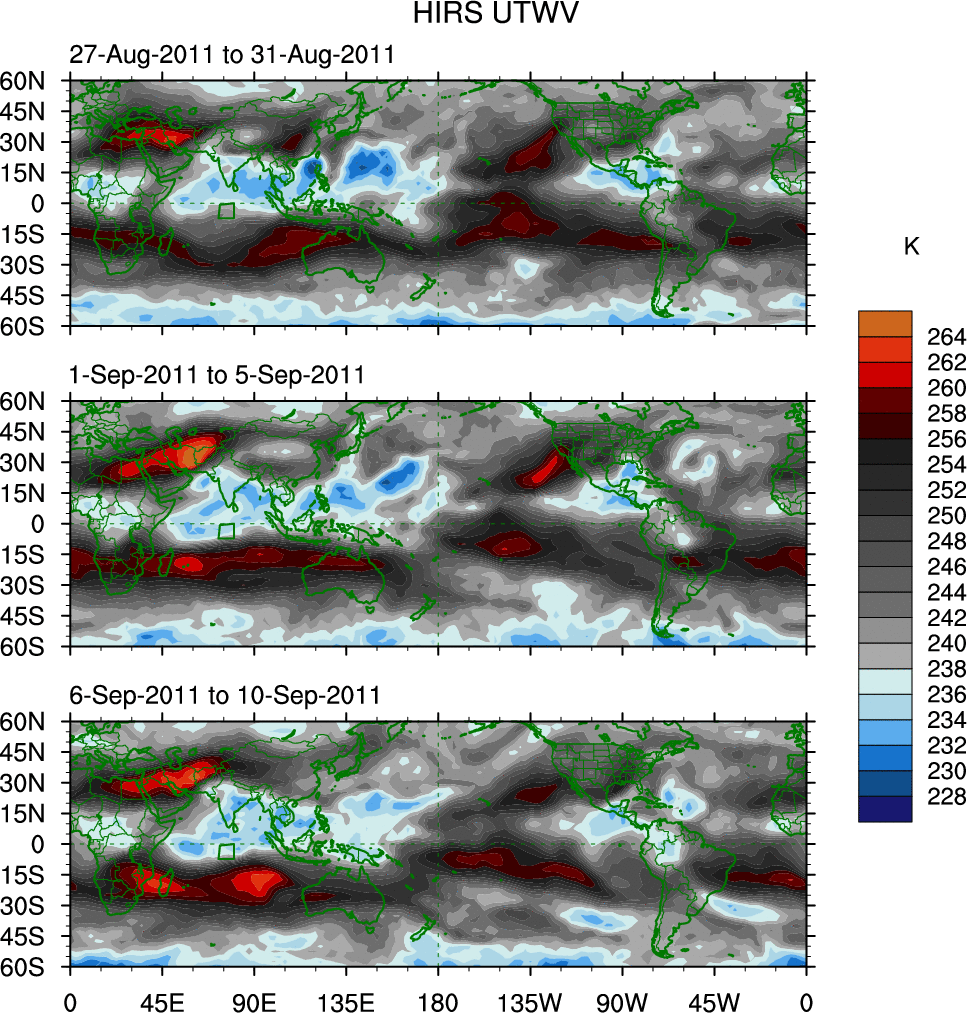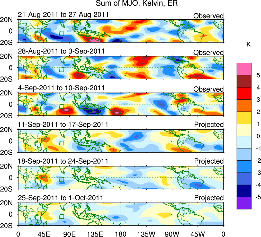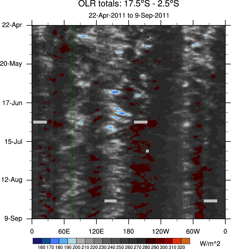 To identify tropical waves in near real-time, the OLR and UTWV data are filtered following Wheeler & Weickmann (2001 MWR). The daily anomalies are calculated using the first 3 harmonics of the seasonal cycle for 1979–2009. Missing values are then filled using linear interpolation in space and time. The most recent 365 days of anomalies are padded with 659 days of zeroes, and the result is filtered for each wave type.