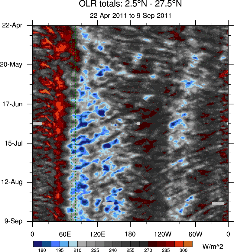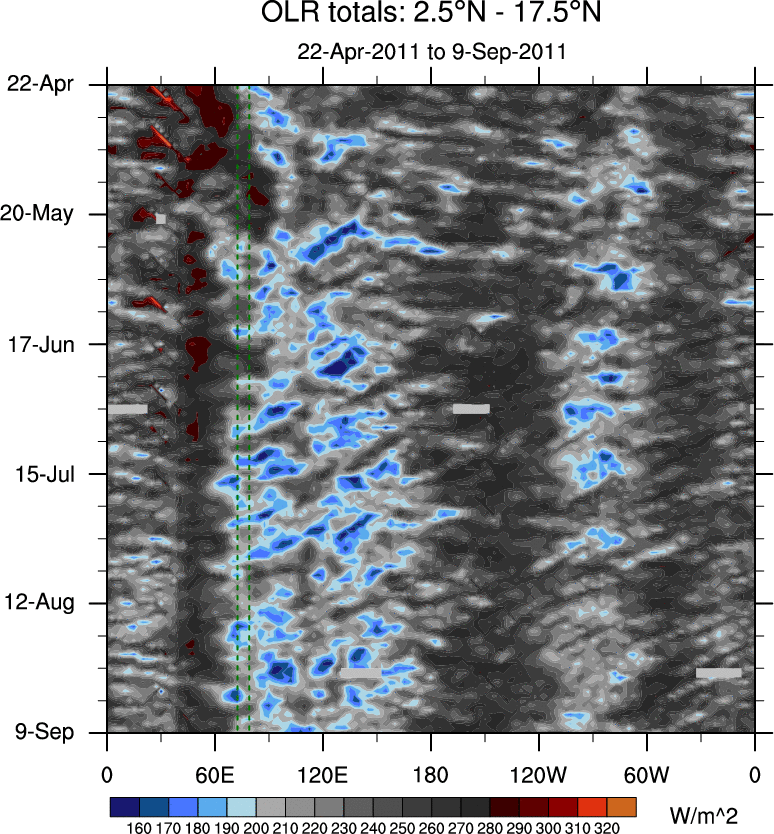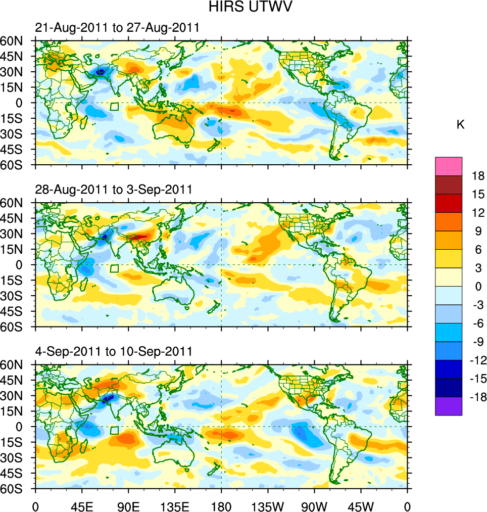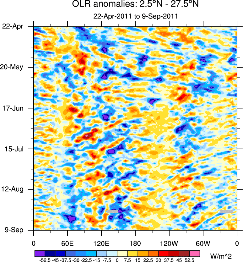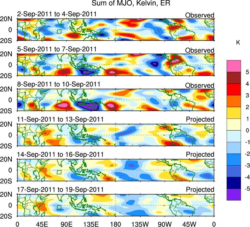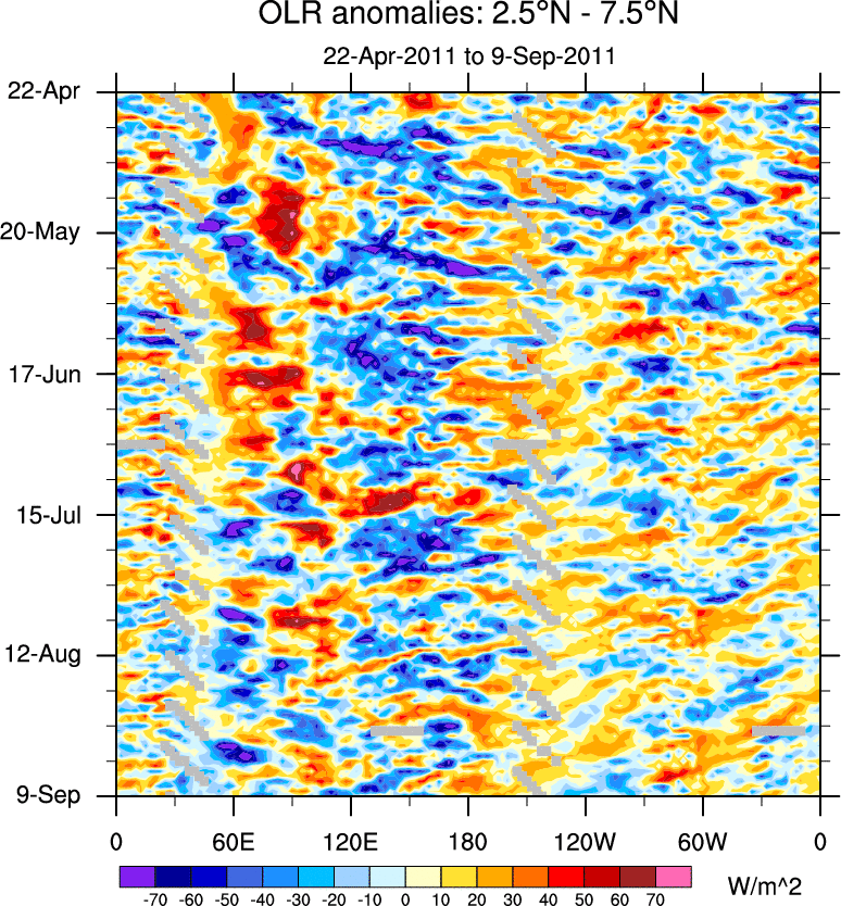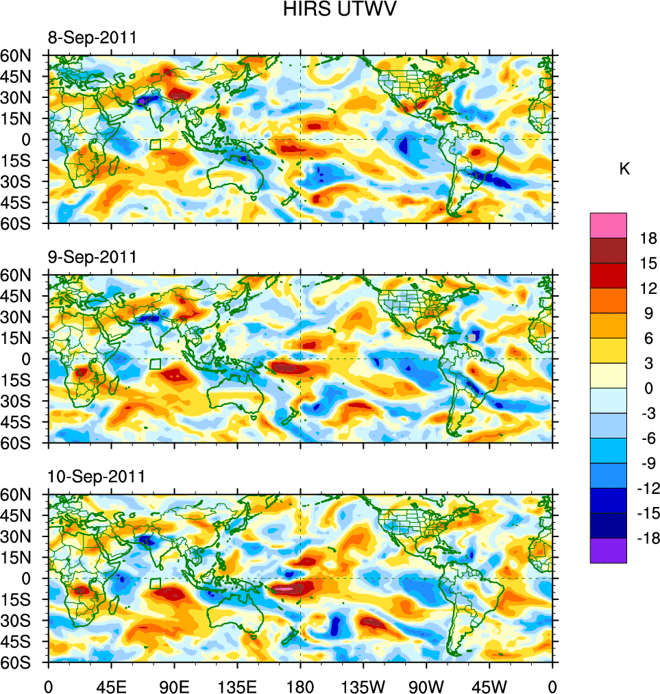 To identify tropical waves in near real-time, the OLR and UTWV data are filtered following Wheeler & Weickmann (2001 MWR). The daily anomalies are calculated using the first 3 harmonics of the seasonal cycle for 1979–2009. Missing values are then filled using linear interpolation in space and time. The most recent 365 days of anomalies are padded with 659 days of zeroes, and the result is filtered for each wave type.