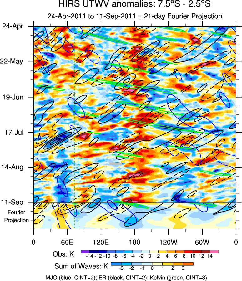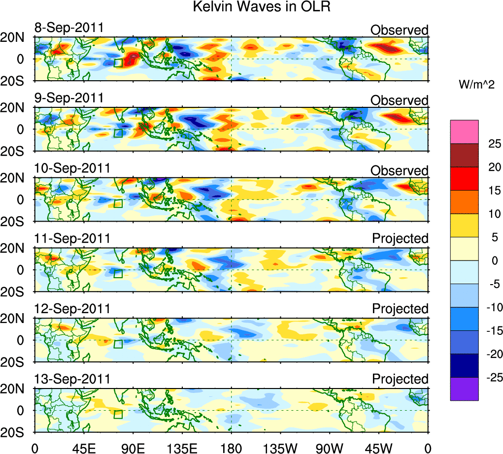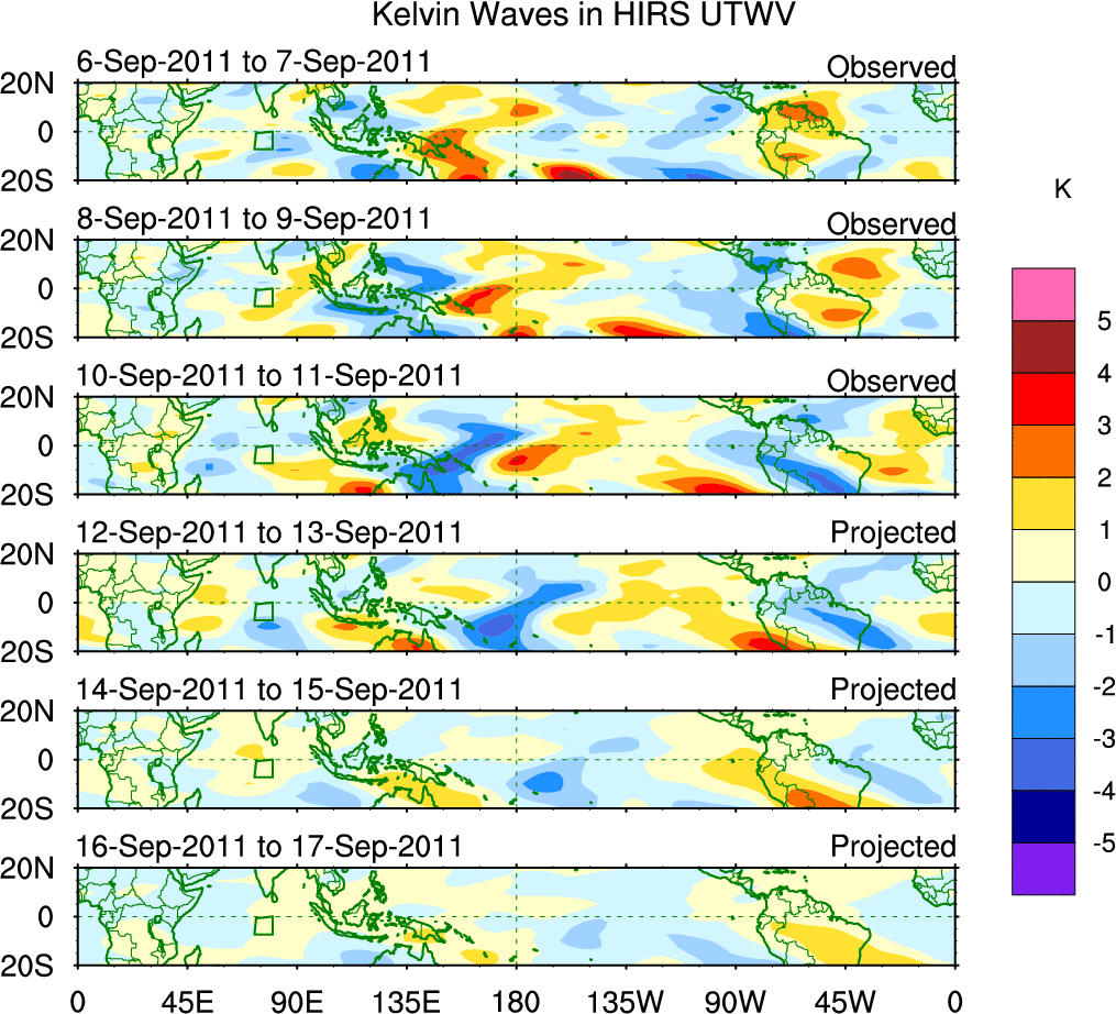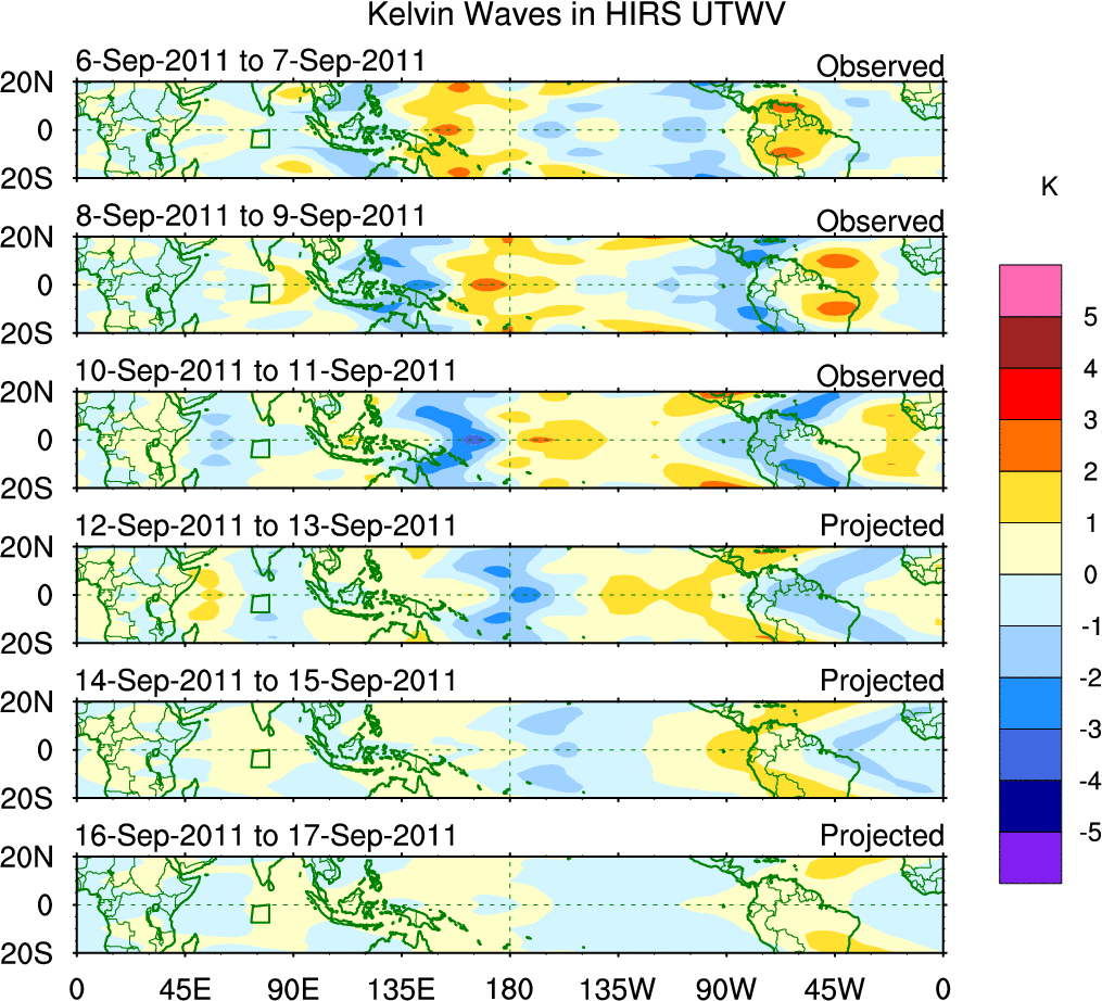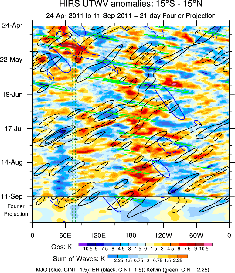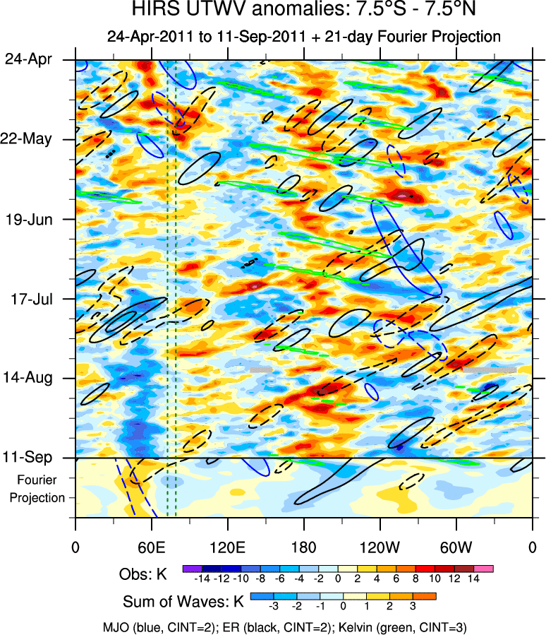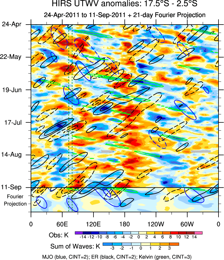 To identify tropical waves in near real-time, the OLR and UTWV data are filtered following Wheeler & Weickmann (2001 MWR). The daily anomalies are calculated using the first 3 harmonics of the seasonal cycle for 1979–2009. Missing values are then filled using linear interpolation in space and time. The most recent 365 days of anomalies are padded with 659 days of zeroes, and the result is filtered for each wave type.