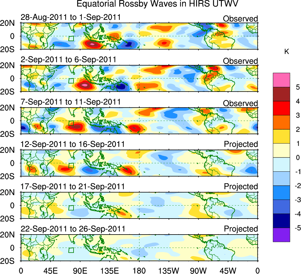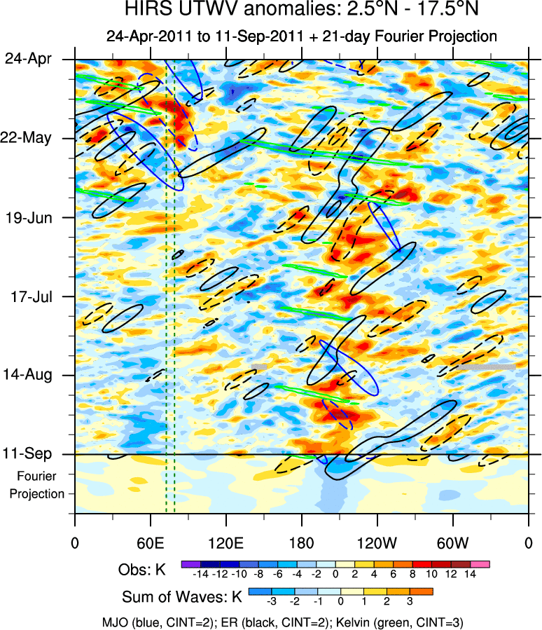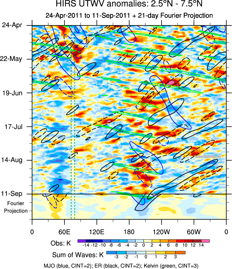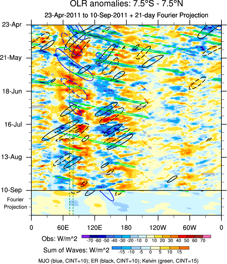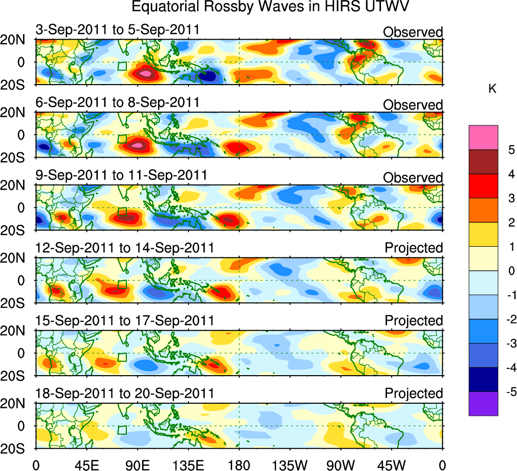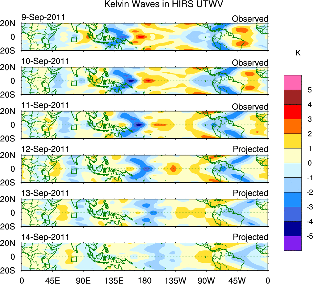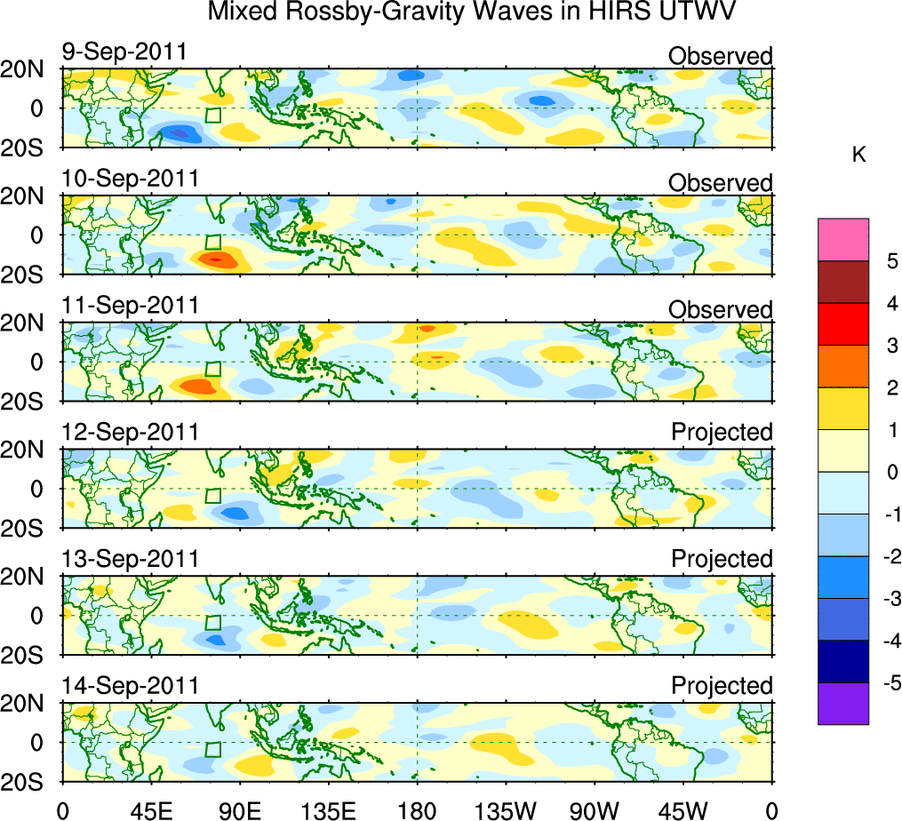To identify tropical waves in near real-time, the OLR and UTWV data are filtered following Wheeler & Weickmann (2001 MWR). The daily anomalies are calculated using the first 3 harmonics of the seasonal cycle for 1979–2009. Missing values are then filled using linear interpolation in space and time. The most recent 365 days of anomalies are padded with 659 days of zeroes, and the result is filtered for each wave type.