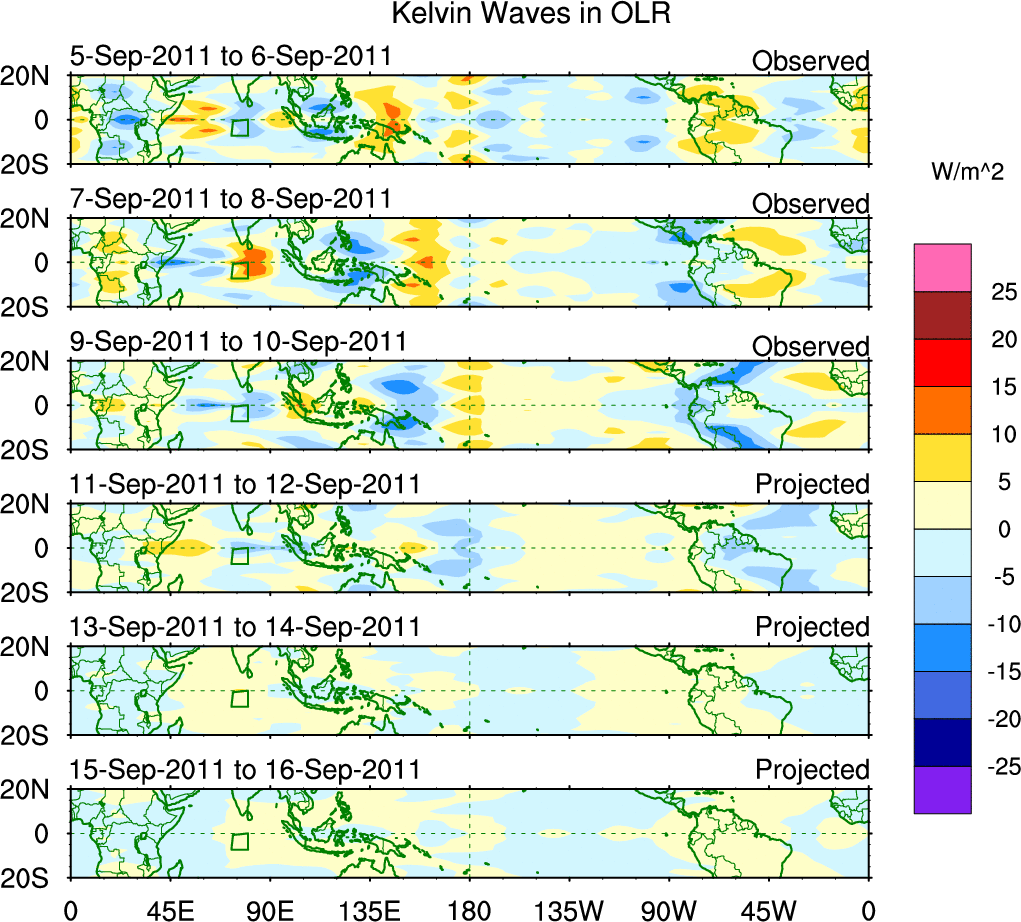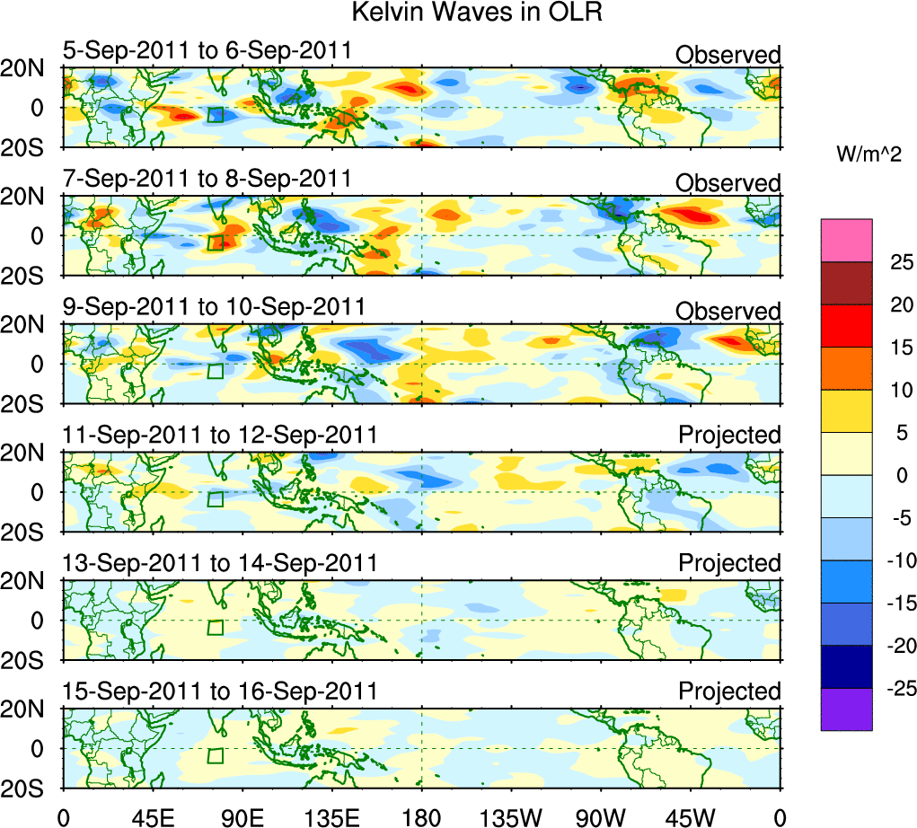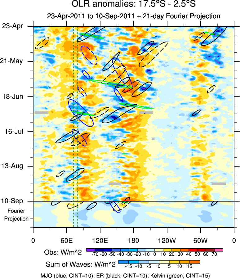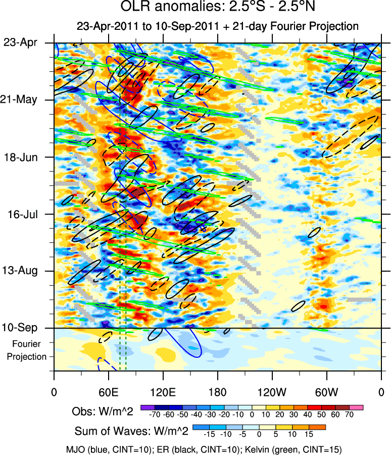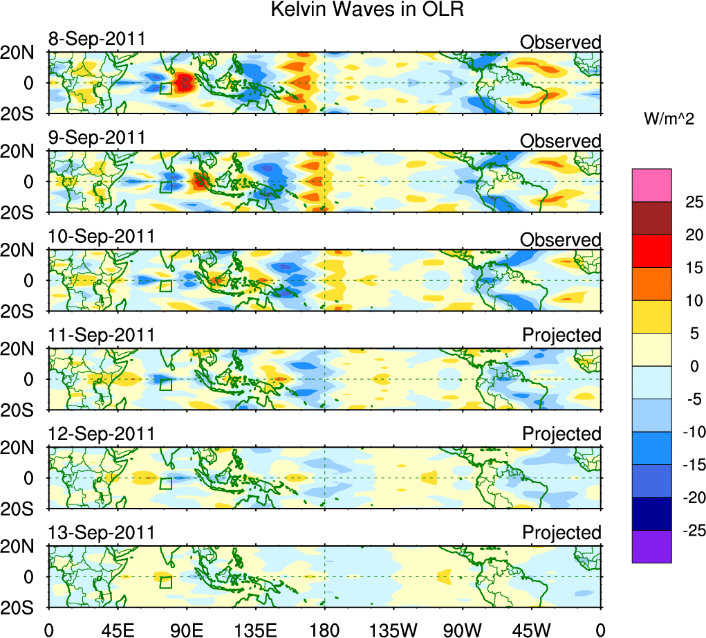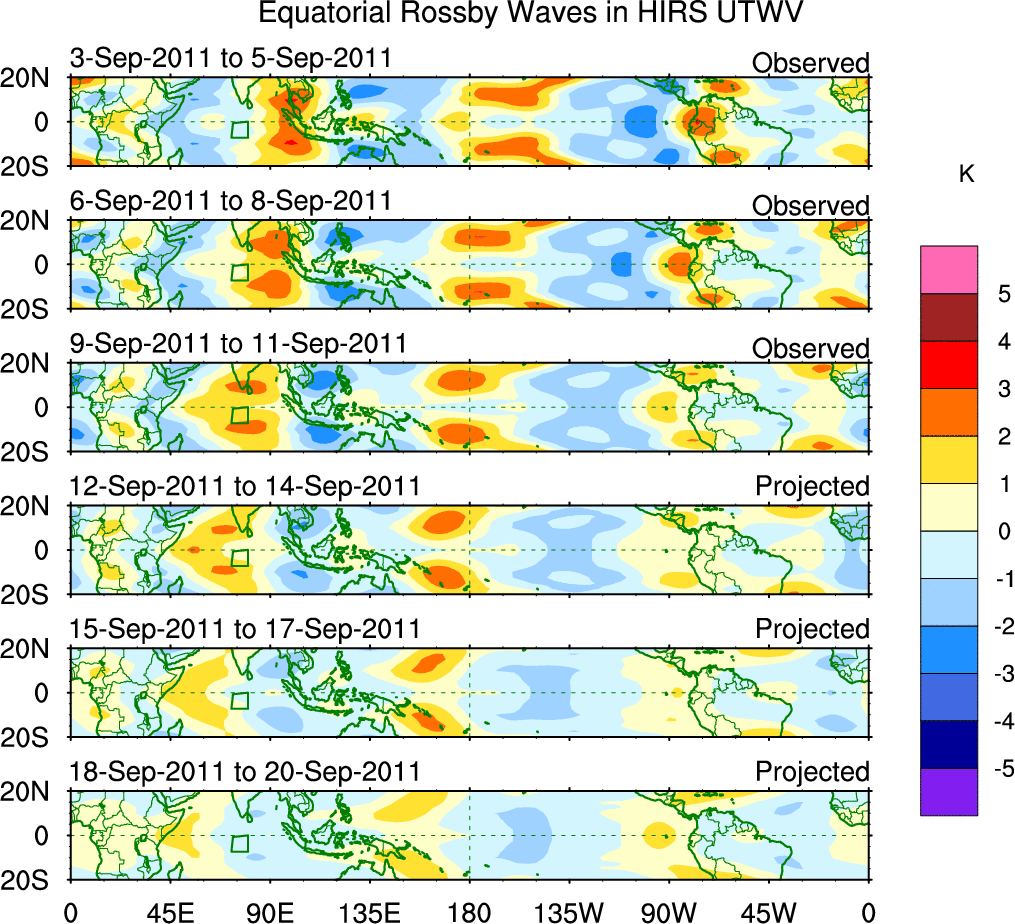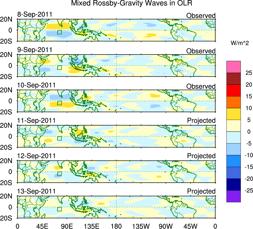To identify tropical waves in near real-time, the OLR and UTWV data are filtered following Wheeler & Weickmann (2001 MWR). The daily anomalies are calculated using the first 3 harmonics of the seasonal cycle for 1979–2009. Missing values are then filled using linear interpolation in space and time. The most recent 365 days of anomalies are padded with 659 days of zeroes, and the result is filtered for each wave type.