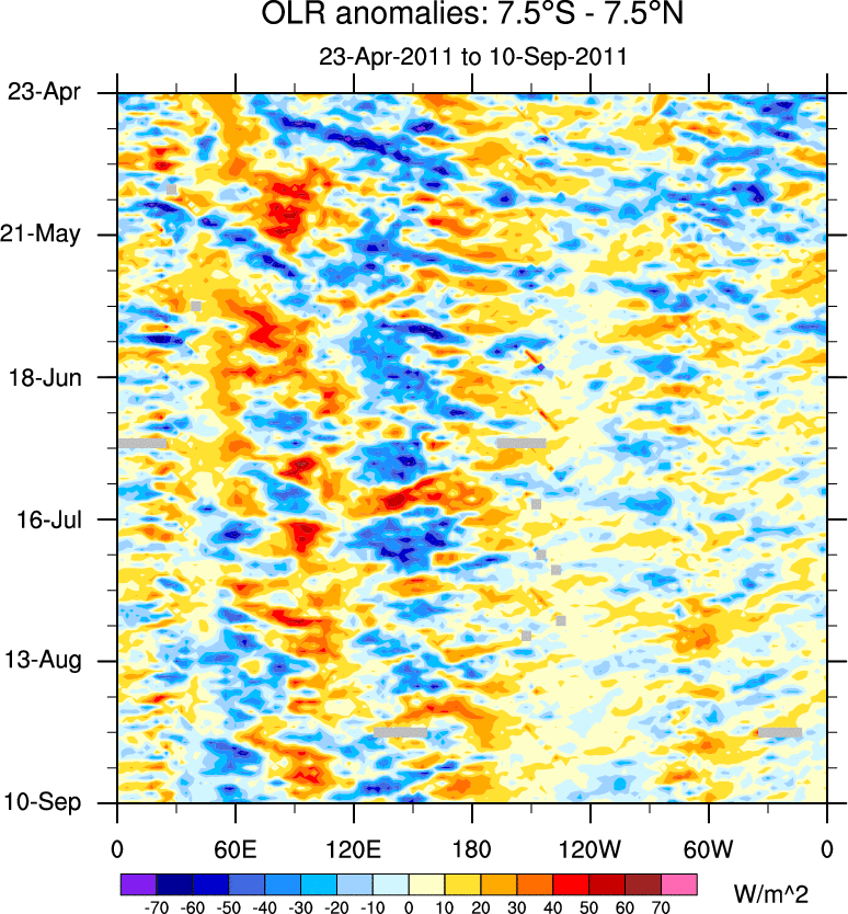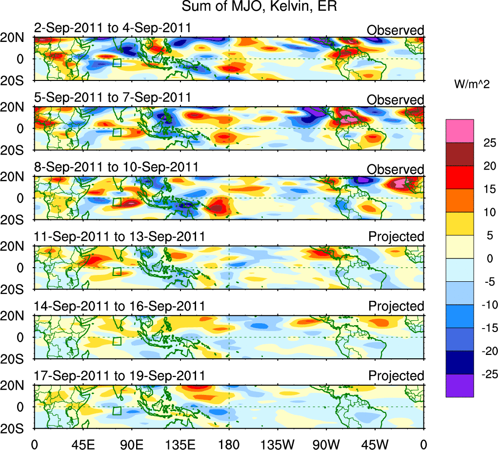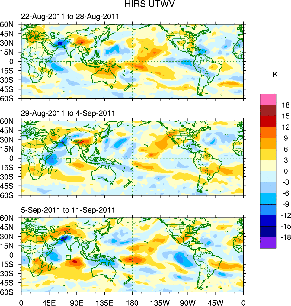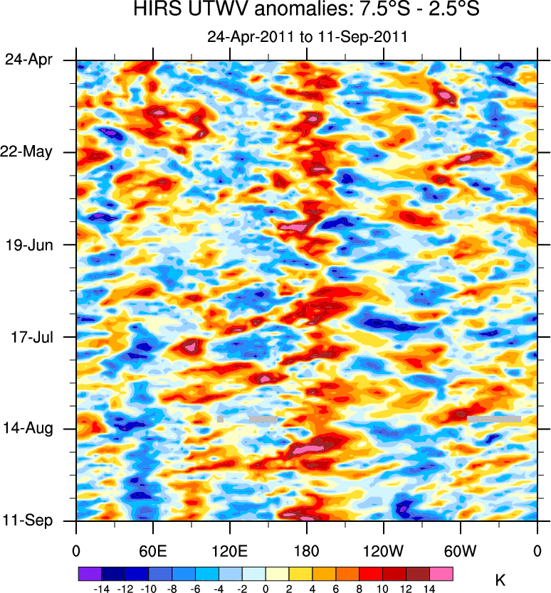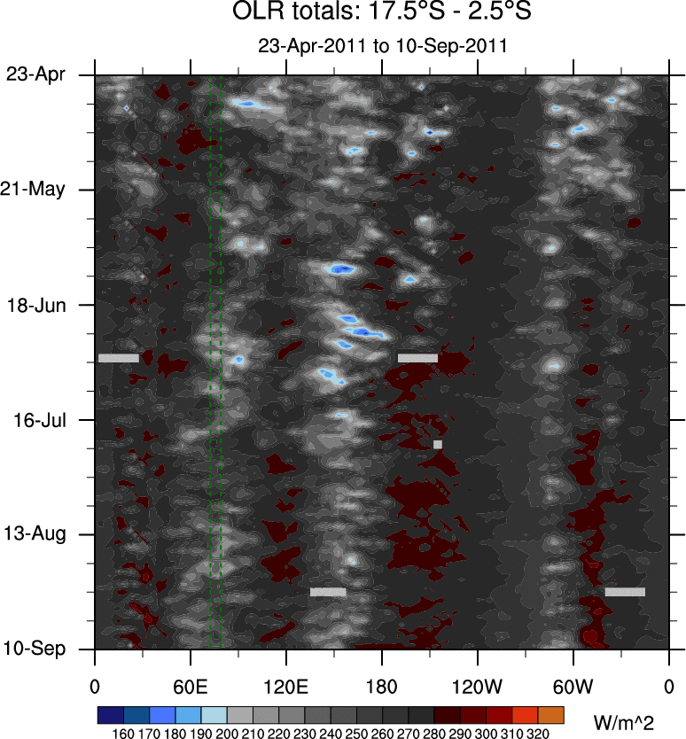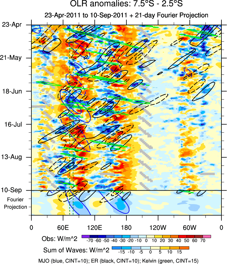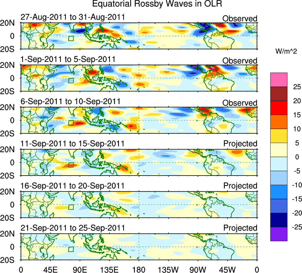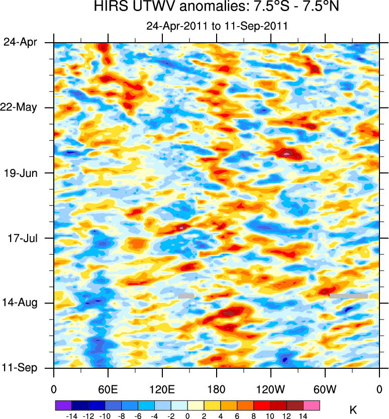 To identify tropical waves in near real-time, the OLR and UTWV data are filtered following Wheeler & Weickmann (2001 MWR). The daily anomalies are calculated using the first 3 harmonics of the seasonal cycle for 1979–2009. Missing values are then filled using linear interpolation in space and time. The most recent 365 days of anomalies are padded with 659 days of zeroes, and the result is filtered for each wave type.