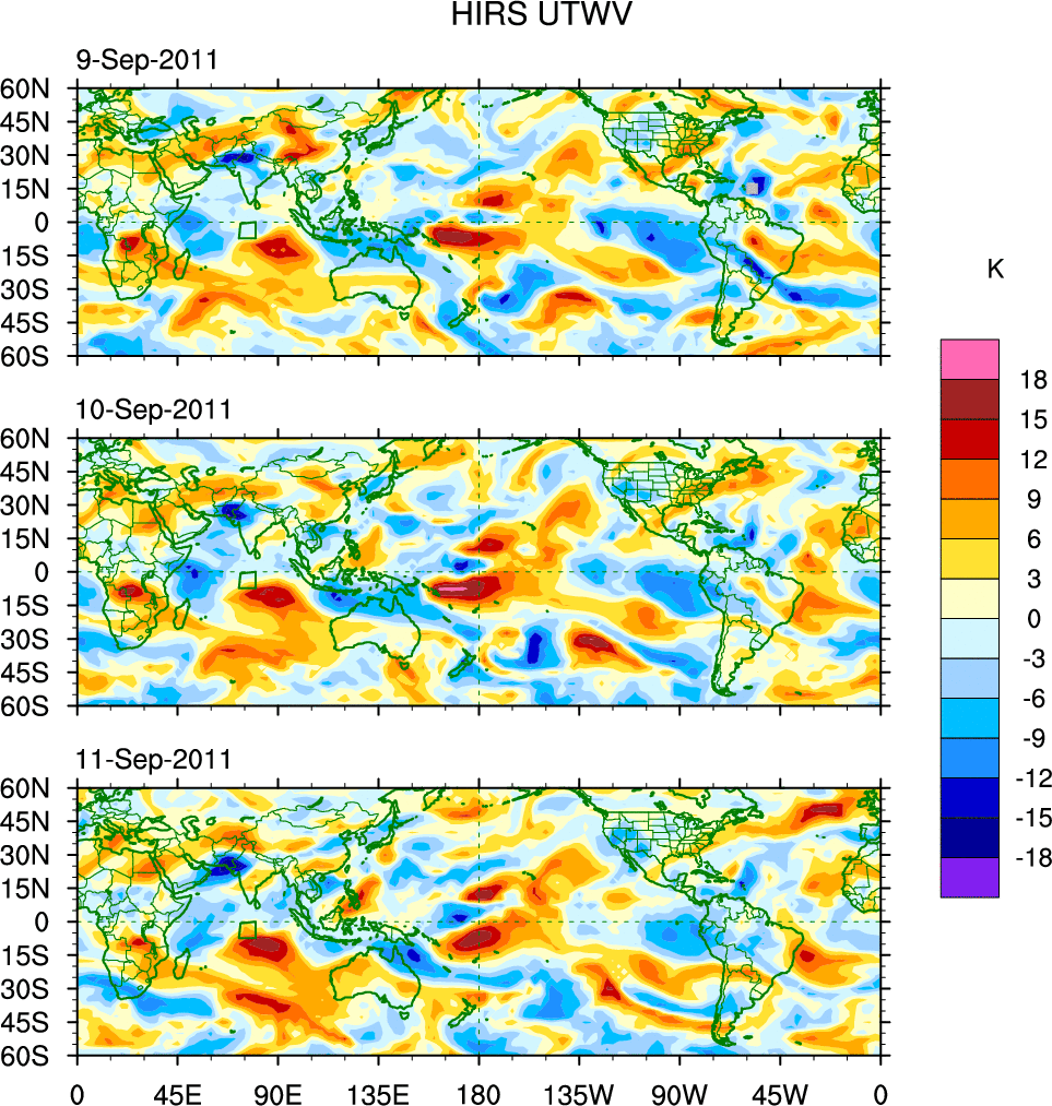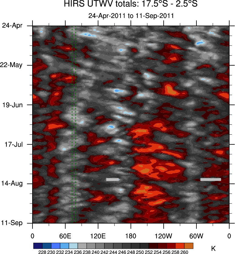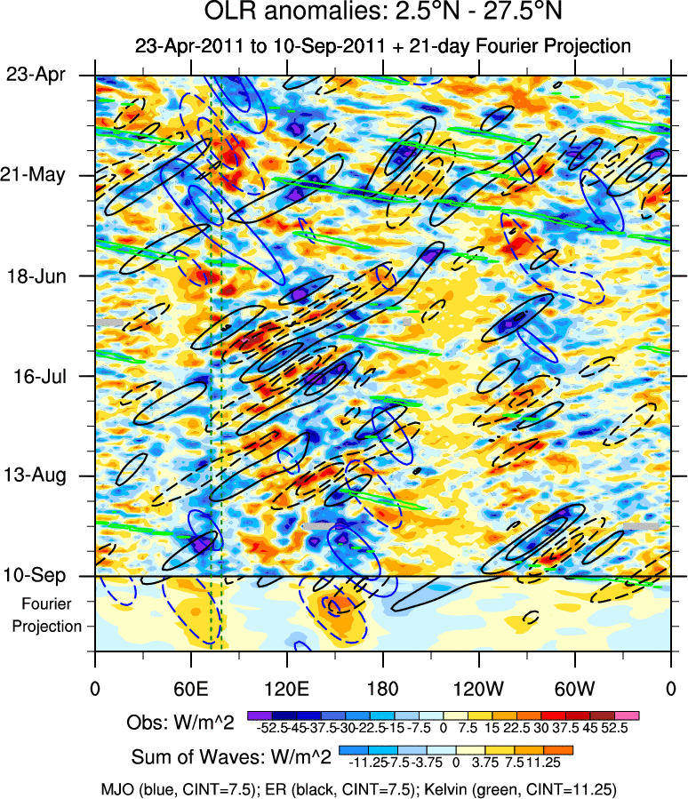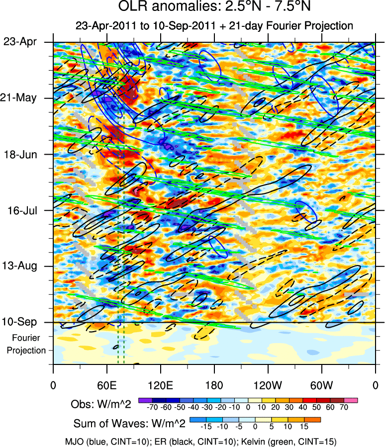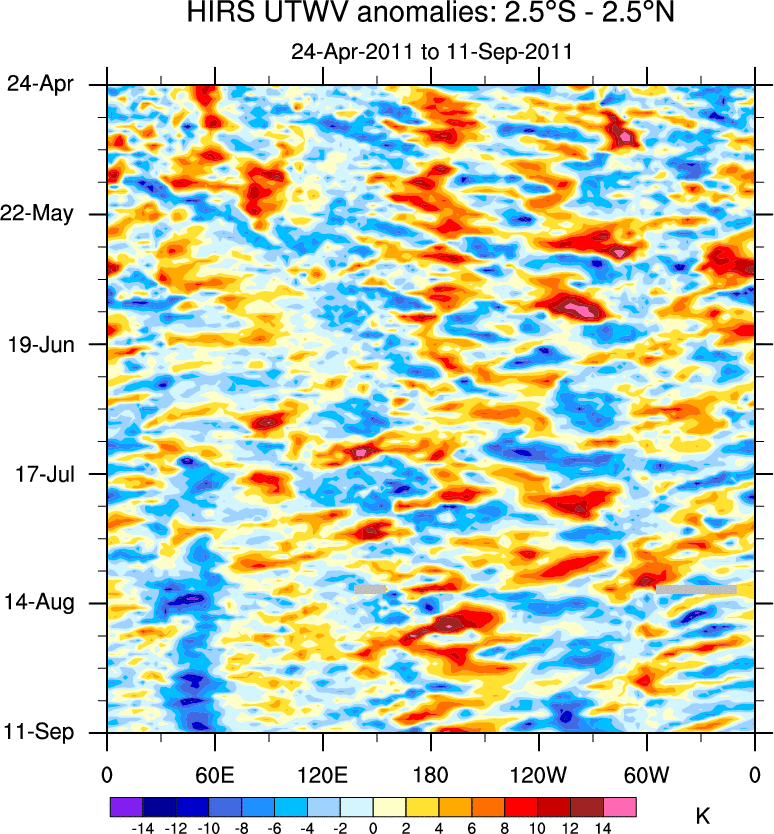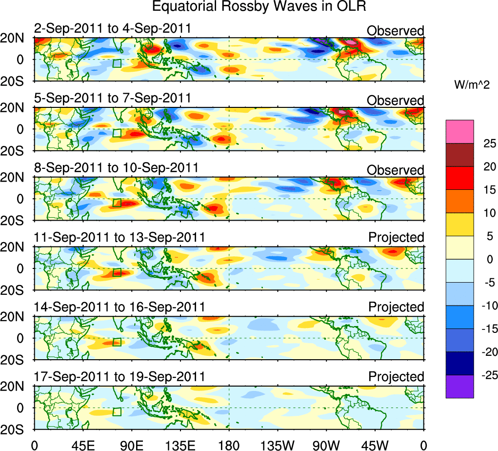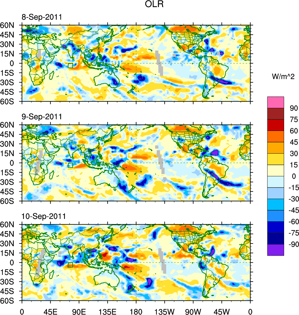 To identify tropical waves in near real-time, the OLR and UTWV data are filtered following Wheeler & Weickmann (2001 MWR). The daily anomalies are calculated using the first 3 harmonics of the seasonal cycle for 1979–2009. Missing values are then filled using linear interpolation in space and time. The most recent 365 days of anomalies are padded with 659 days of zeroes, and the result is filtered for each wave type.
