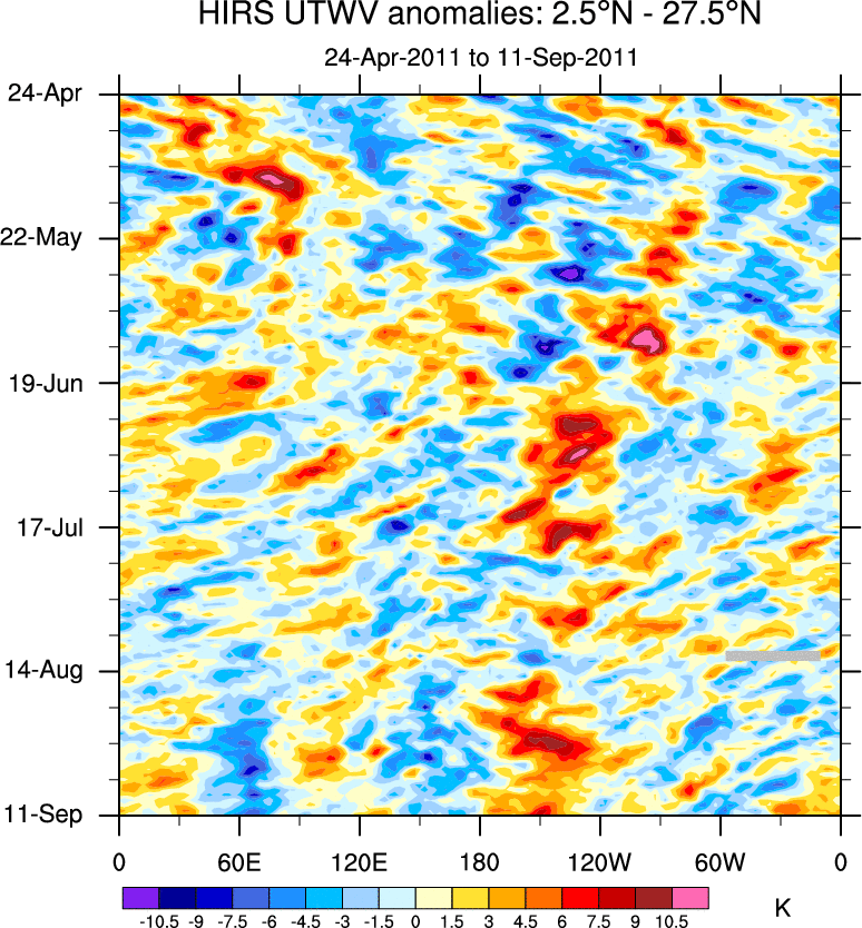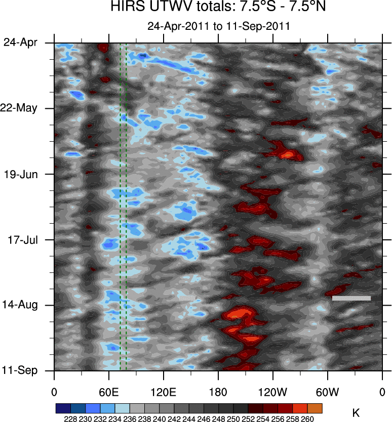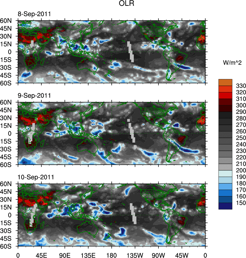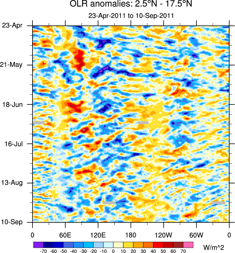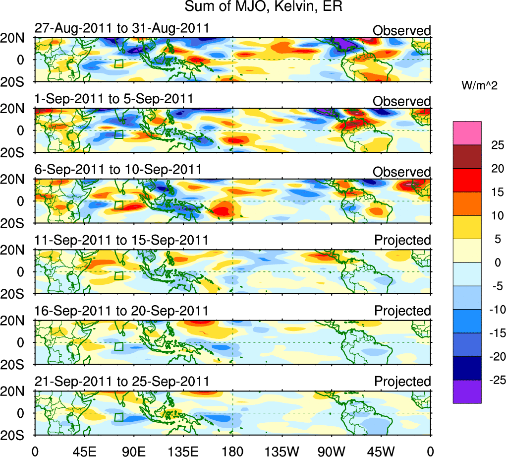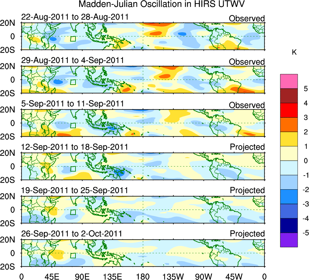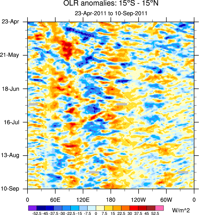 To identify tropical waves in near real-time, the OLR and UTWV data are filtered following Wheeler & Weickmann (2001 MWR). The daily anomalies are calculated using the first 3 harmonics of the seasonal cycle for 1979–2009. Missing values are then filled using linear interpolation in space and time. The most recent 365 days of anomalies are padded with 659 days of zeroes, and the result is filtered for each wave type.
