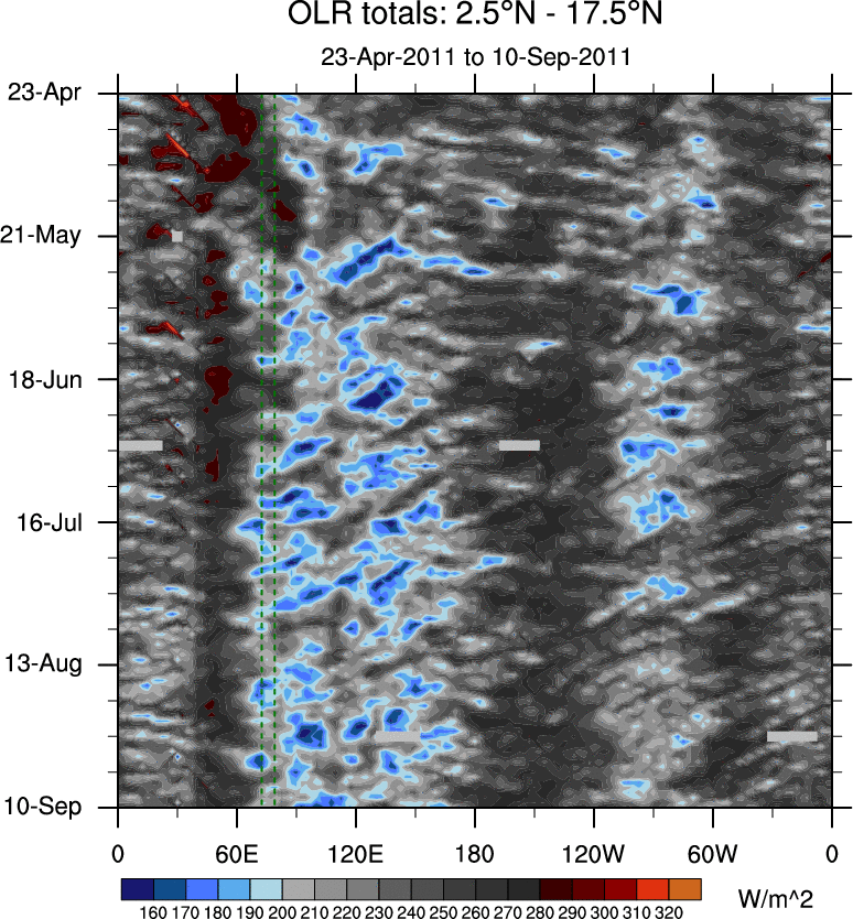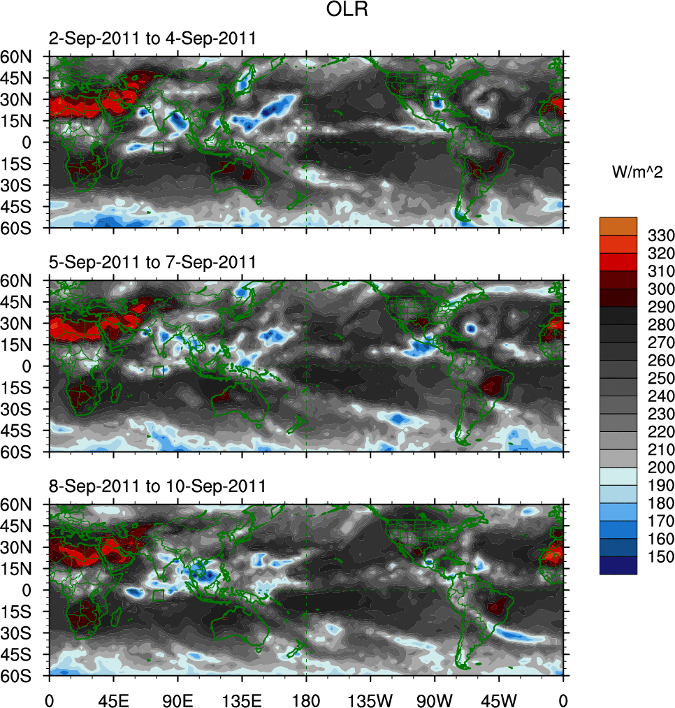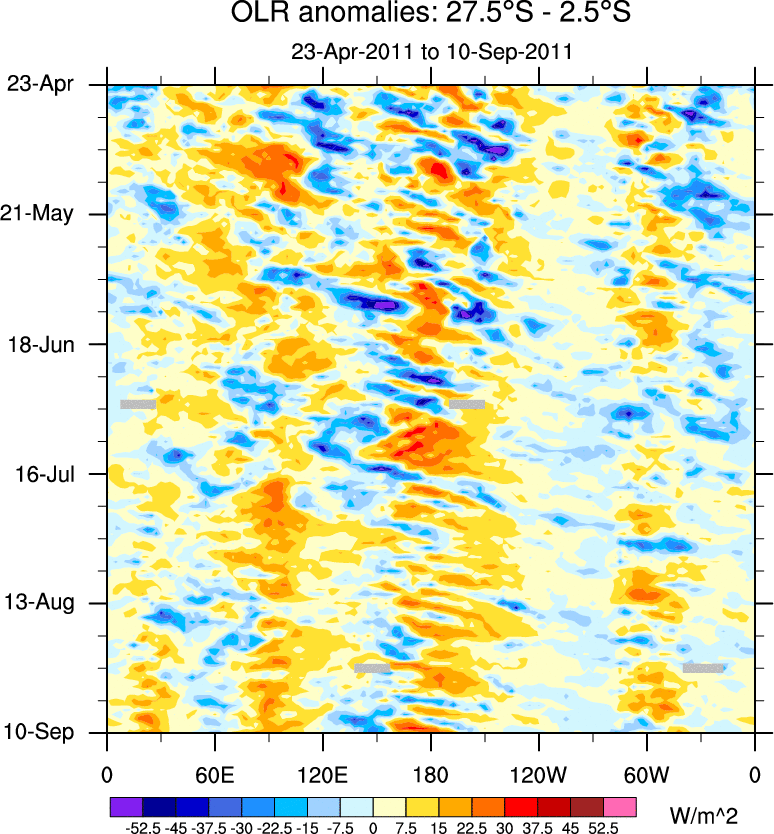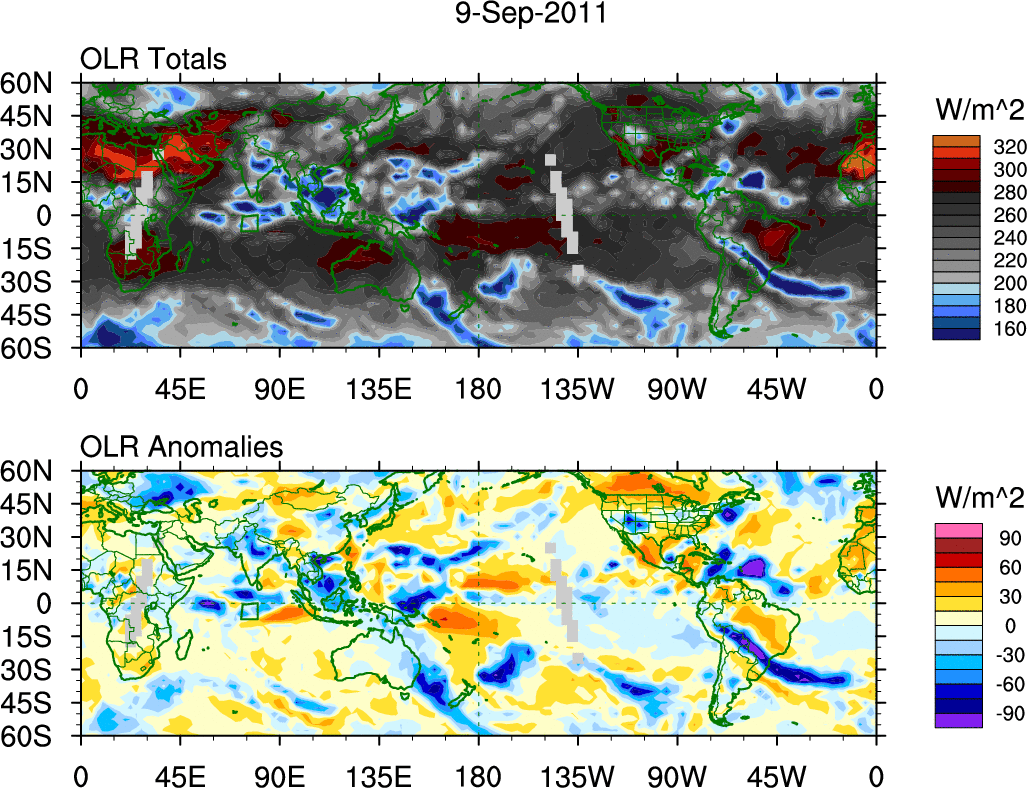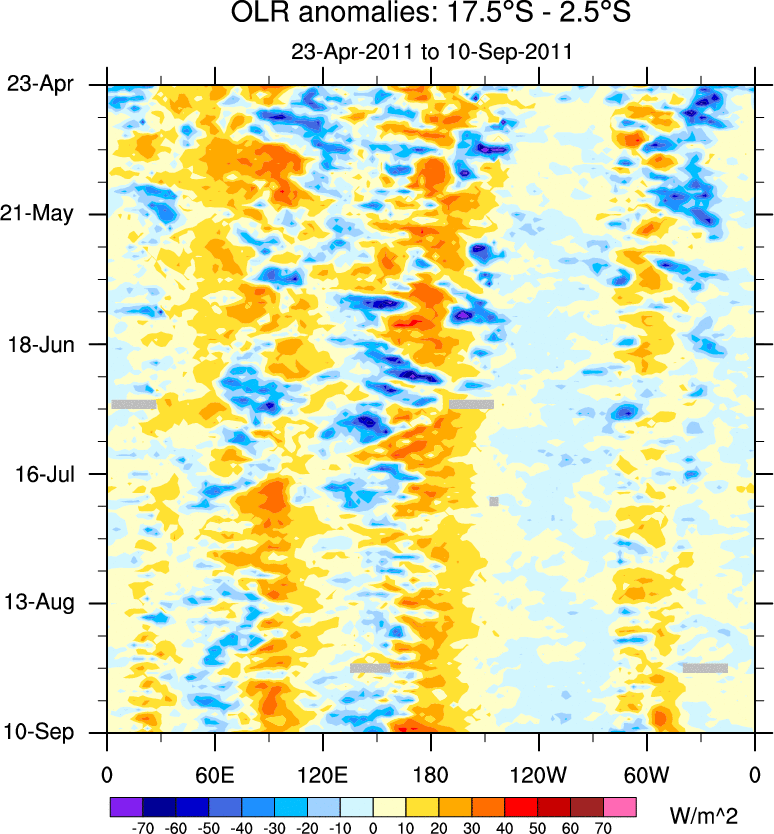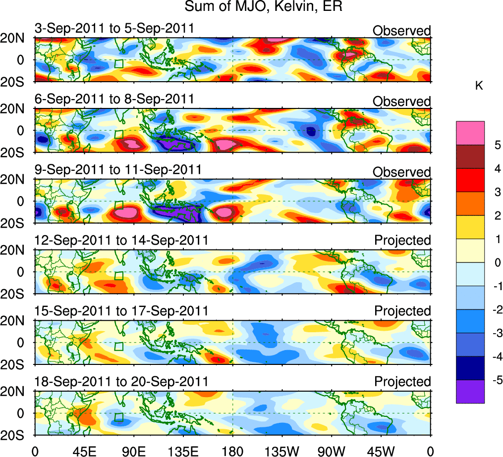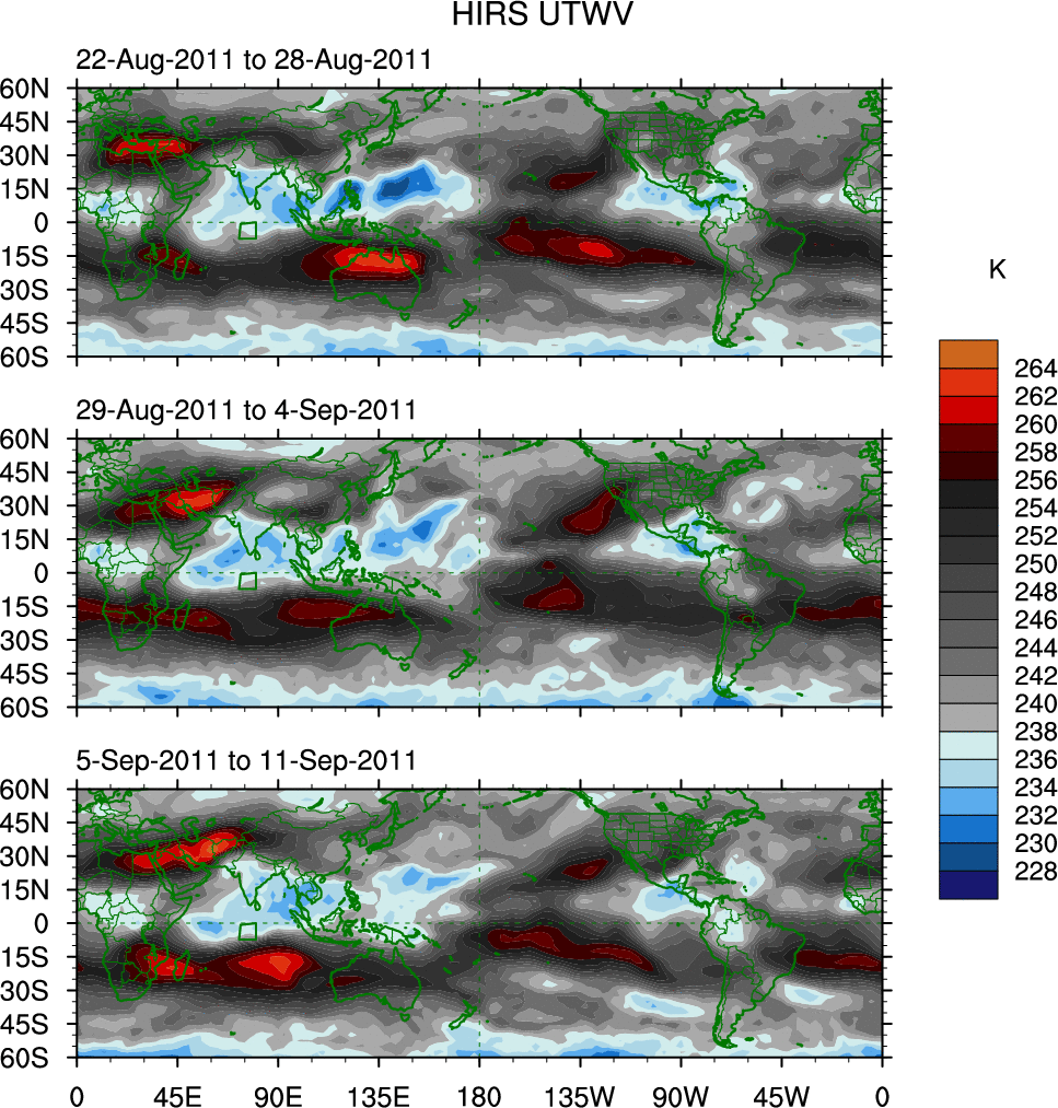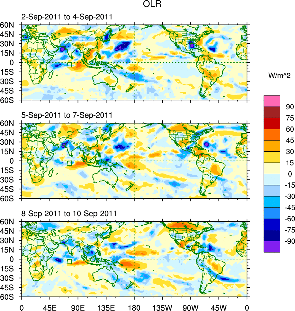 To identify tropical waves in near real-time, the OLR and UTWV data are filtered following Wheeler & Weickmann (2001 MWR). The daily anomalies are calculated using the first 3 harmonics of the seasonal cycle for 1979–2009. Missing values are then filled using linear interpolation in space and time. The most recent 365 days of anomalies are padded with 659 days of zeroes, and the result is filtered for each wave type.
