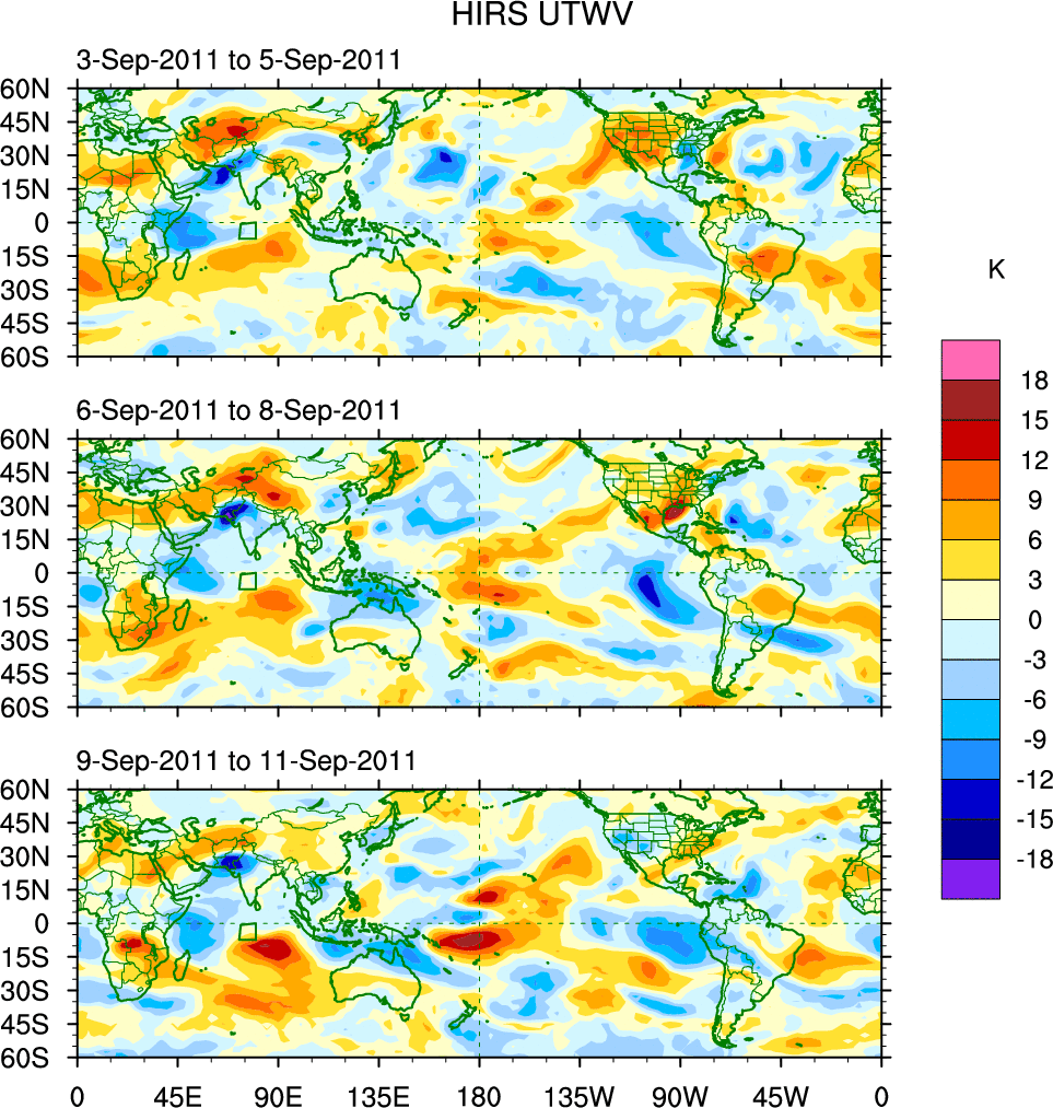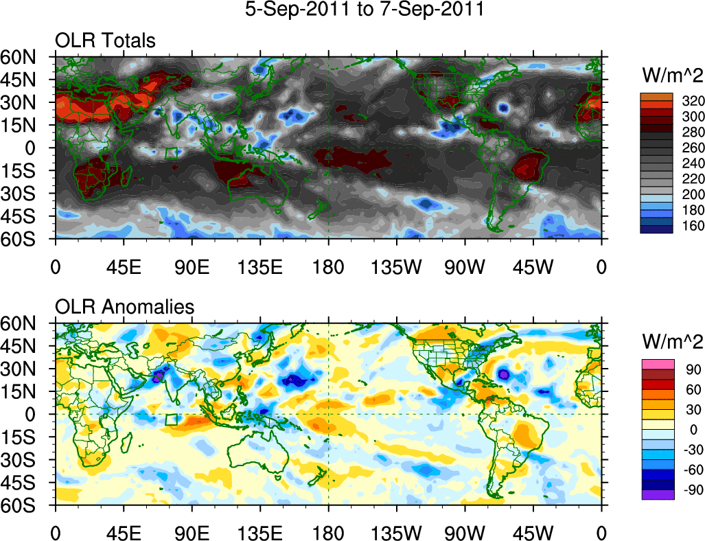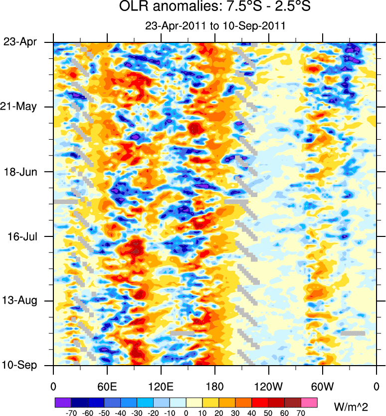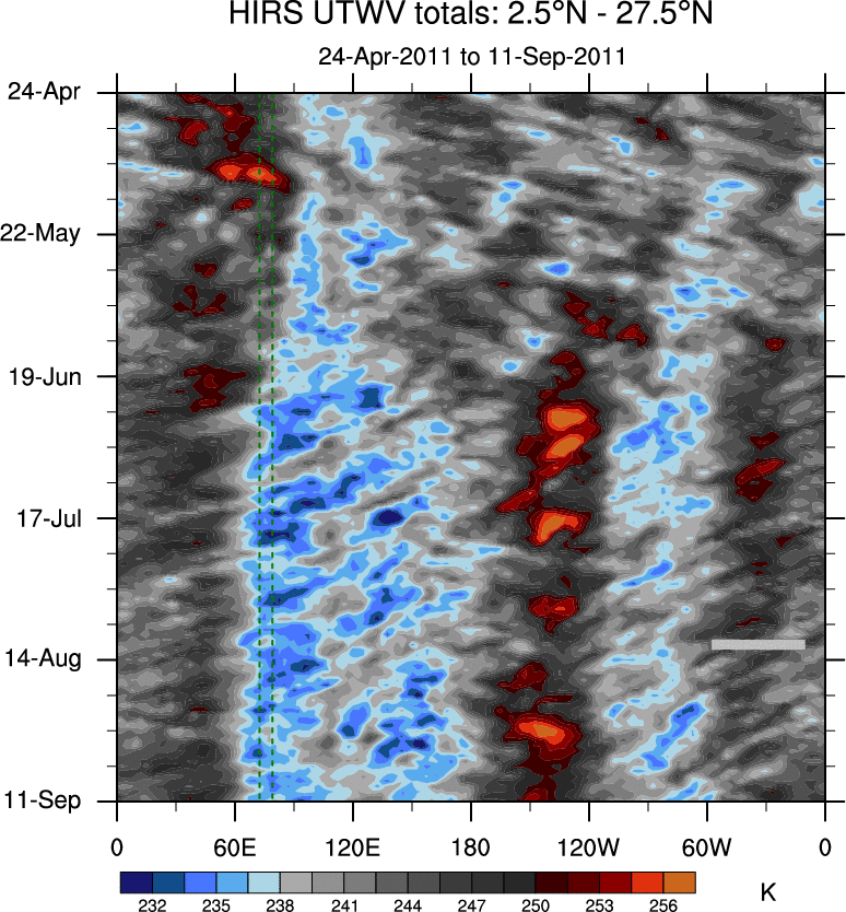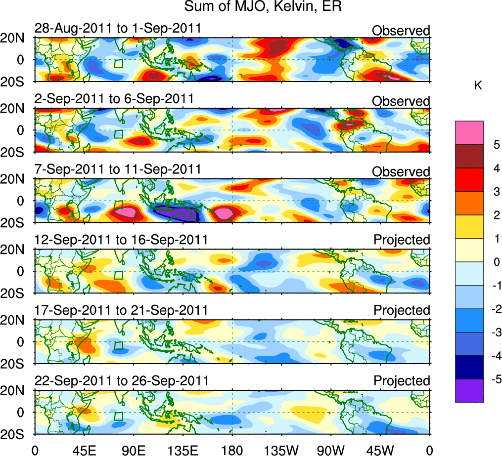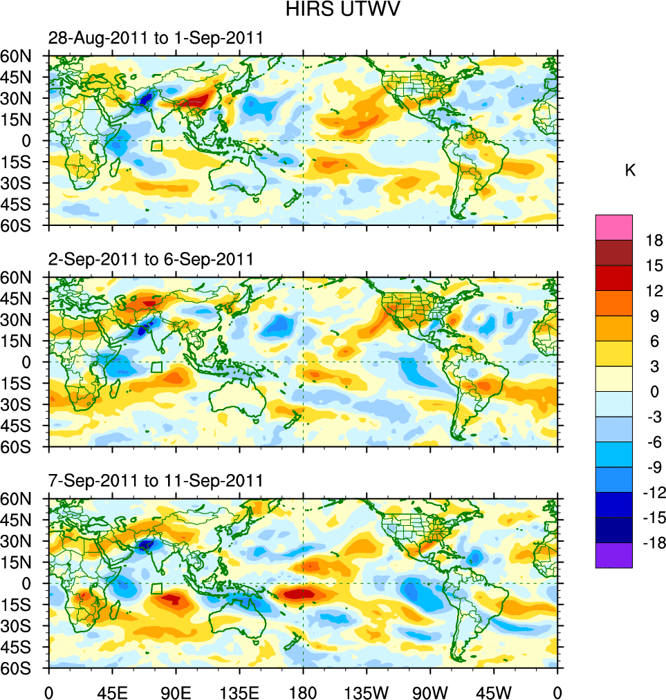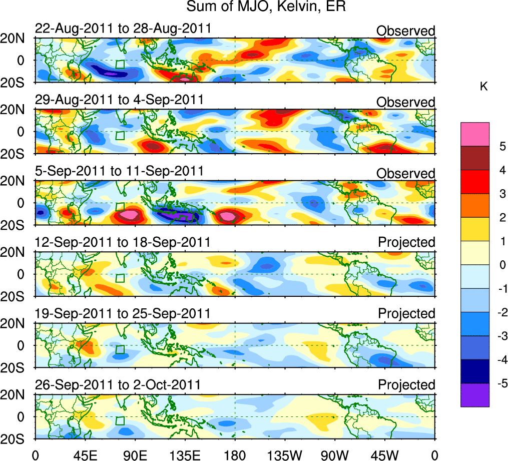 To identify tropical waves in near real-time, the OLR and UTWV data are filtered following Wheeler & Weickmann (2001 MWR). The daily anomalies are calculated using the first 3 harmonics of the seasonal cycle for 1979–2009. Missing values are then filled using linear interpolation in space and time. The most recent 365 days of anomalies are padded with 659 days of zeroes, and the result is filtered for each wave type.