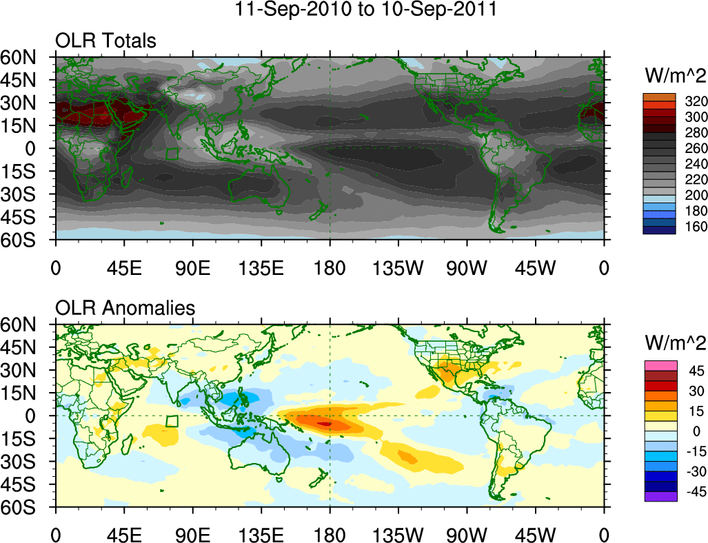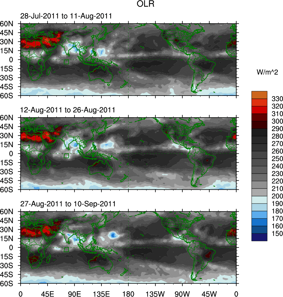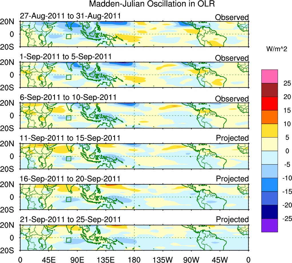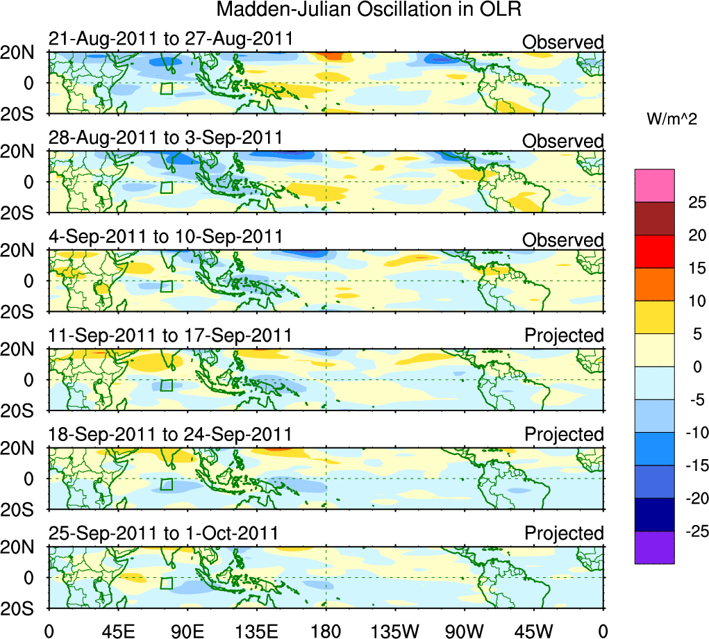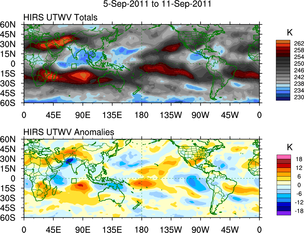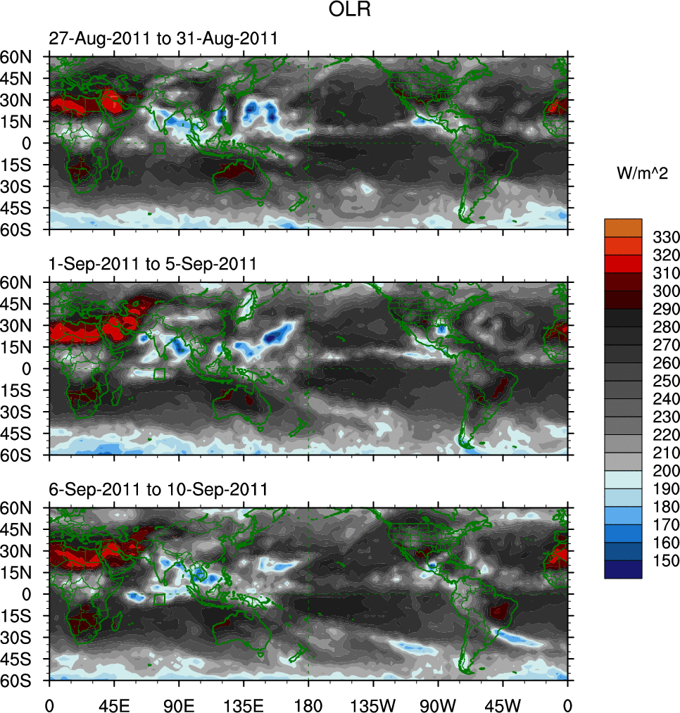 To identify tropical waves in near real-time, the OLR and UTWV data are filtered following Wheeler & Weickmann (2001 MWR). The daily anomalies are calculated using the first 3 harmonics of the seasonal cycle for 1979–2009. Missing values are then filled using linear interpolation in space and time. The most recent 365 days of anomalies are padded with 659 days of zeroes, and the result is filtered for each wave type.