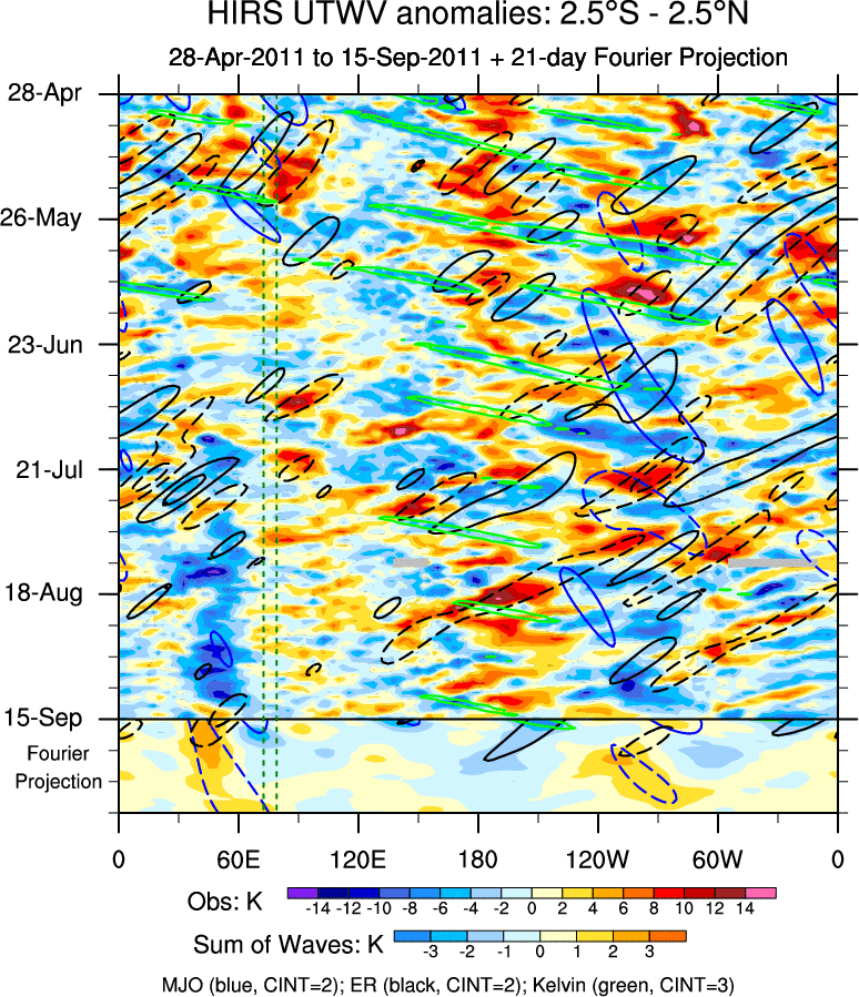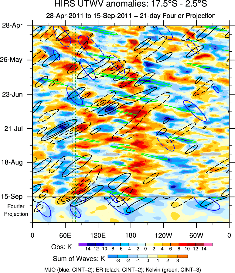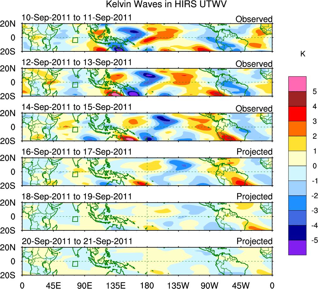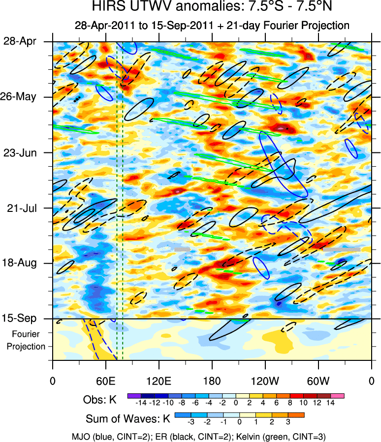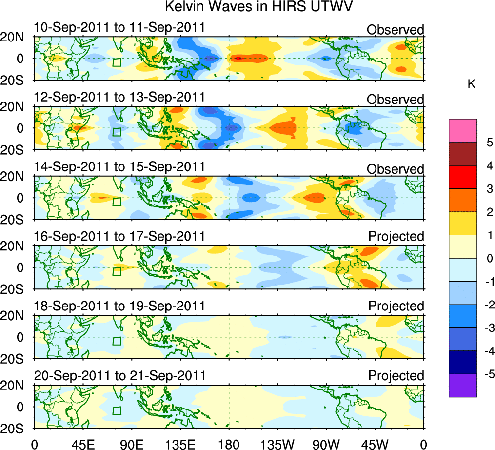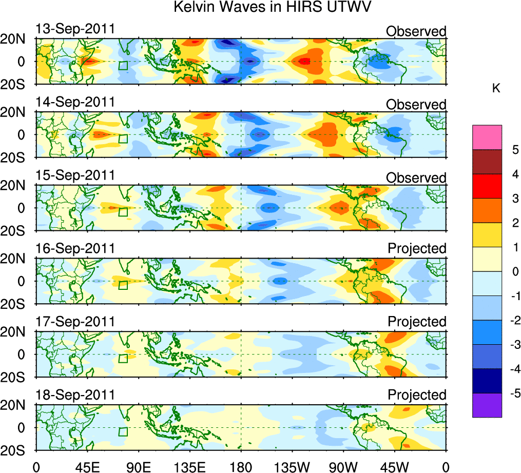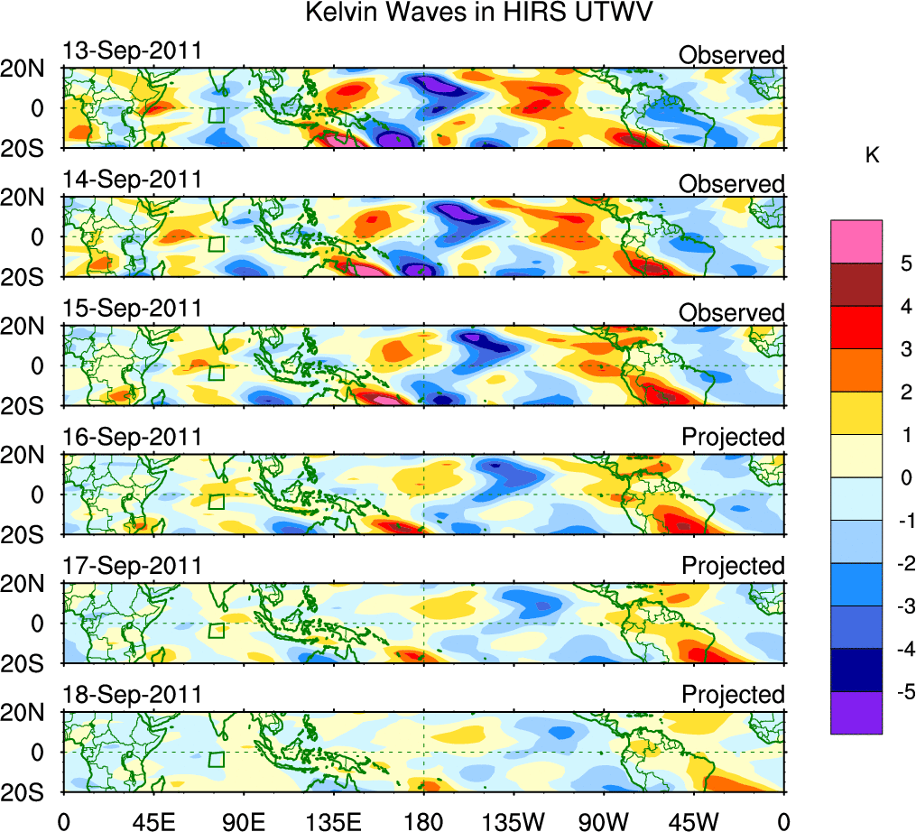 To identify tropical waves in near real-time, the OLR and UTWV data are filtered following Wheeler & Weickmann (2001 MWR). The daily anomalies are calculated using the first 3 harmonics of the seasonal cycle for 1979–2009. Missing values are then filled using linear interpolation in space and time. The most recent 365 days of anomalies are padded with 659 days of zeroes, and the result is filtered for each wave type.