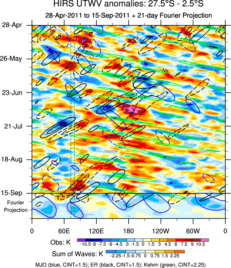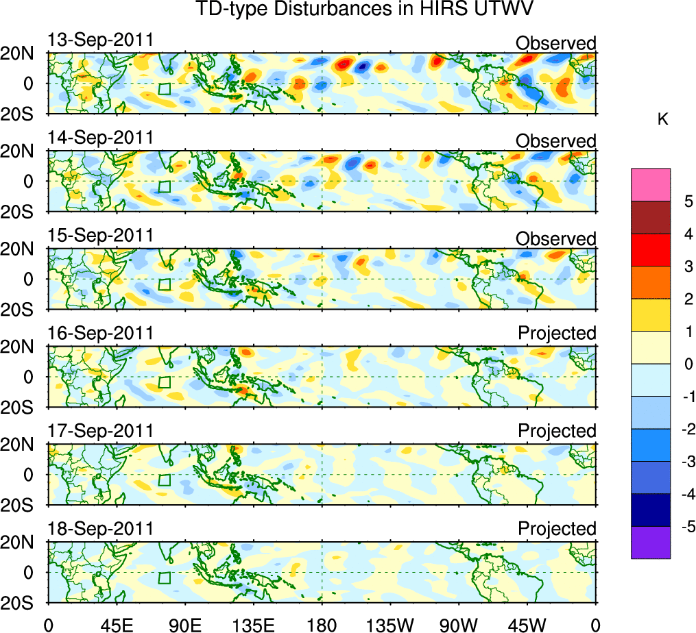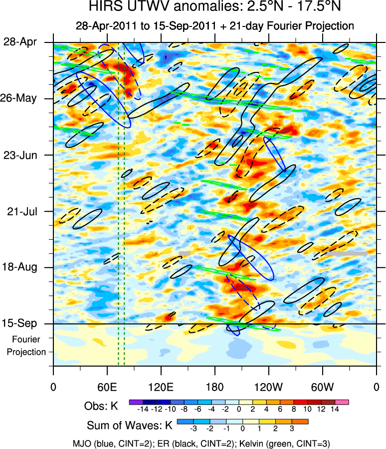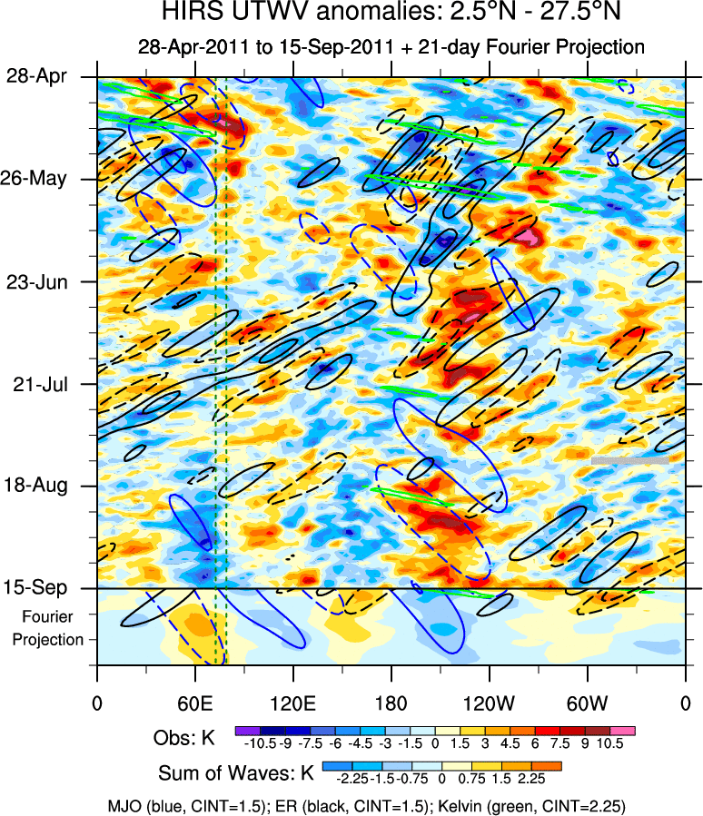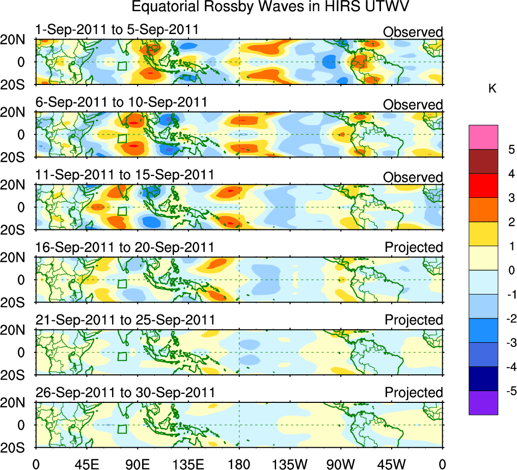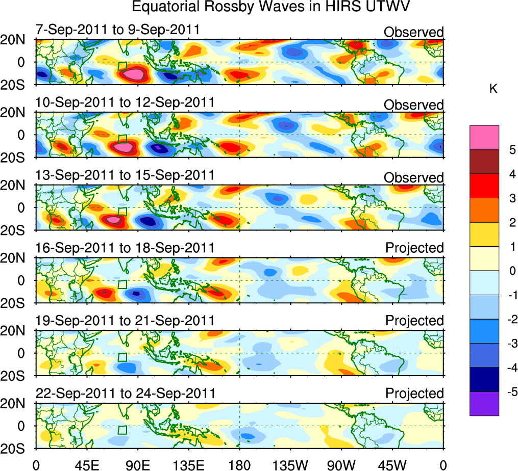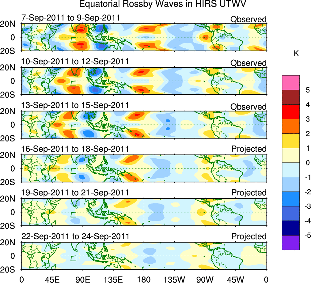 To identify tropical waves in near real-time, the OLR and UTWV data are filtered following Wheeler & Weickmann (2001 MWR). The daily anomalies are calculated using the first 3 harmonics of the seasonal cycle for 1979–2009. Missing values are then filled using linear interpolation in space and time. The most recent 365 days of anomalies are padded with 659 days of zeroes, and the result is filtered for each wave type.