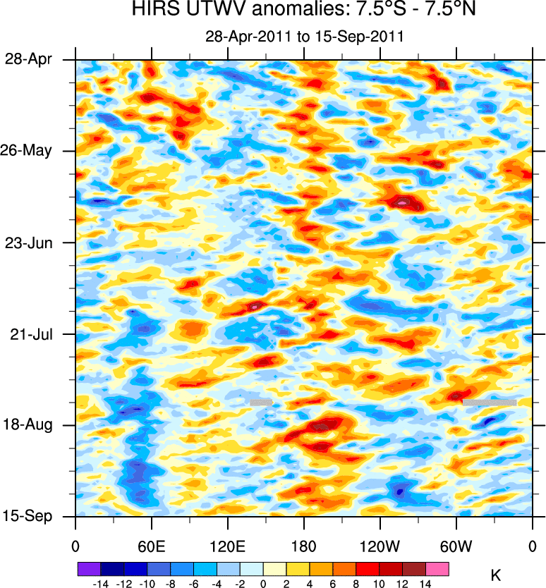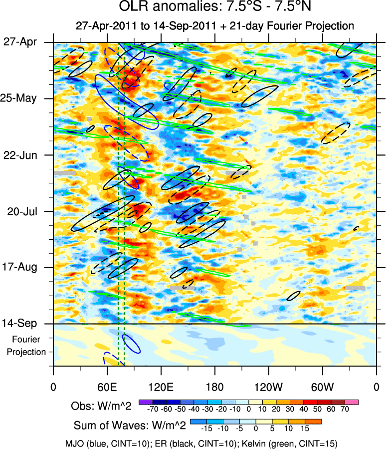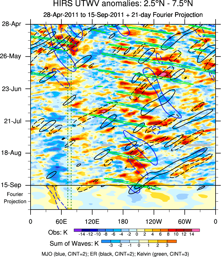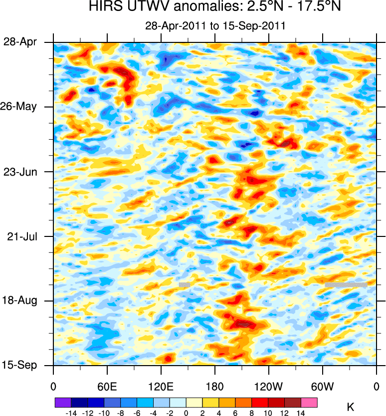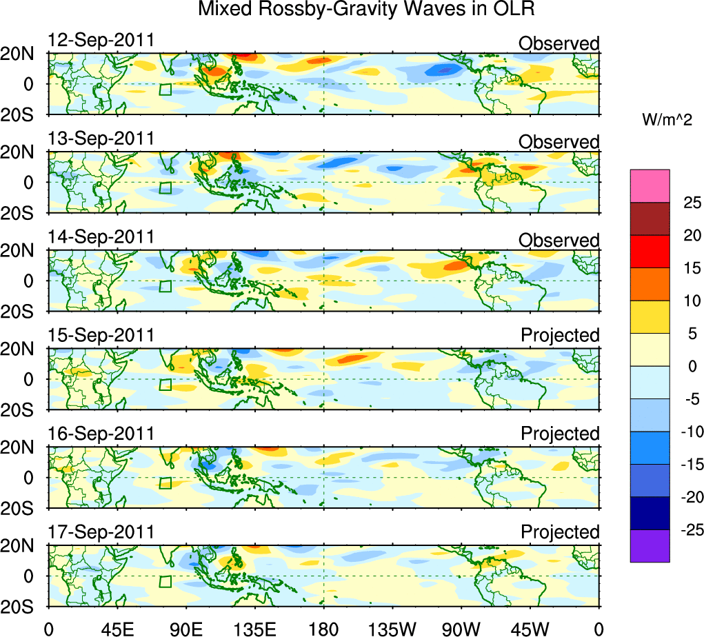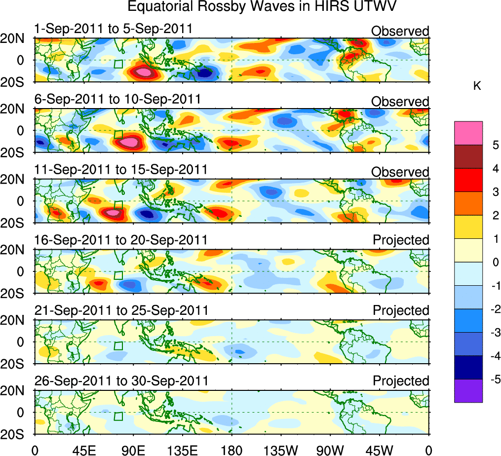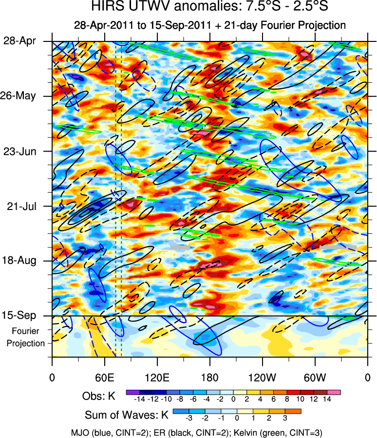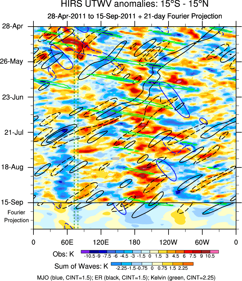 To identify tropical waves in near real-time, the OLR and UTWV data are filtered following Wheeler & Weickmann (2001 MWR). The daily anomalies are calculated using the first 3 harmonics of the seasonal cycle for 1979–2009. Missing values are then filled using linear interpolation in space and time. The most recent 365 days of anomalies are padded with 659 days of zeroes, and the result is filtered for each wave type.