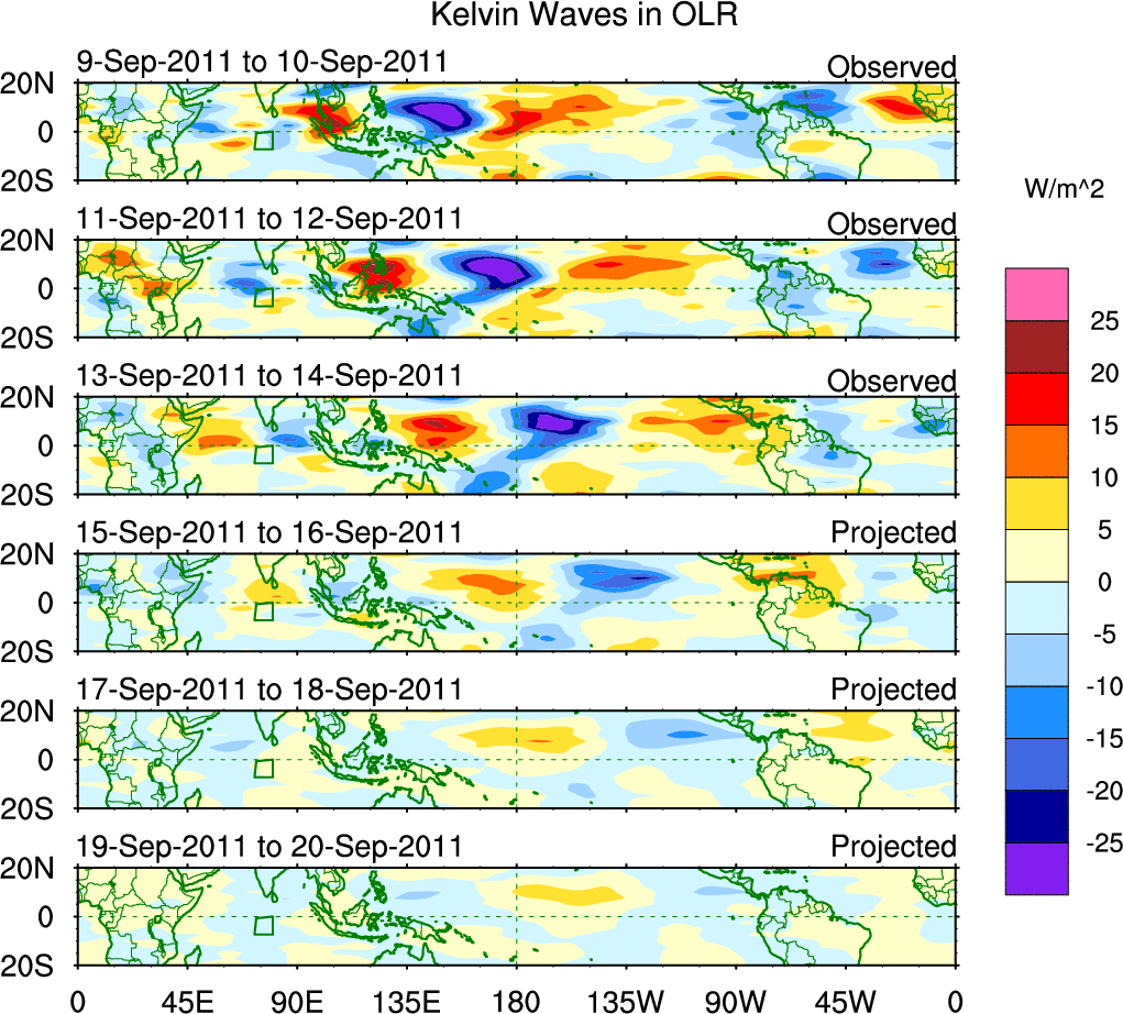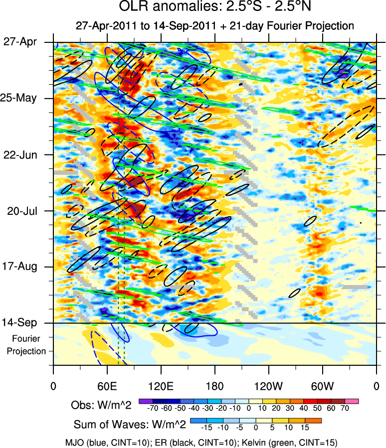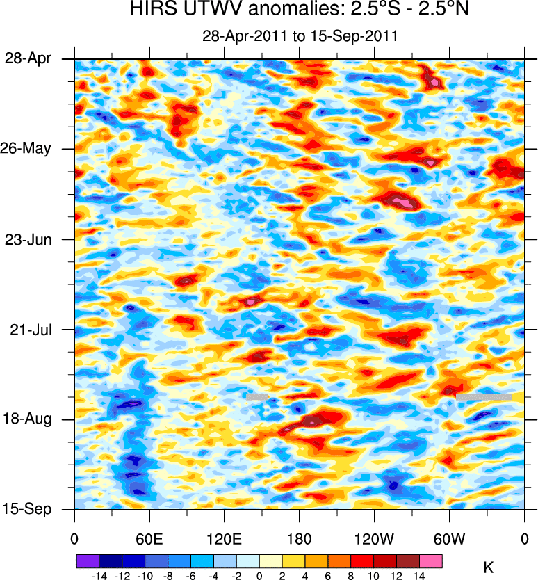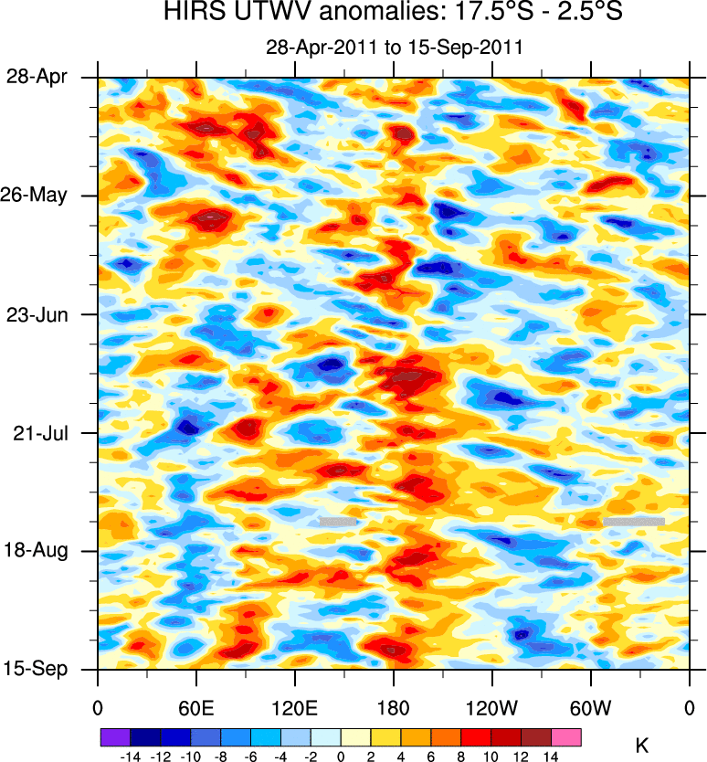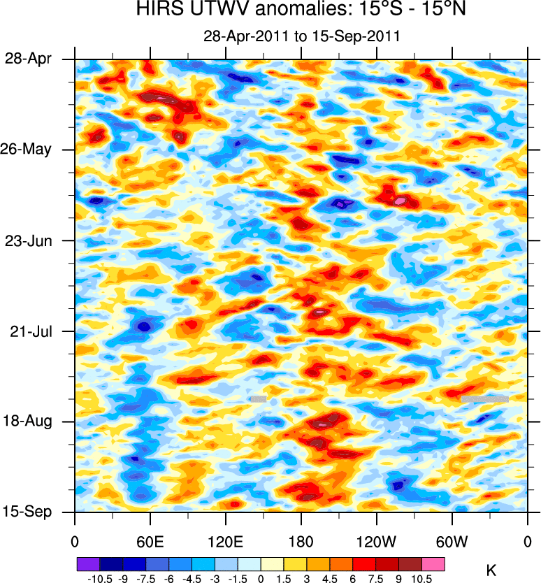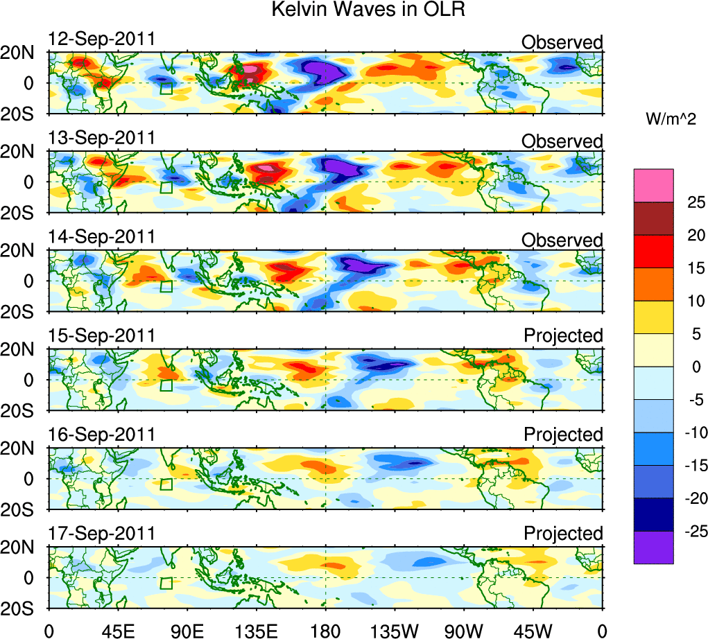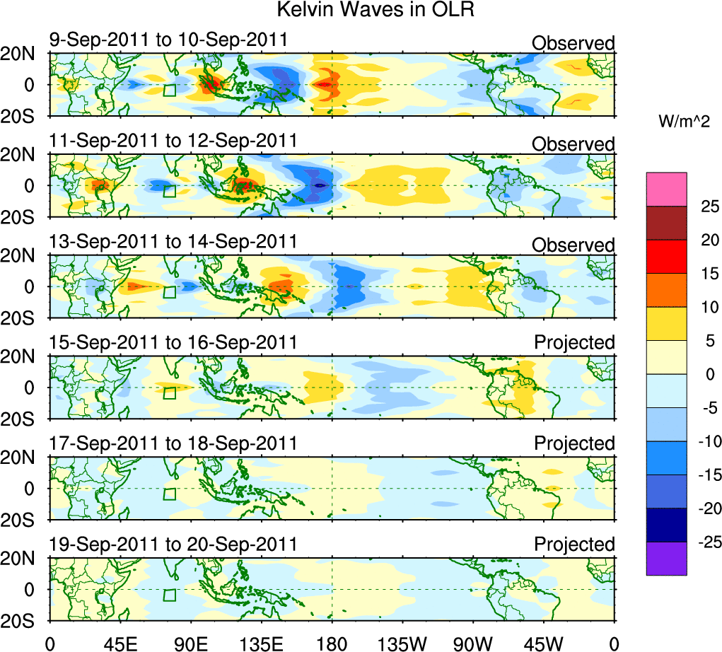 To identify tropical waves in near real-time, the OLR and UTWV data are filtered following Wheeler & Weickmann (2001 MWR). The daily anomalies are calculated using the first 3 harmonics of the seasonal cycle for 1979–2009. Missing values are then filled using linear interpolation in space and time. The most recent 365 days of anomalies are padded with 659 days of zeroes, and the result is filtered for each wave type.