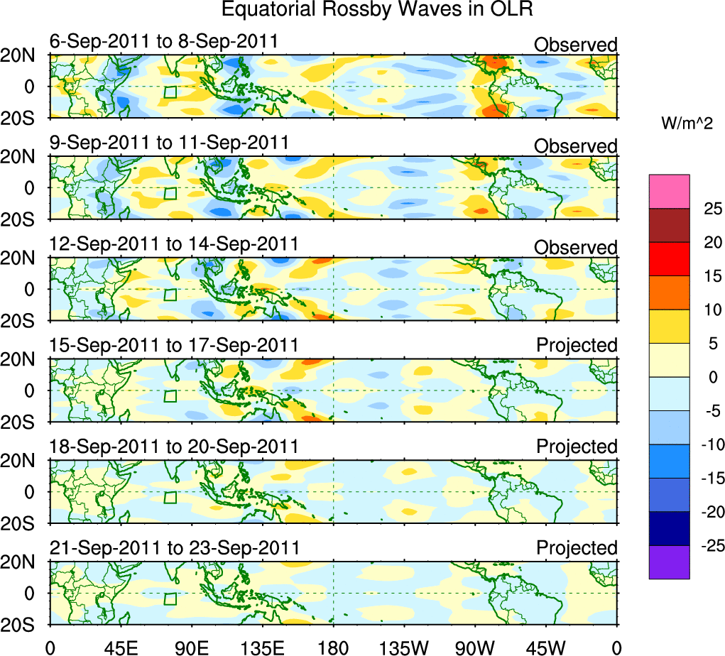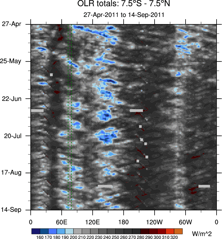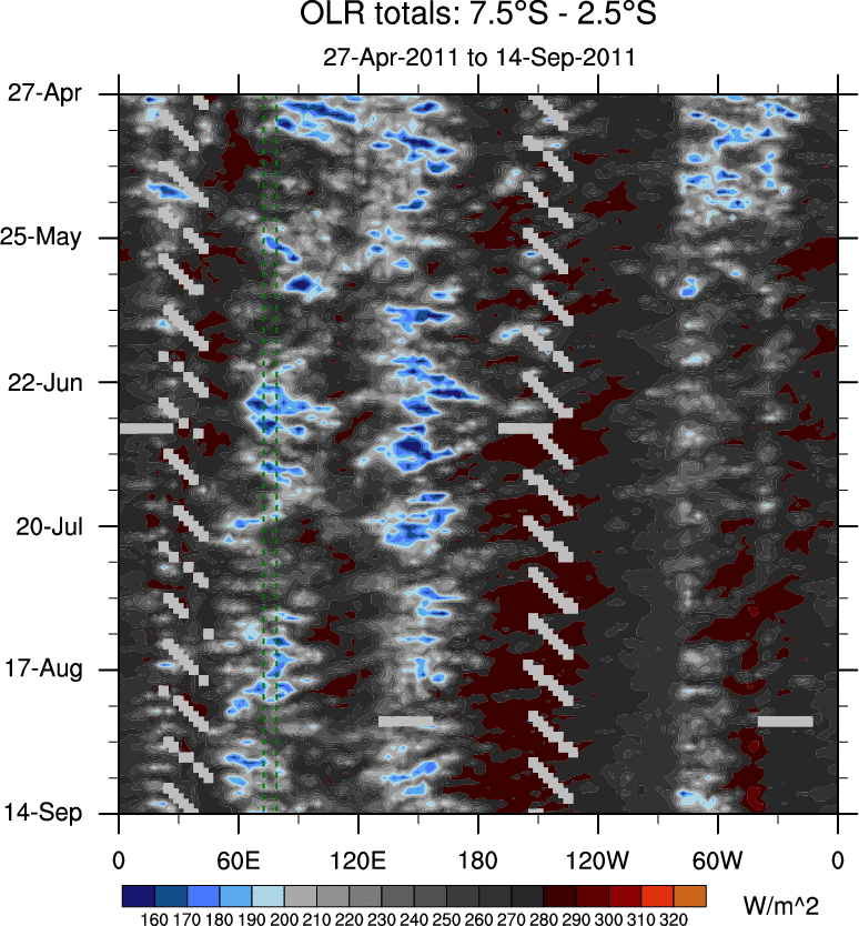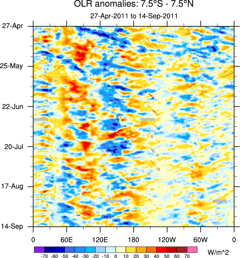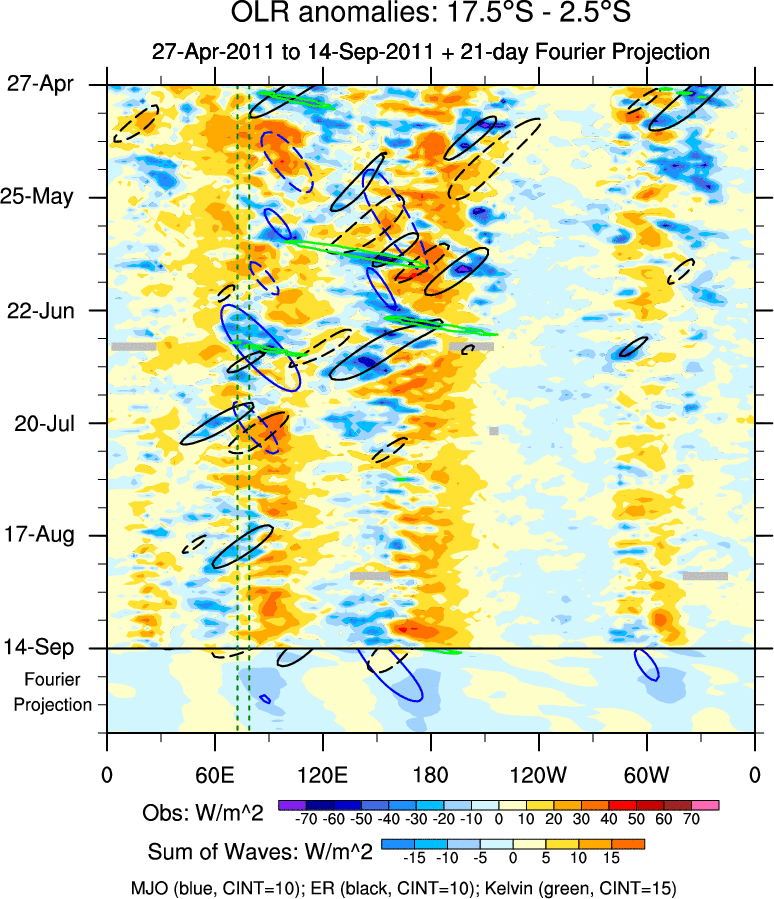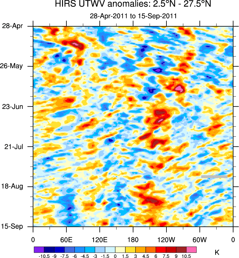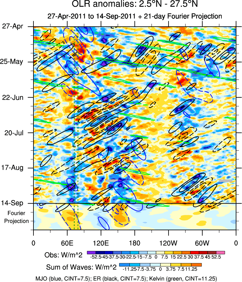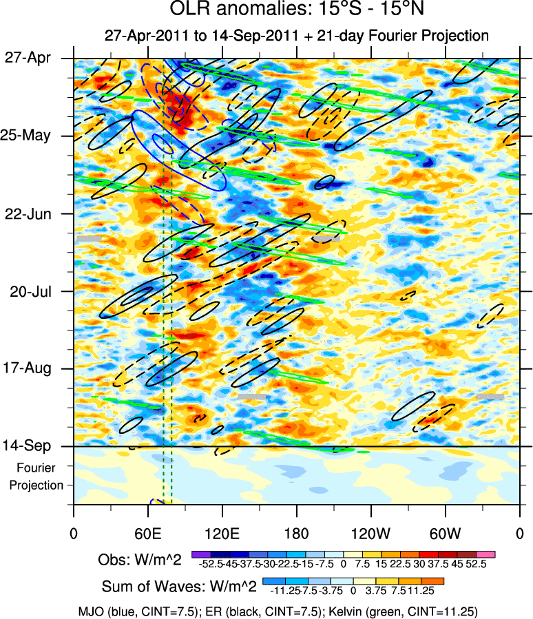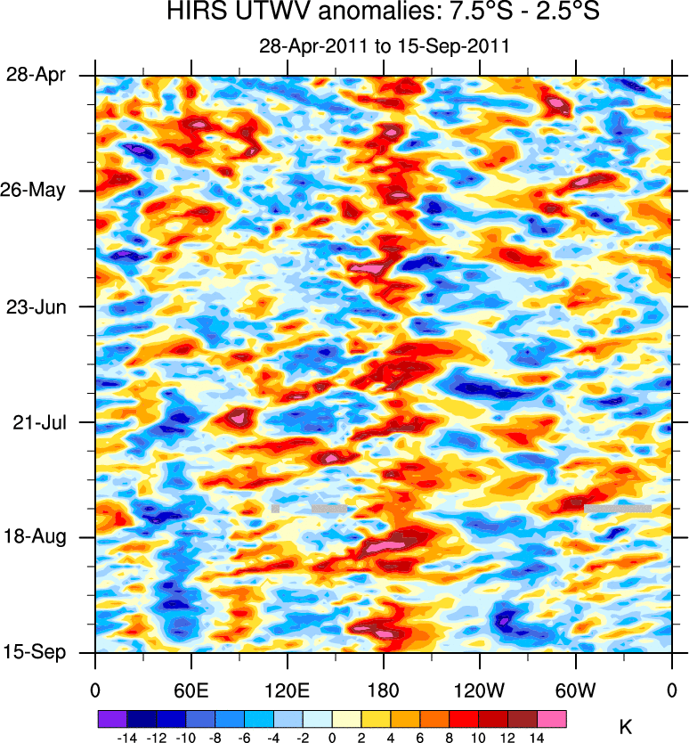 To identify tropical waves in near real-time, the OLR and UTWV data are filtered following Wheeler & Weickmann (2001 MWR). The daily anomalies are calculated using the first 3 harmonics of the seasonal cycle for 1979–2009. Missing values are then filled using linear interpolation in space and time. The most recent 365 days of anomalies are padded with 659 days of zeroes, and the result is filtered for each wave type.