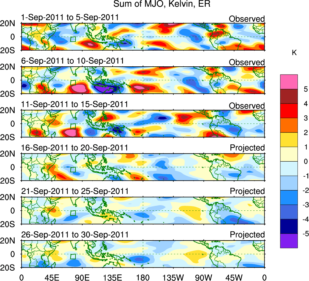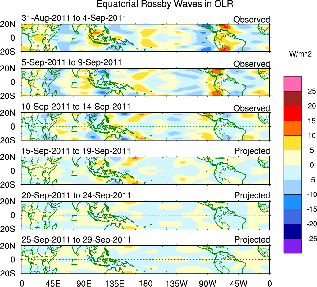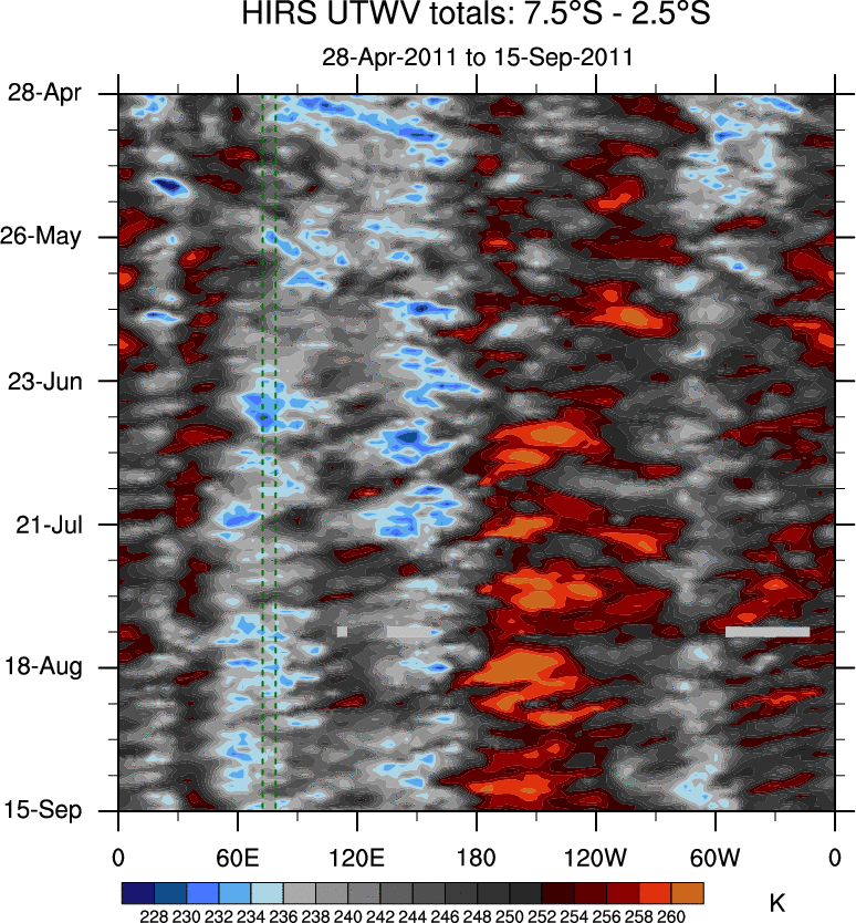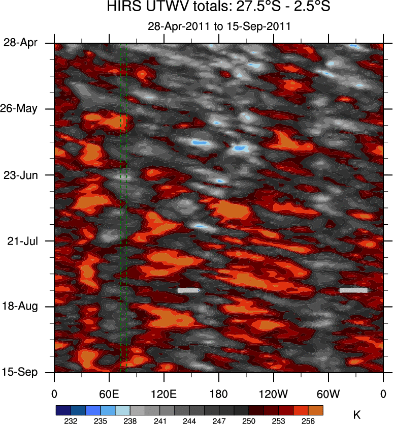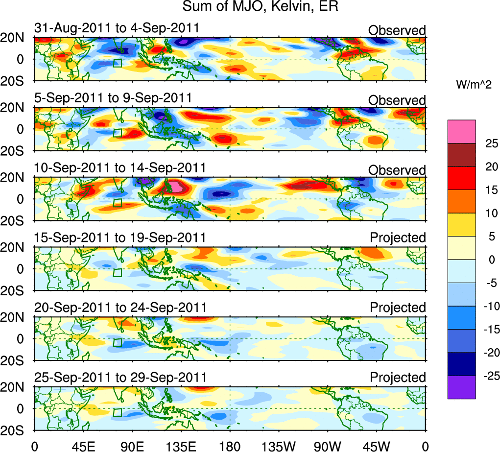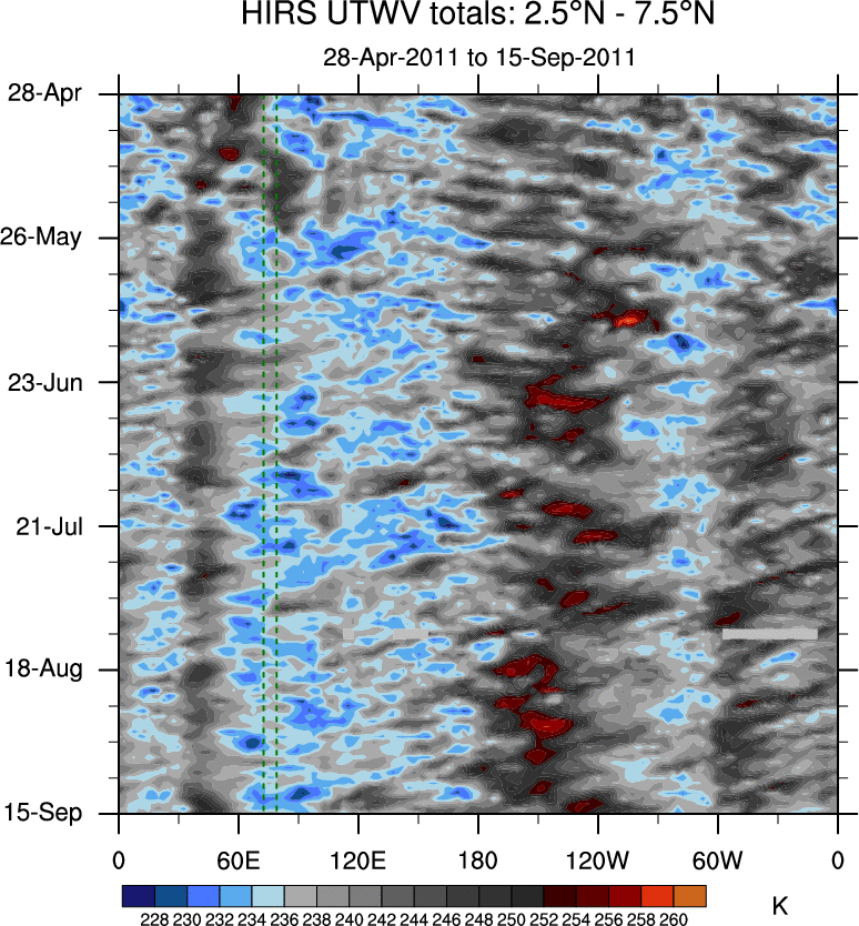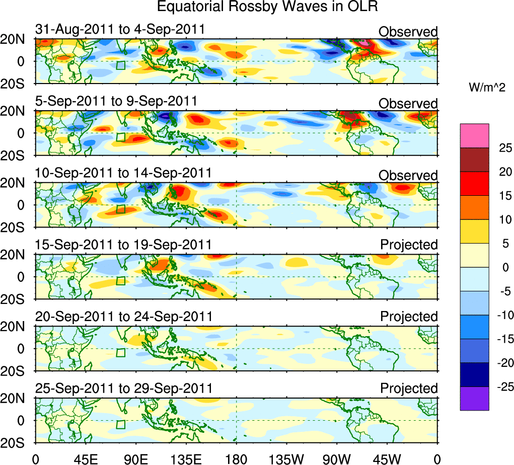 To identify tropical waves in near real-time, the OLR and UTWV data are filtered following Wheeler & Weickmann (2001 MWR). The daily anomalies are calculated using the first 3 harmonics of the seasonal cycle for 1979–2009. Missing values are then filled using linear interpolation in space and time. The most recent 365 days of anomalies are padded with 659 days of zeroes, and the result is filtered for each wave type.
