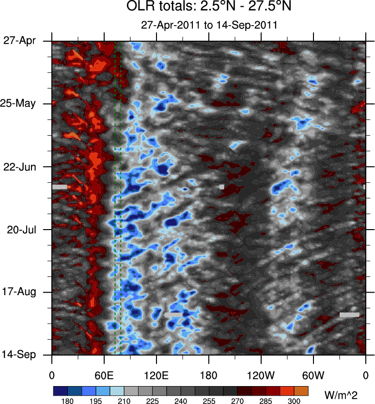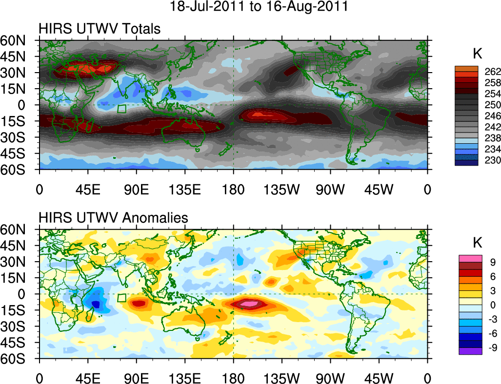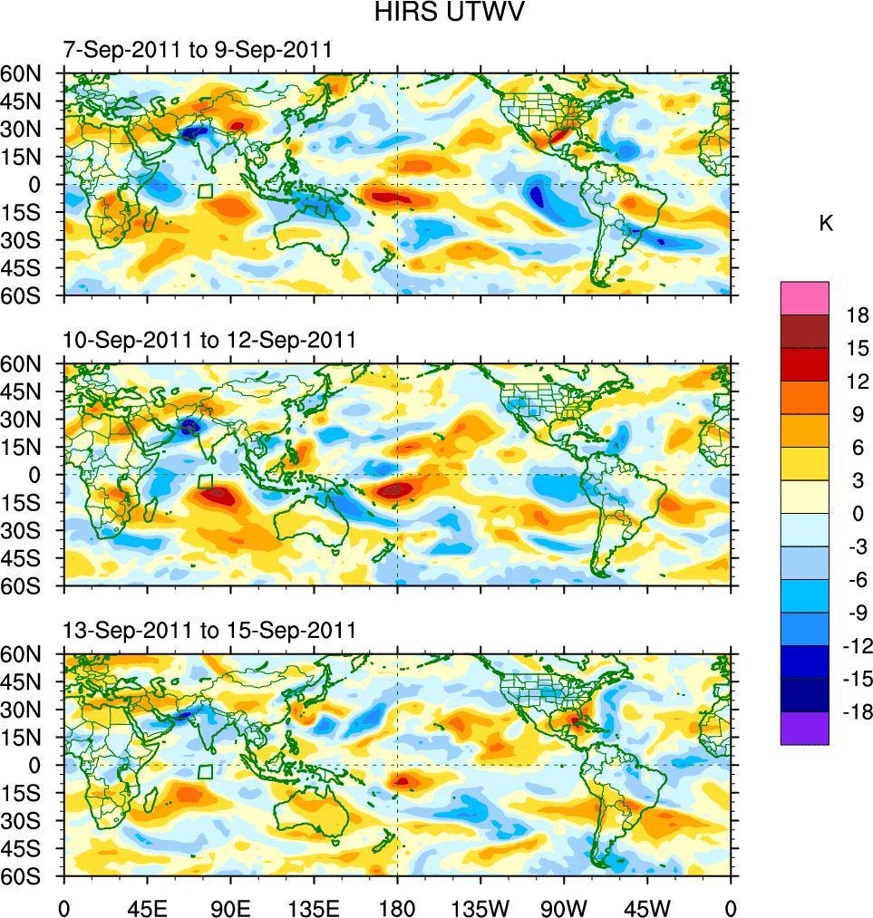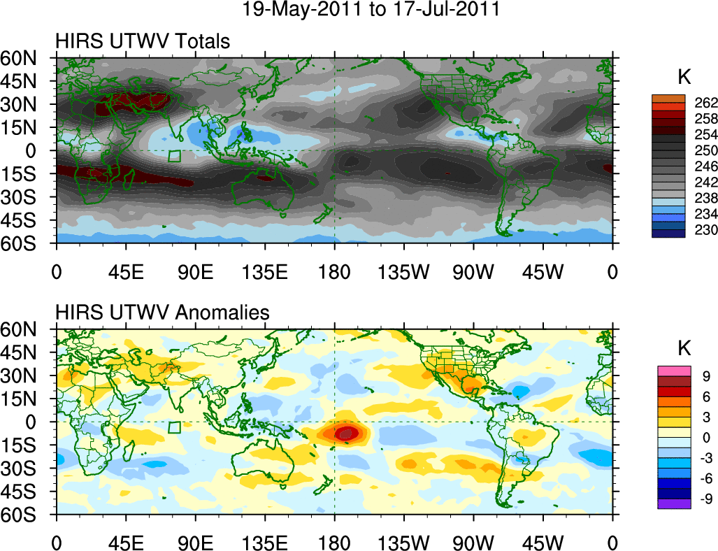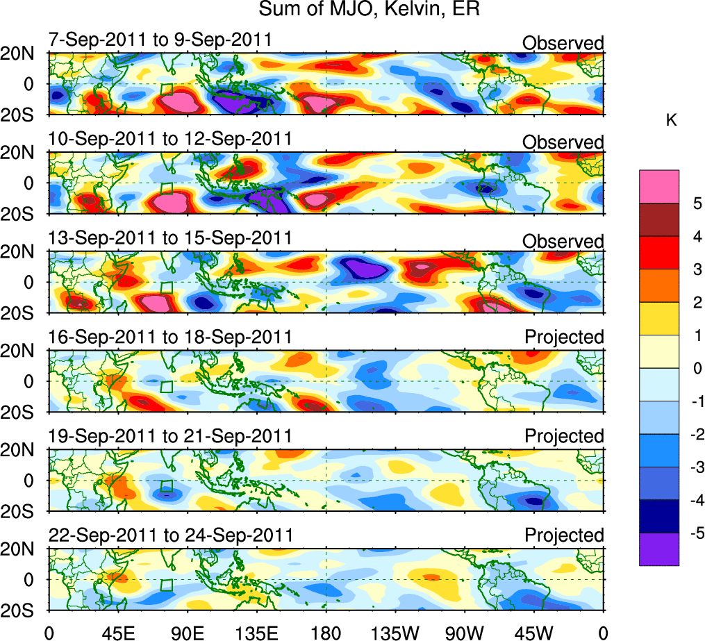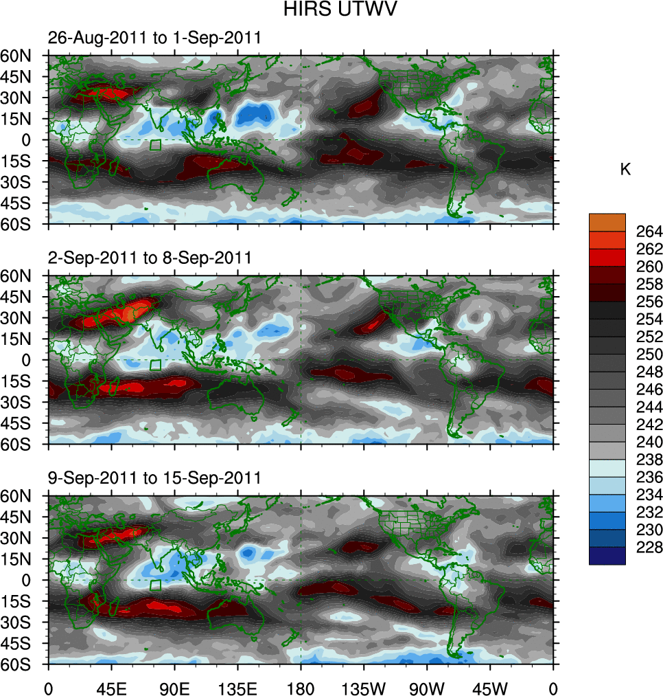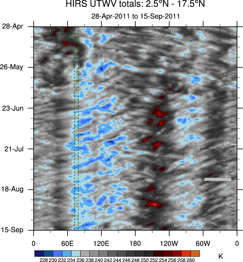 To identify tropical waves in near real-time, the OLR and UTWV data are filtered following Wheeler & Weickmann (2001 MWR). The daily anomalies are calculated using the first 3 harmonics of the seasonal cycle for 1979–2009. Missing values are then filled using linear interpolation in space and time. The most recent 365 days of anomalies are padded with 659 days of zeroes, and the result is filtered for each wave type.