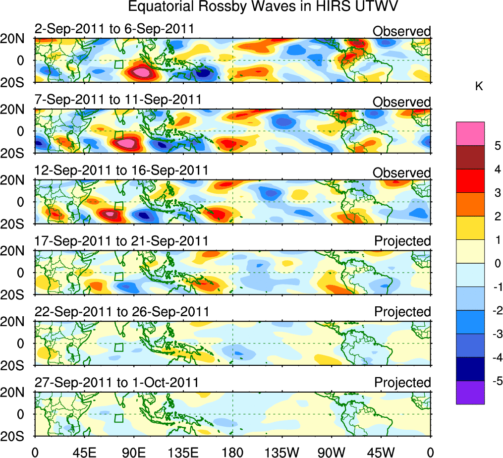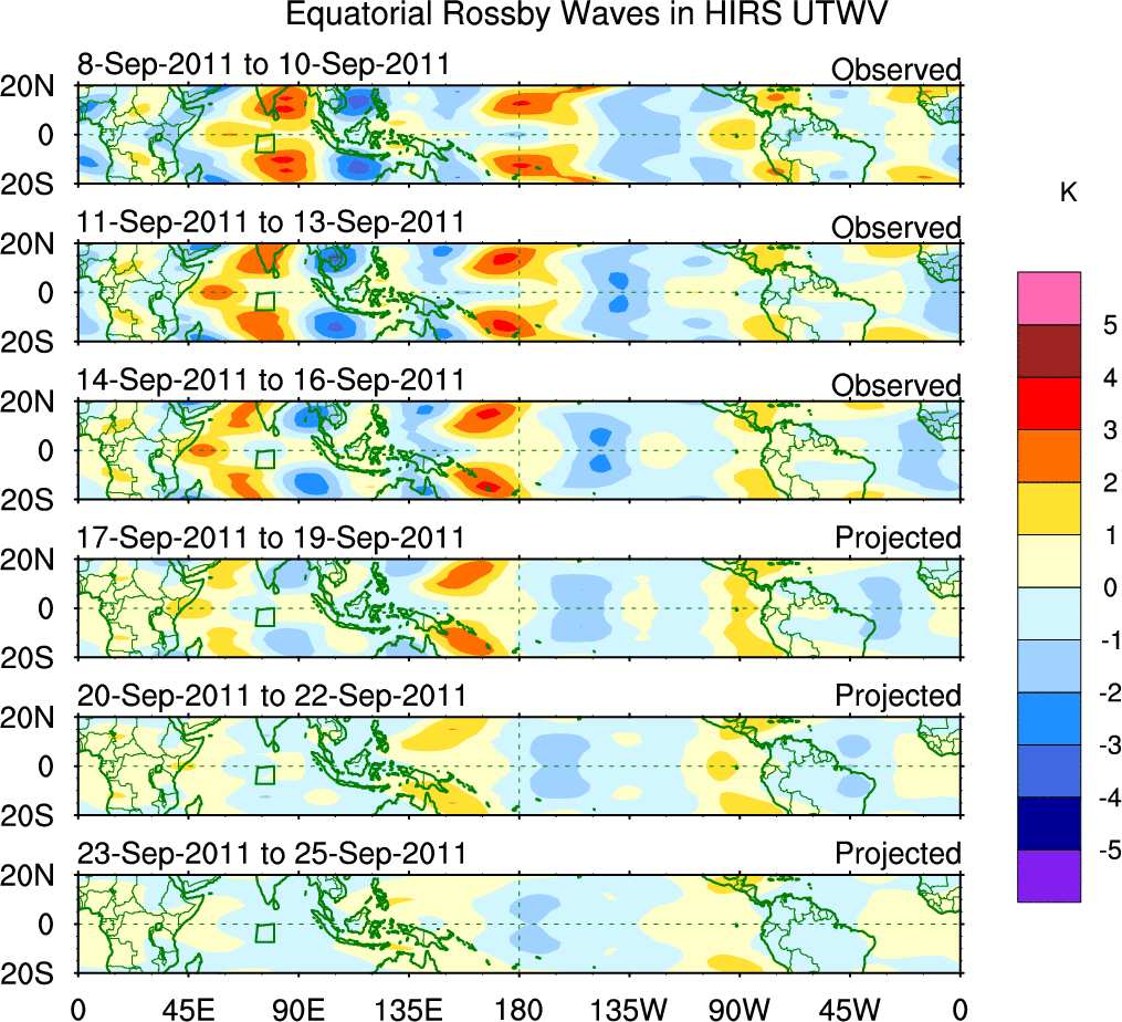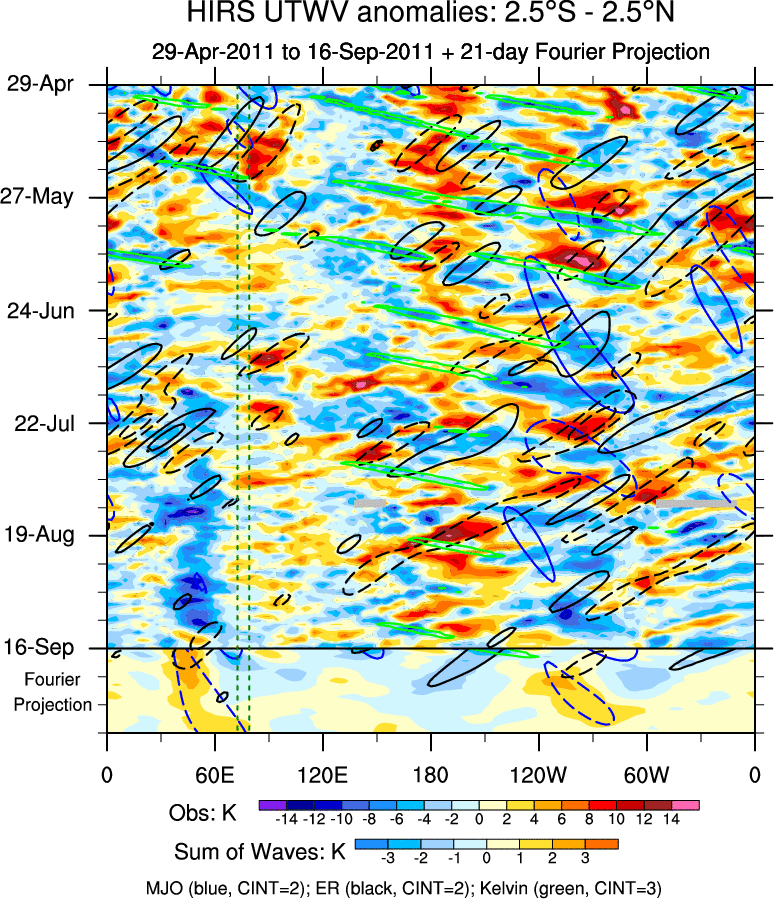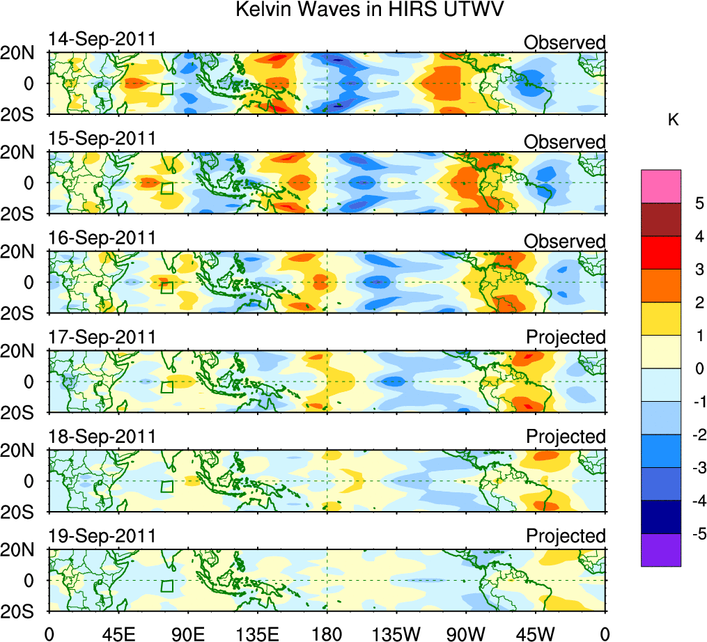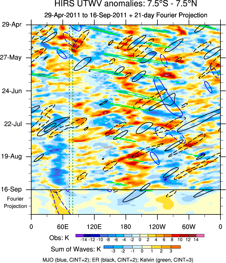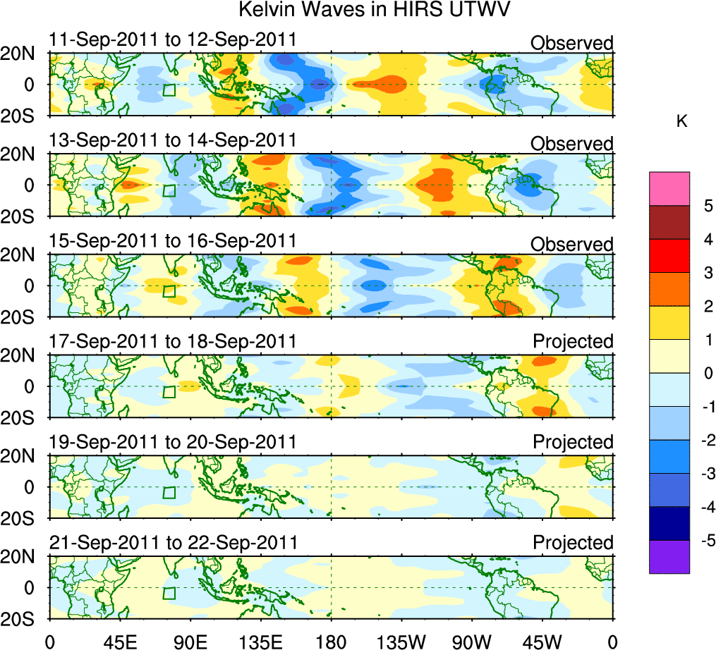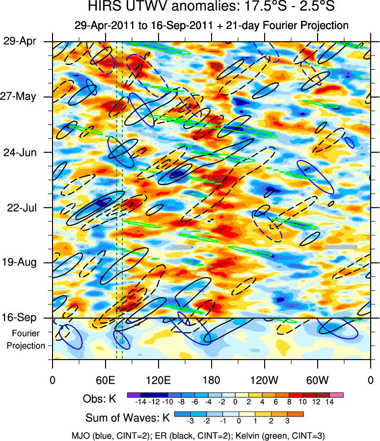 To identify tropical waves in near real-time, the OLR and UTWV data are filtered following Wheeler & Weickmann (2001 MWR). The daily anomalies are calculated using the first 3 harmonics of the seasonal cycle for 1979–2009. Missing values are then filled using linear interpolation in space and time. The most recent 365 days of anomalies are padded with 659 days of zeroes, and the result is filtered for each wave type.