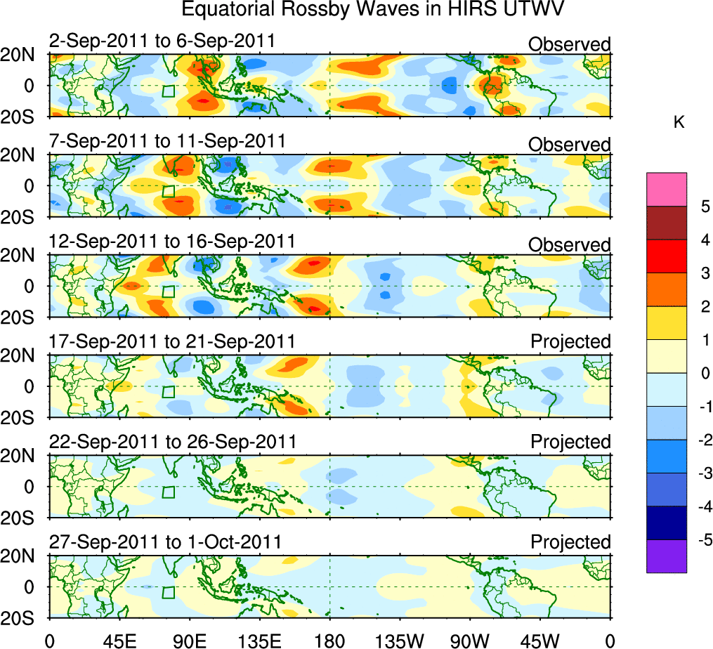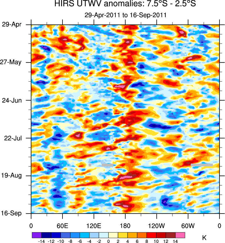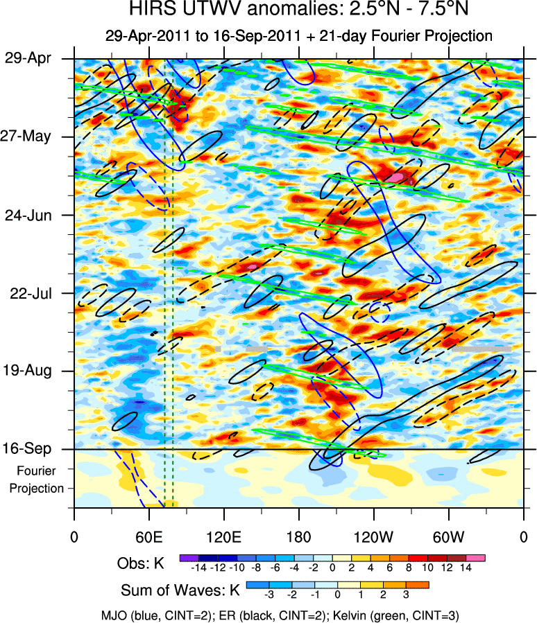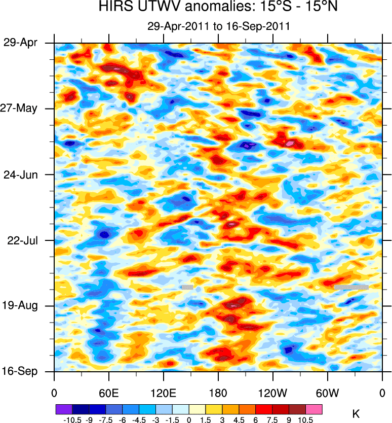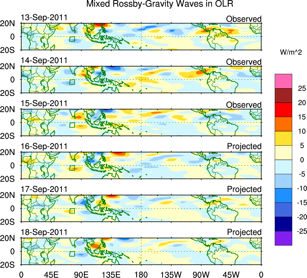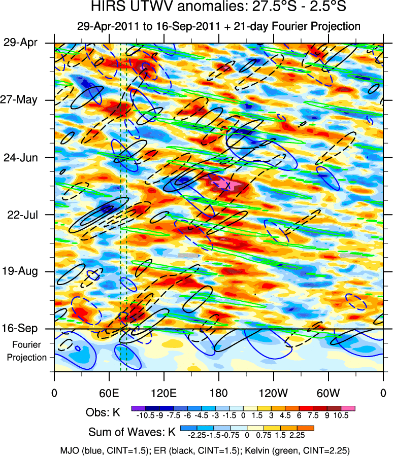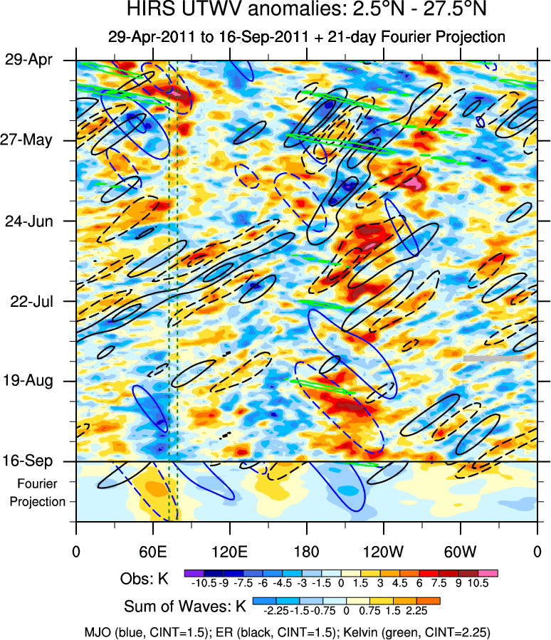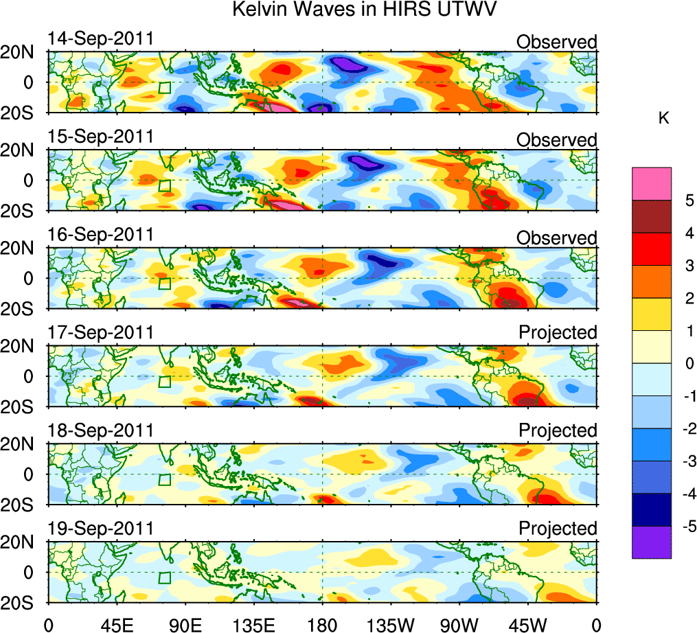 To identify tropical waves in near real-time, the OLR and UTWV data are filtered following Wheeler & Weickmann (2001 MWR). The daily anomalies are calculated using the first 3 harmonics of the seasonal cycle for 1979–2009. Missing values are then filled using linear interpolation in space and time. The most recent 365 days of anomalies are padded with 659 days of zeroes, and the result is filtered for each wave type.