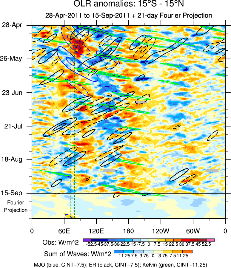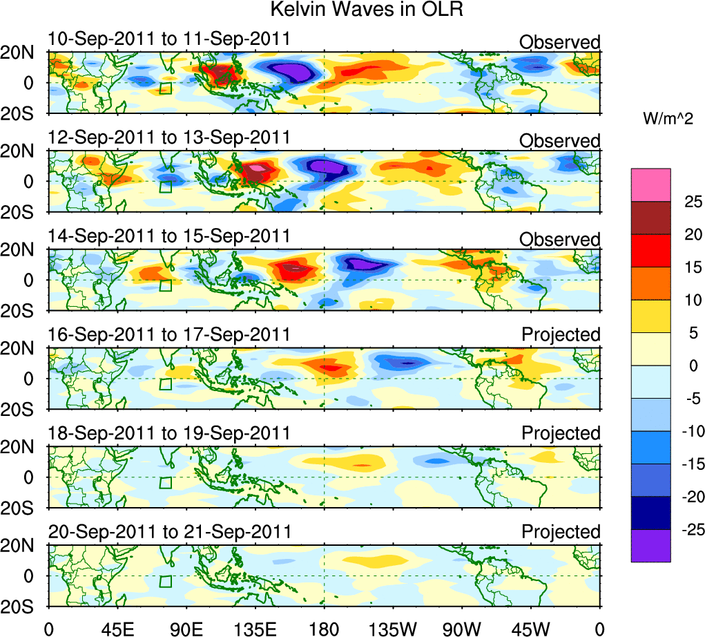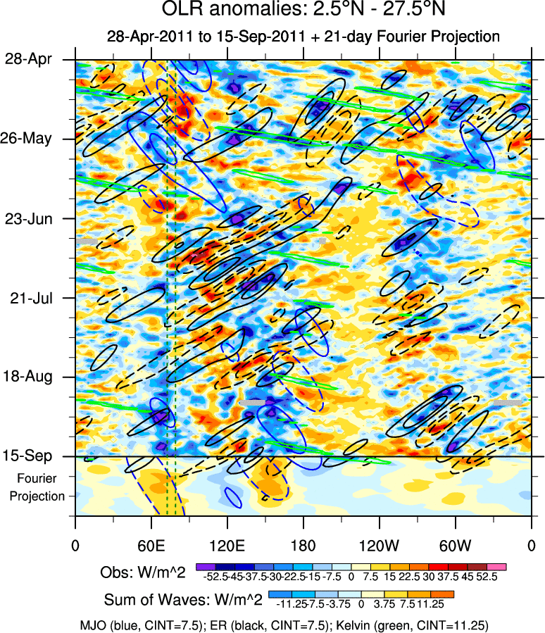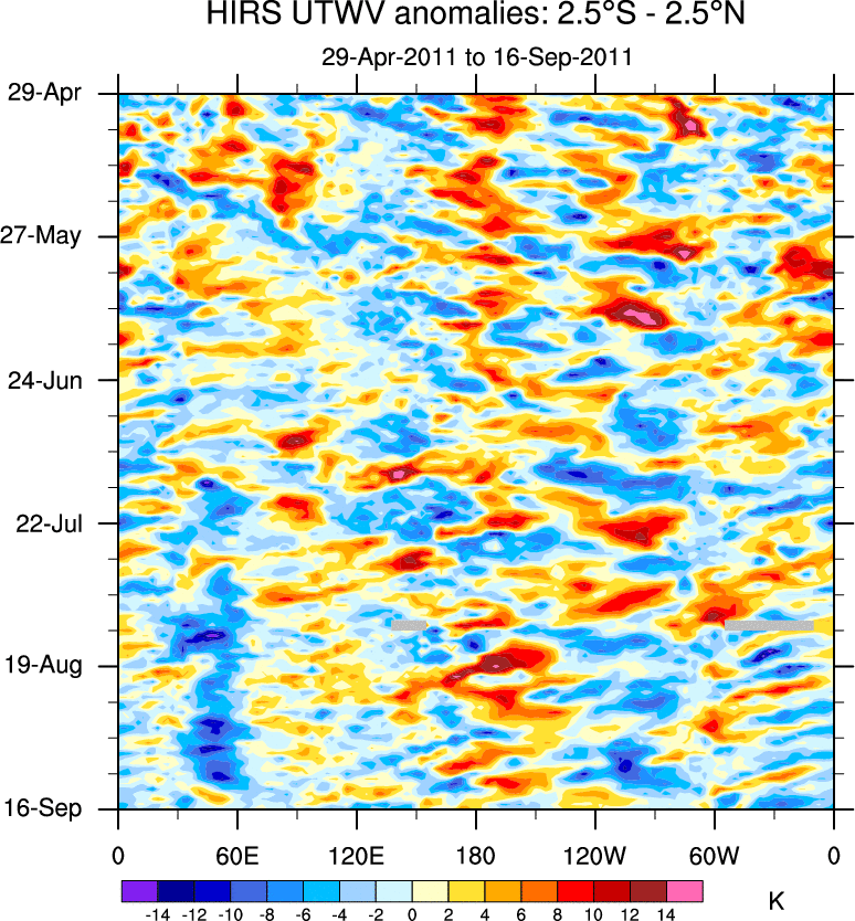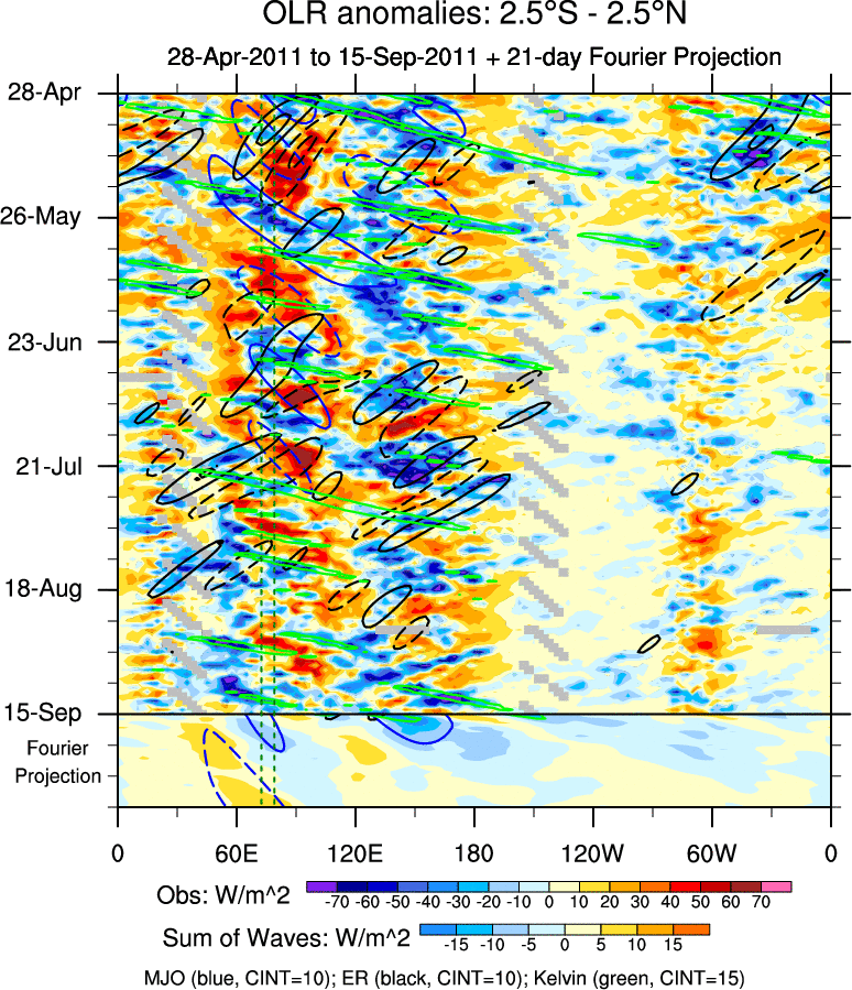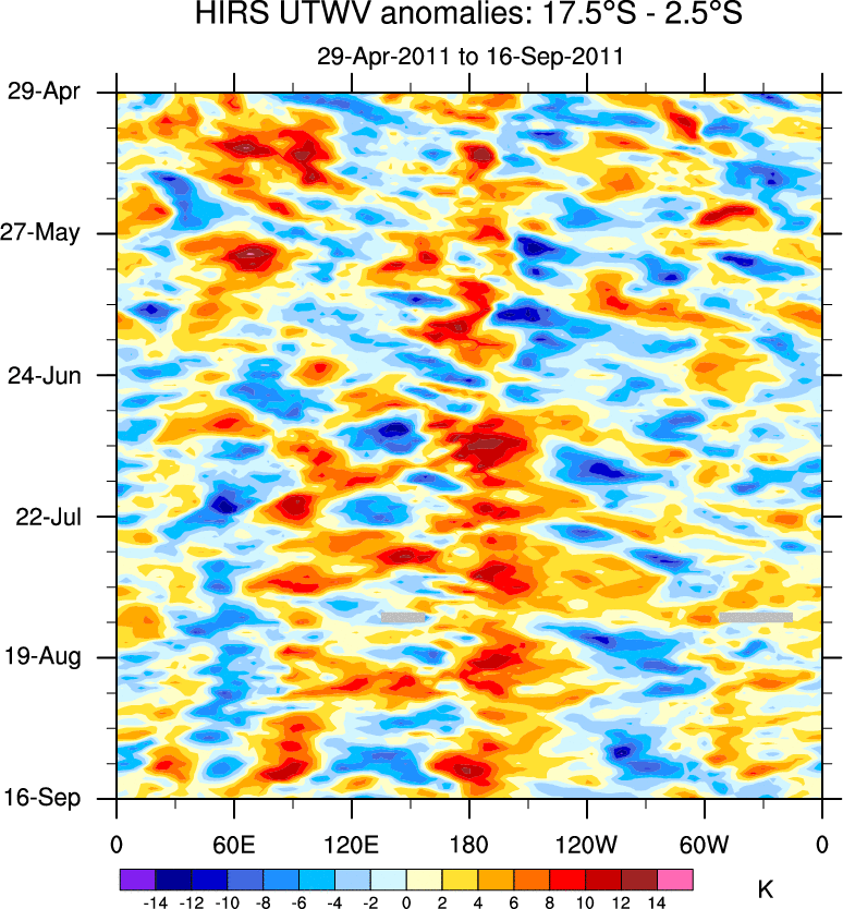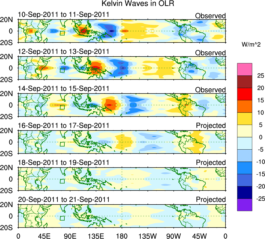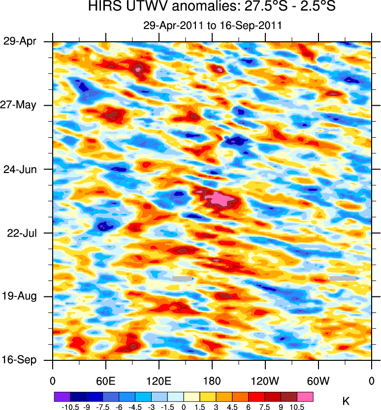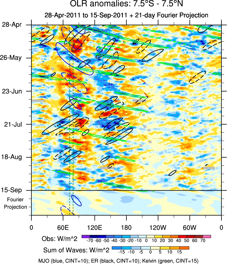 To identify tropical waves in near real-time, the OLR and UTWV data are filtered following Wheeler & Weickmann (2001 MWR). The daily anomalies are calculated using the first 3 harmonics of the seasonal cycle for 1979–2009. Missing values are then filled using linear interpolation in space and time. The most recent 365 days of anomalies are padded with 659 days of zeroes, and the result is filtered for each wave type.