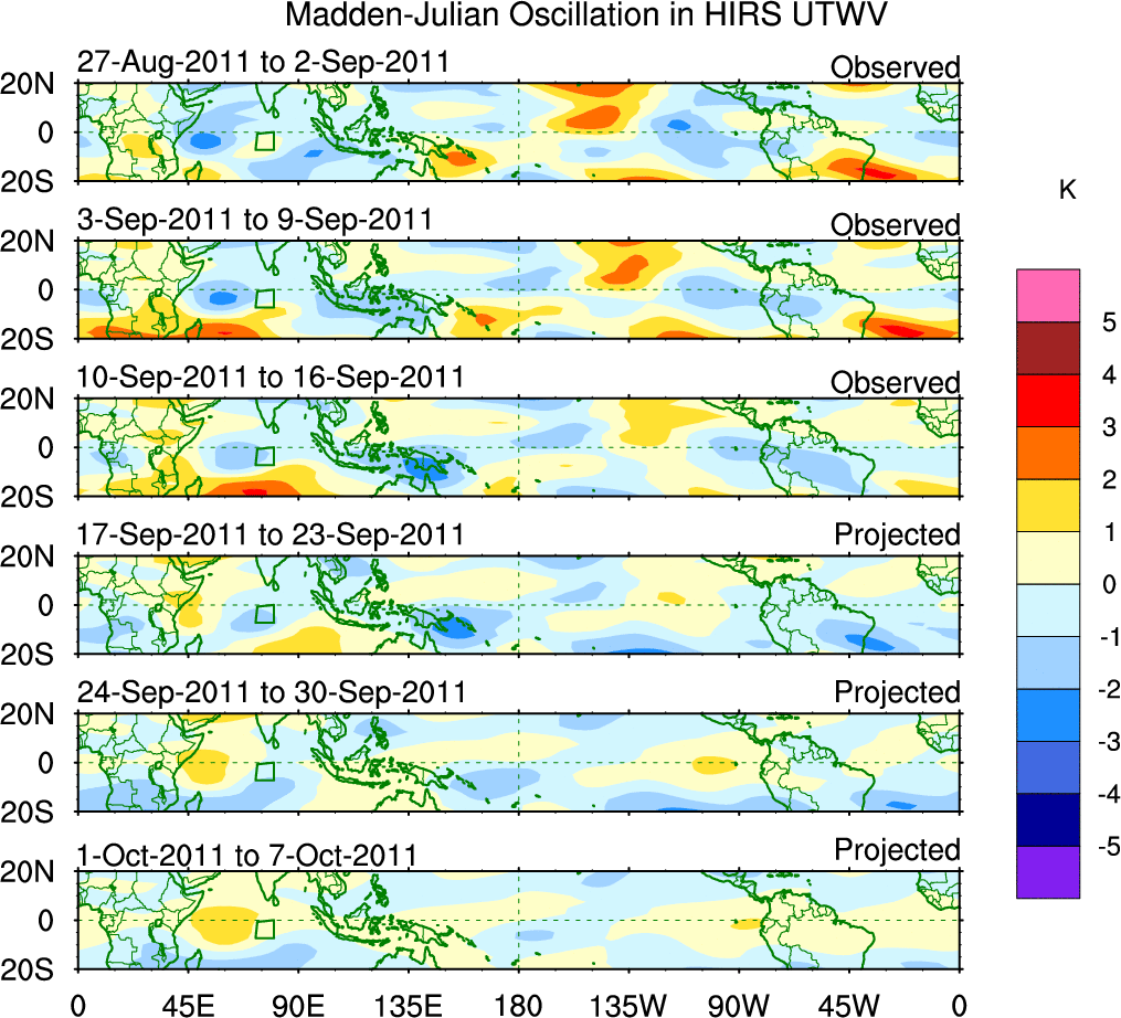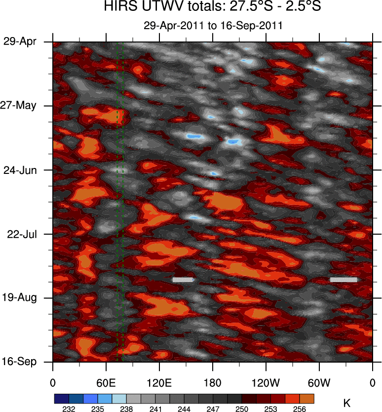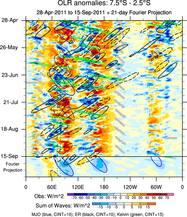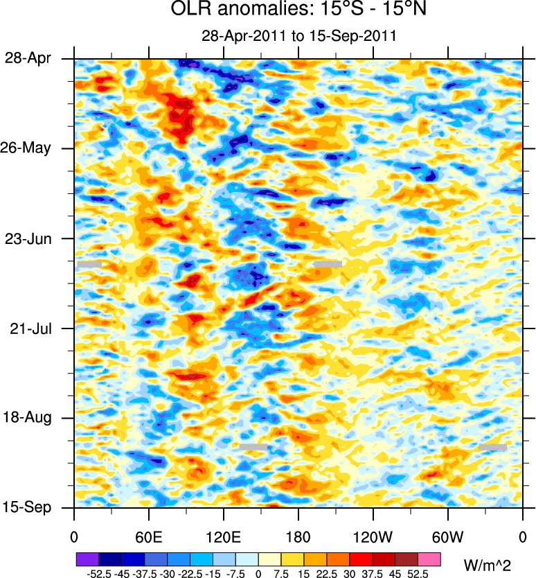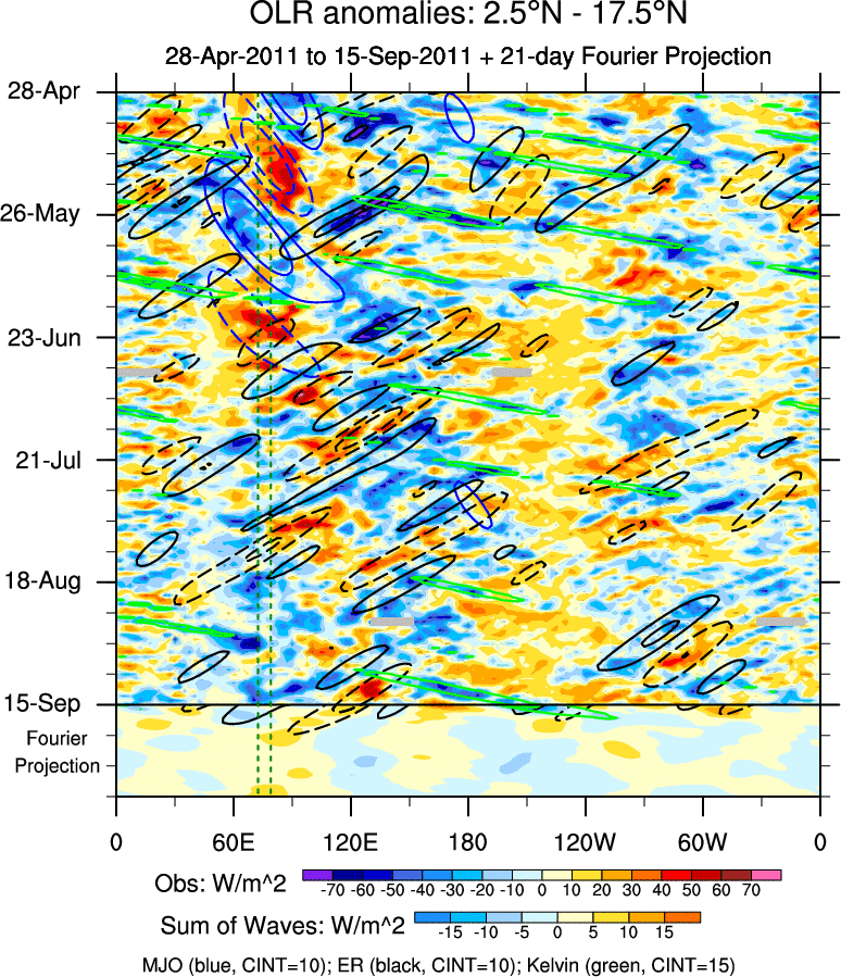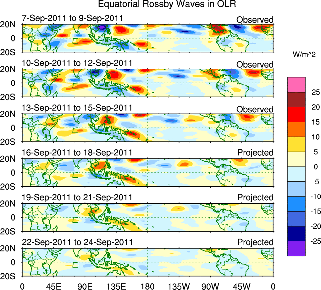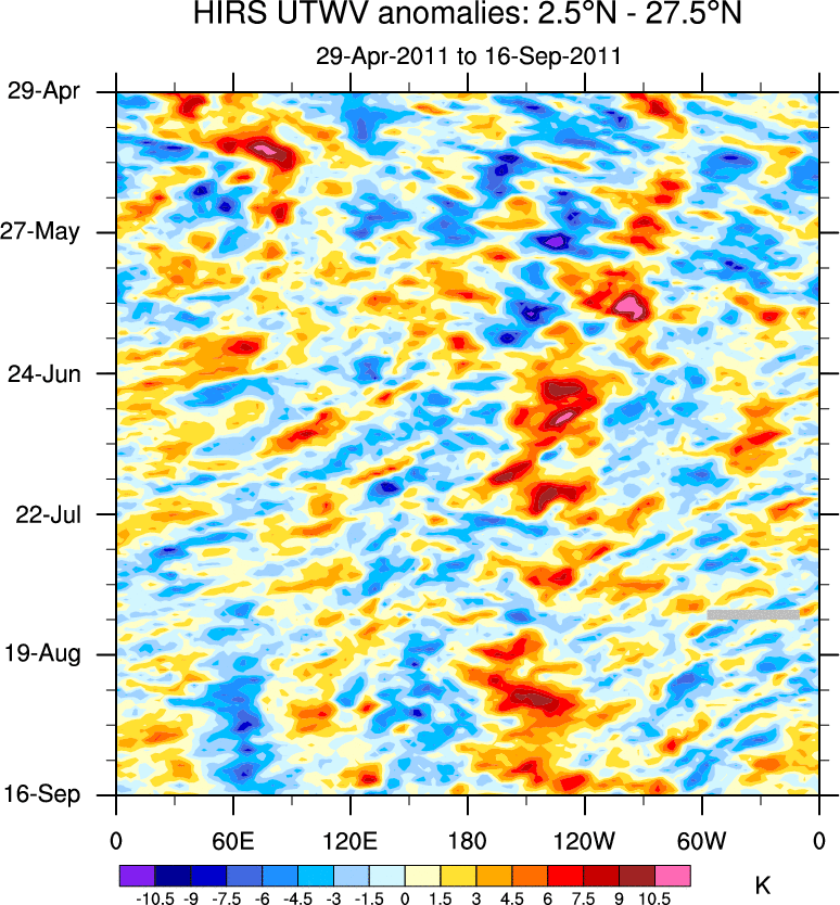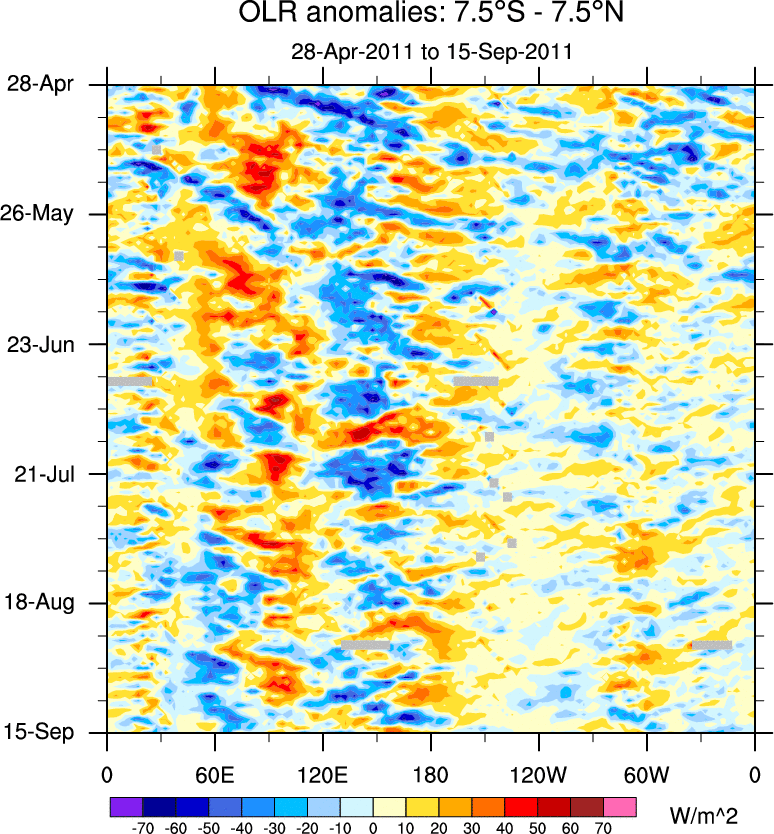 To identify tropical waves in near real-time, the OLR and UTWV data are filtered following Wheeler & Weickmann (2001 MWR). The daily anomalies are calculated using the first 3 harmonics of the seasonal cycle for 1979–2009. Missing values are then filled using linear interpolation in space and time. The most recent 365 days of anomalies are padded with 659 days of zeroes, and the result is filtered for each wave type.