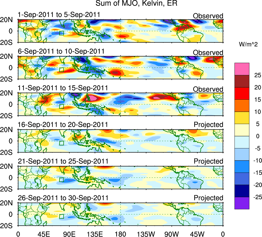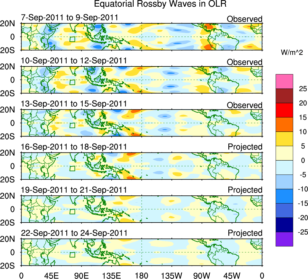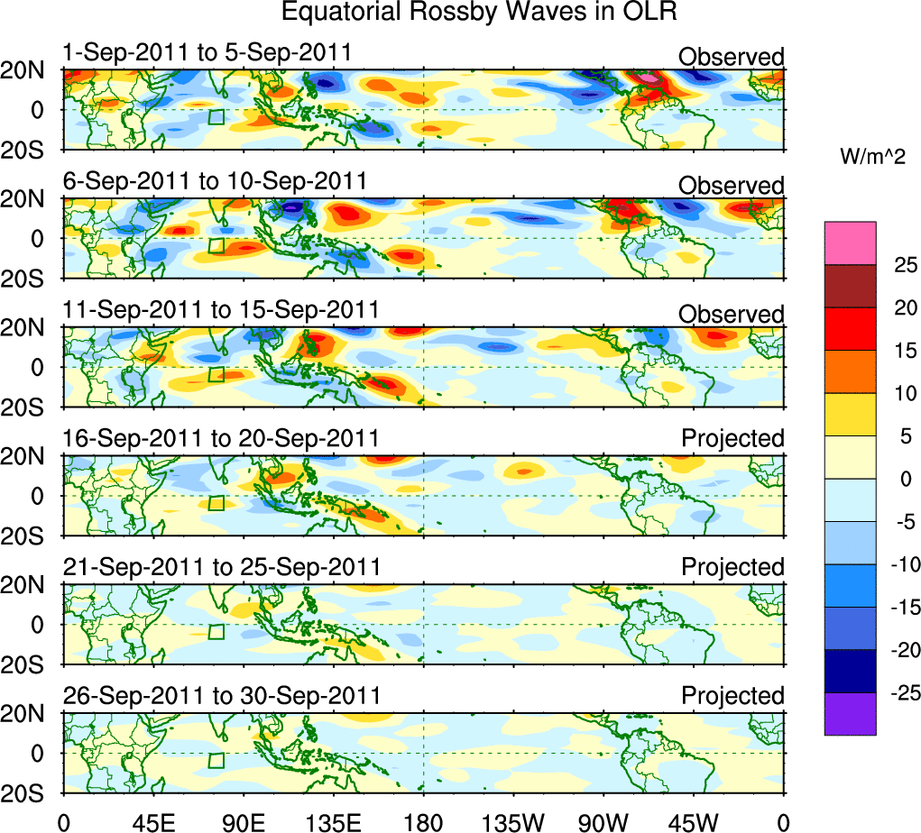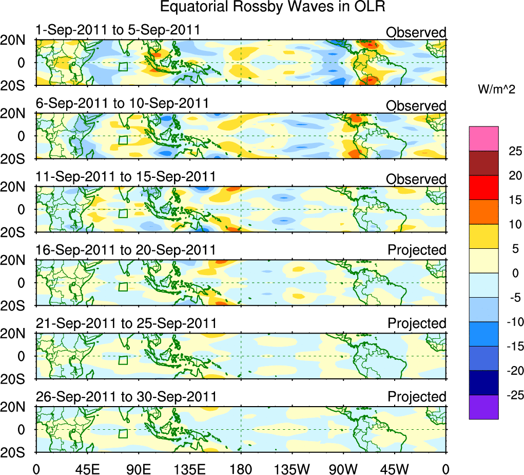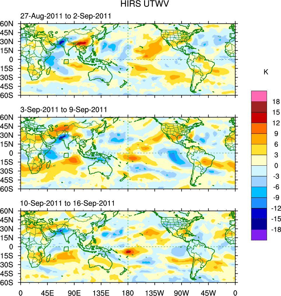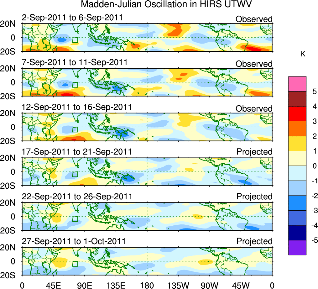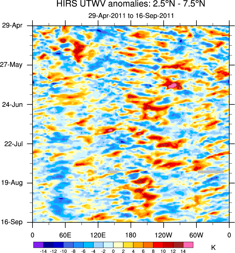 To identify tropical waves in near real-time, the OLR and UTWV data are filtered following Wheeler & Weickmann (2001 MWR). The daily anomalies are calculated using the first 3 harmonics of the seasonal cycle for 1979–2009. Missing values are then filled using linear interpolation in space and time. The most recent 365 days of anomalies are padded with 659 days of zeroes, and the result is filtered for each wave type.