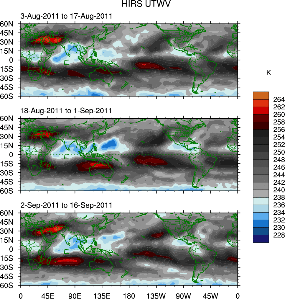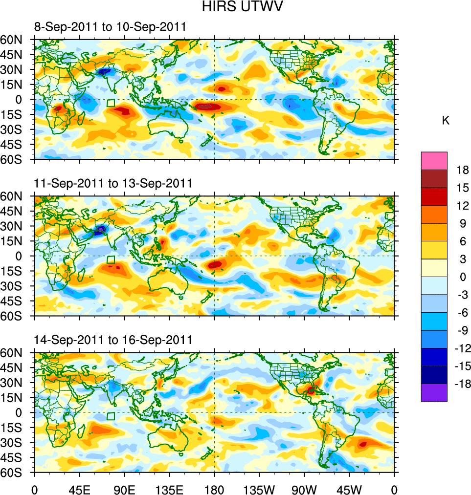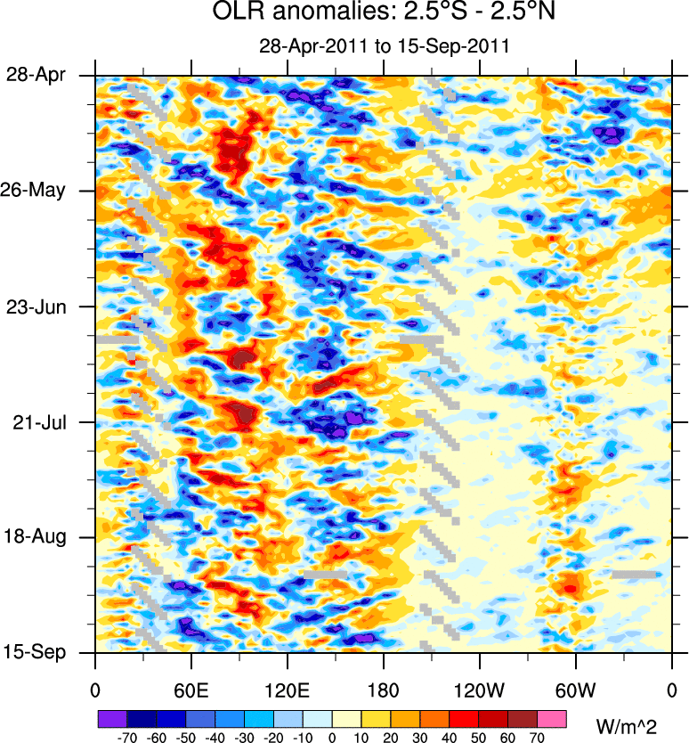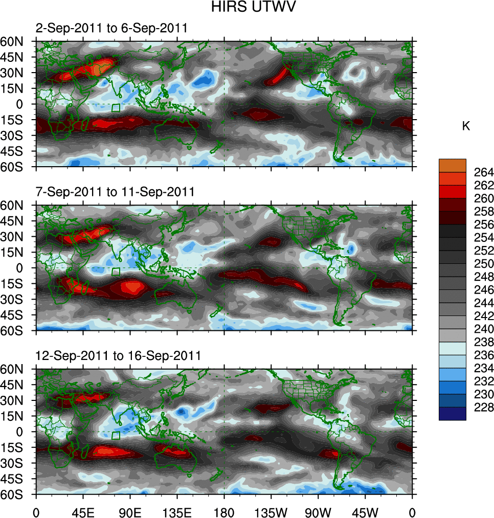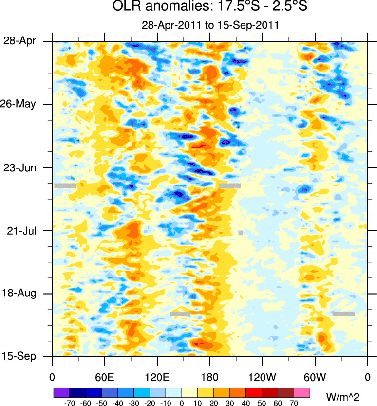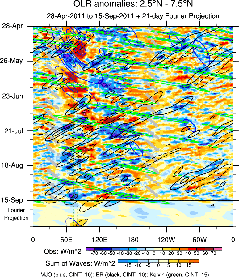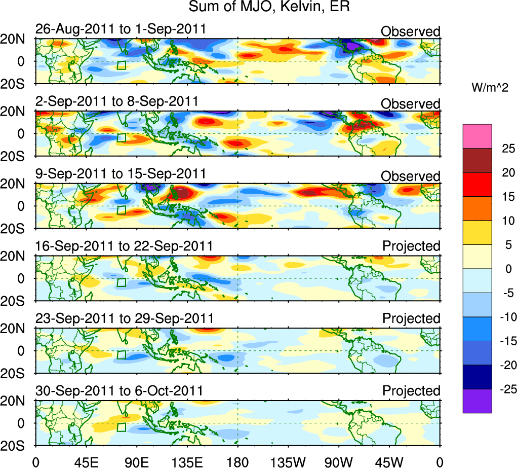 To identify tropical waves in near real-time, the OLR and UTWV data are filtered following Wheeler & Weickmann (2001 MWR). The daily anomalies are calculated using the first 3 harmonics of the seasonal cycle for 1979–2009. Missing values are then filled using linear interpolation in space and time. The most recent 365 days of anomalies are padded with 659 days of zeroes, and the result is filtered for each wave type.