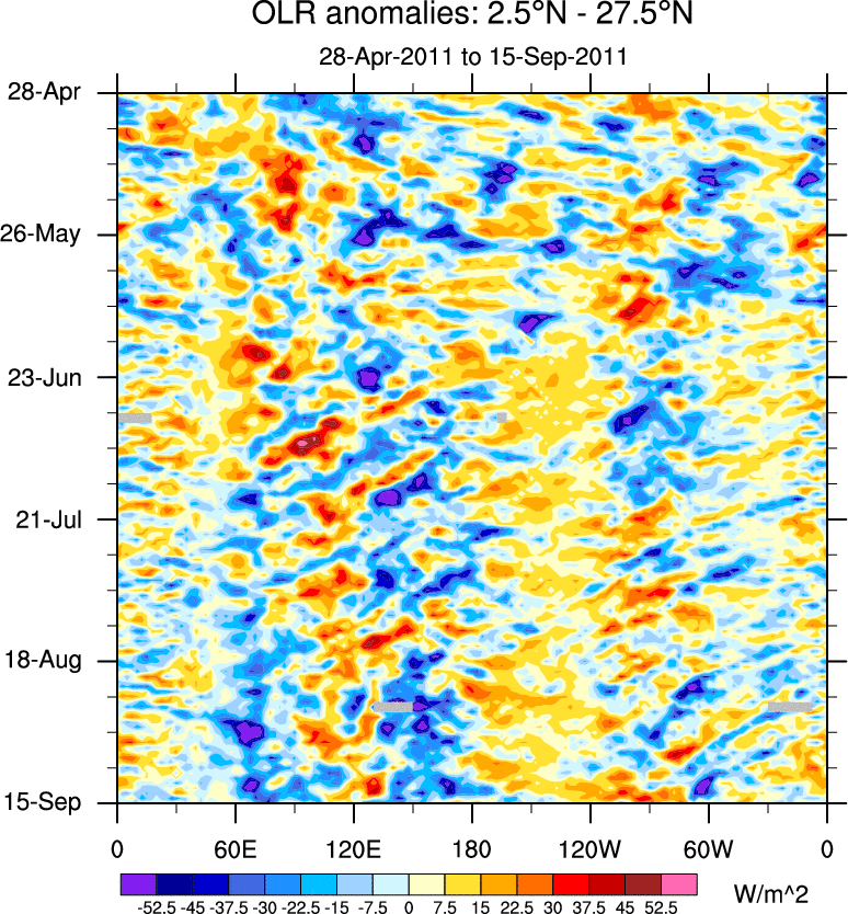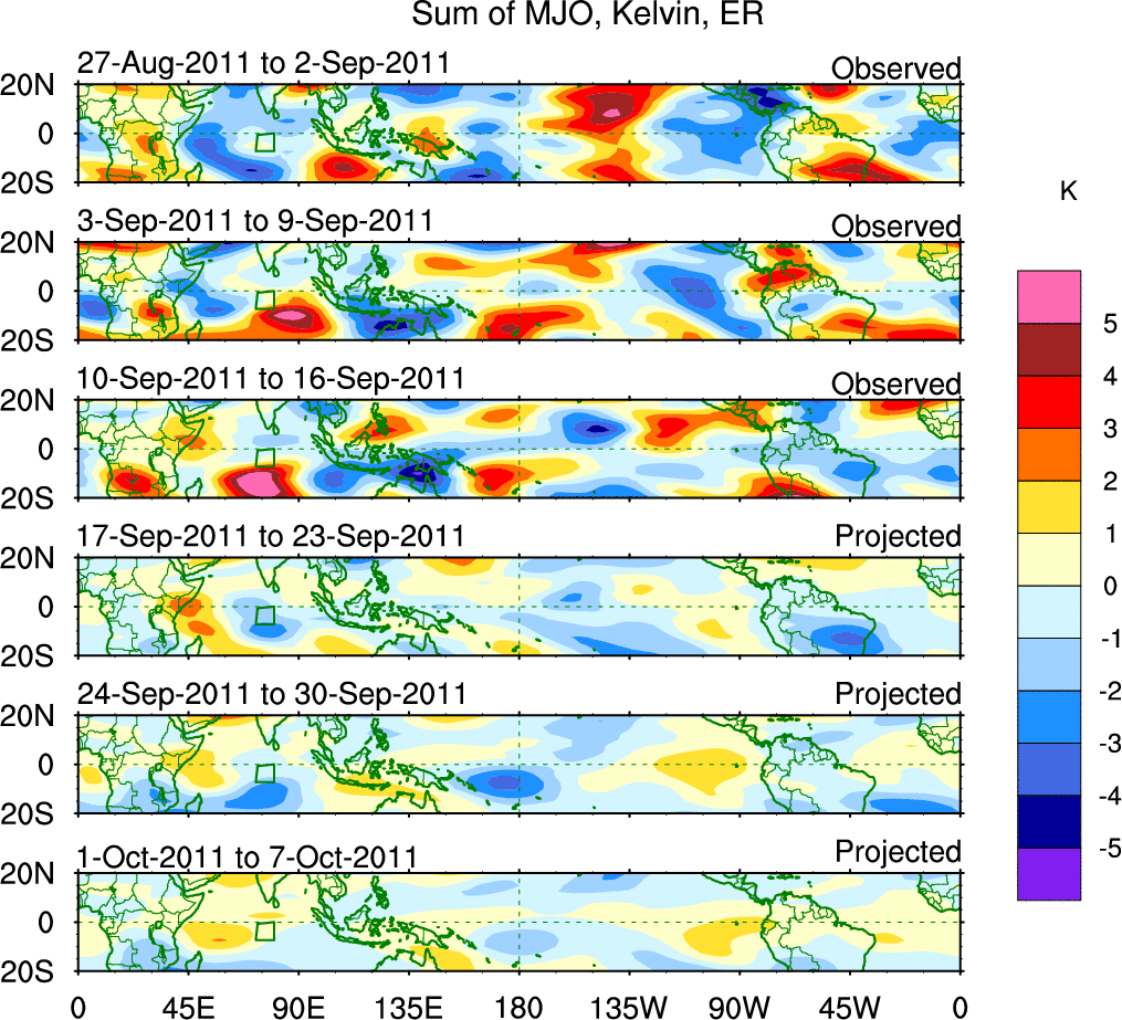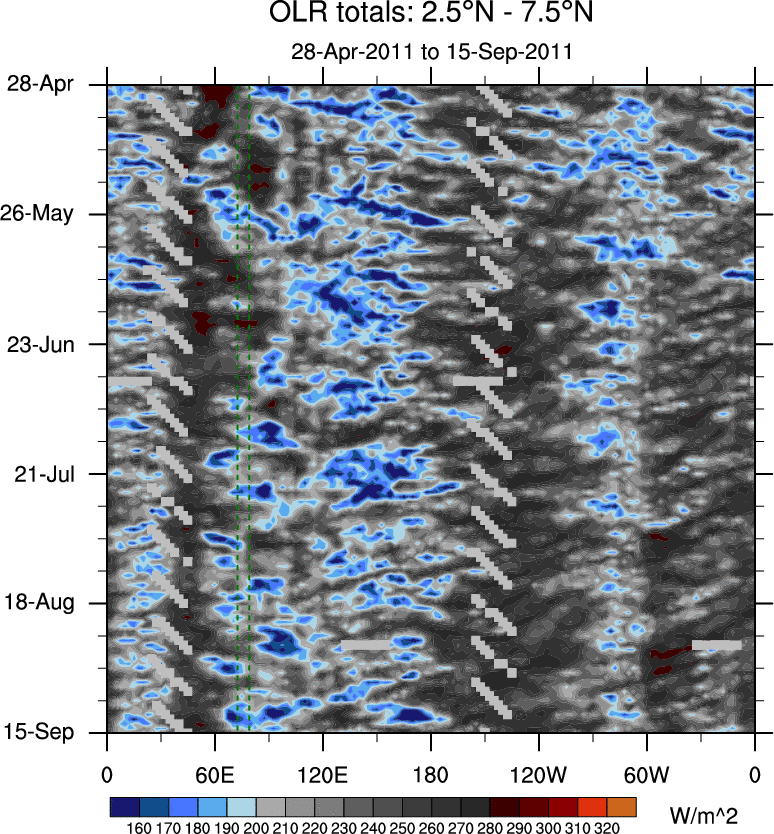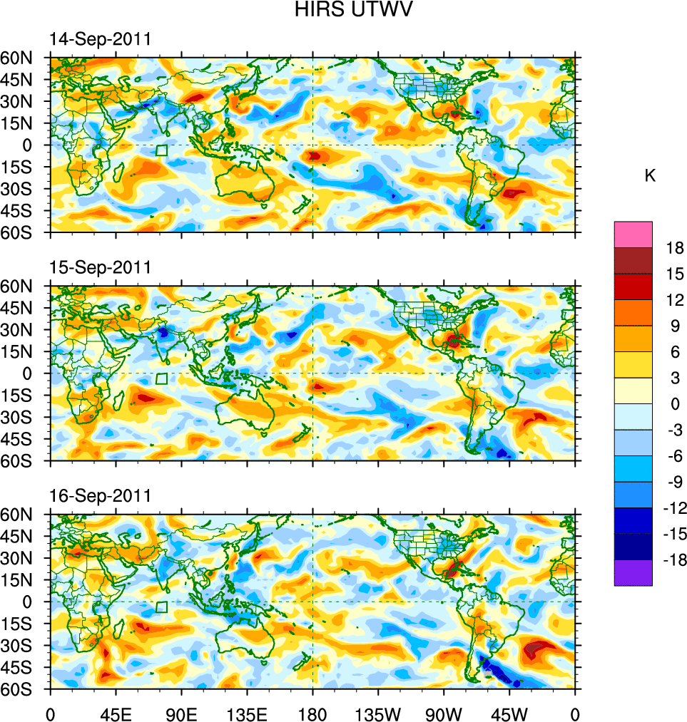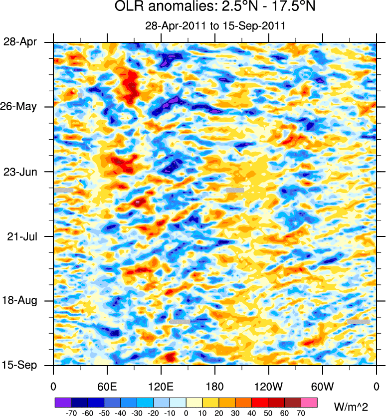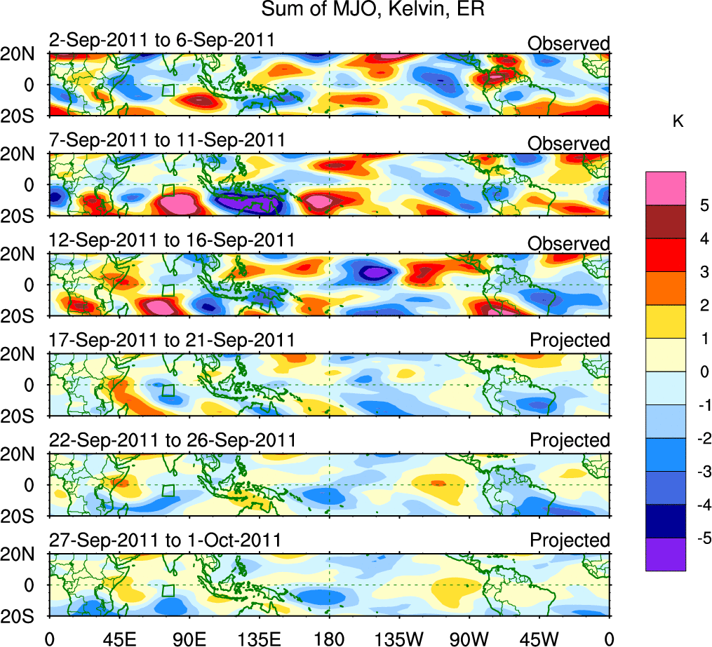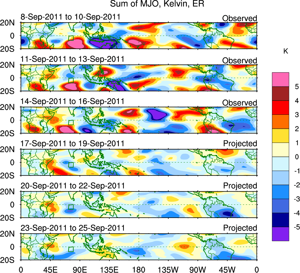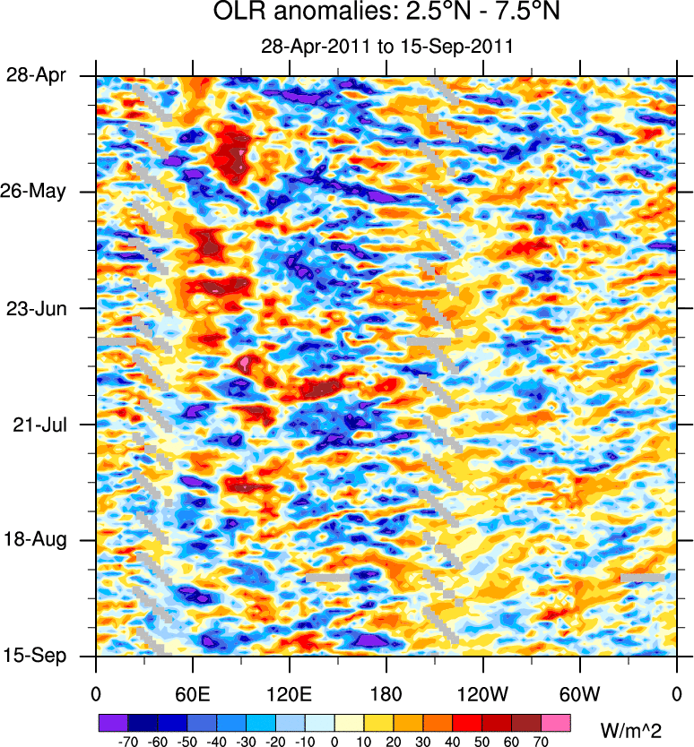 To identify tropical waves in near real-time, the OLR and UTWV data are filtered following Wheeler & Weickmann (2001 MWR). The daily anomalies are calculated using the first 3 harmonics of the seasonal cycle for 1979–2009. Missing values are then filled using linear interpolation in space and time. The most recent 365 days of anomalies are padded with 659 days of zeroes, and the result is filtered for each wave type.