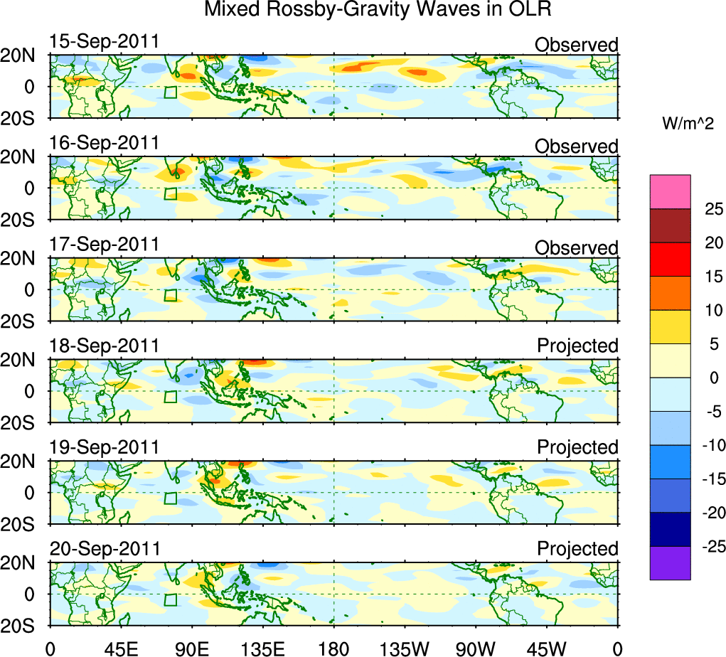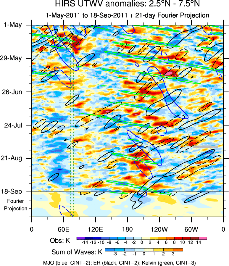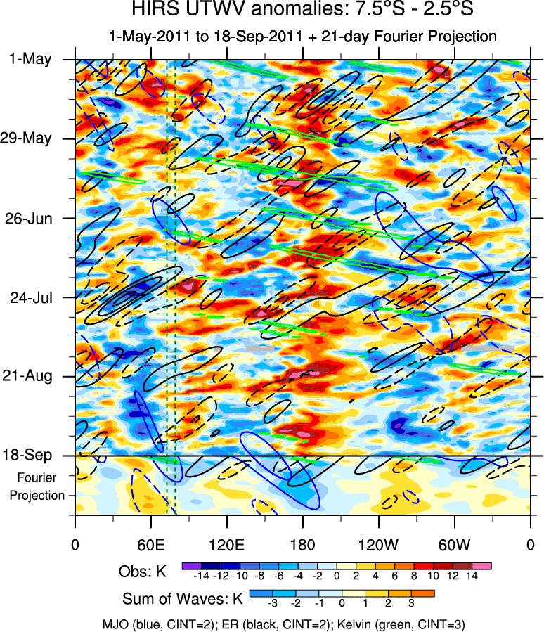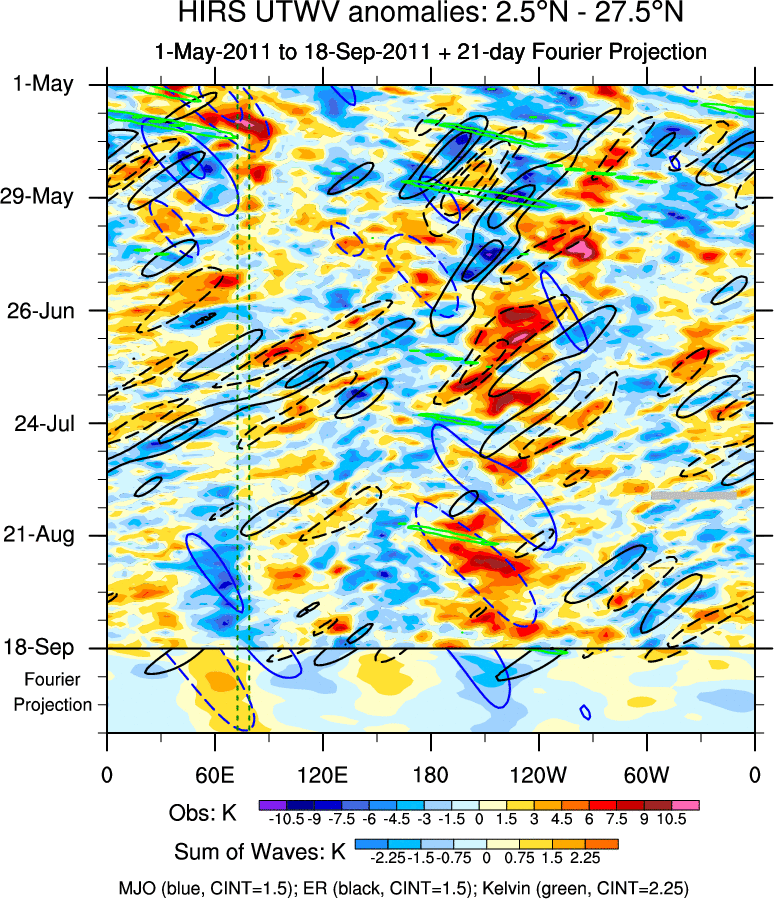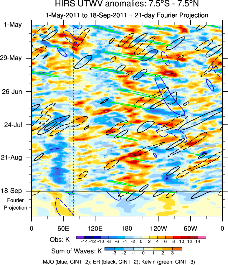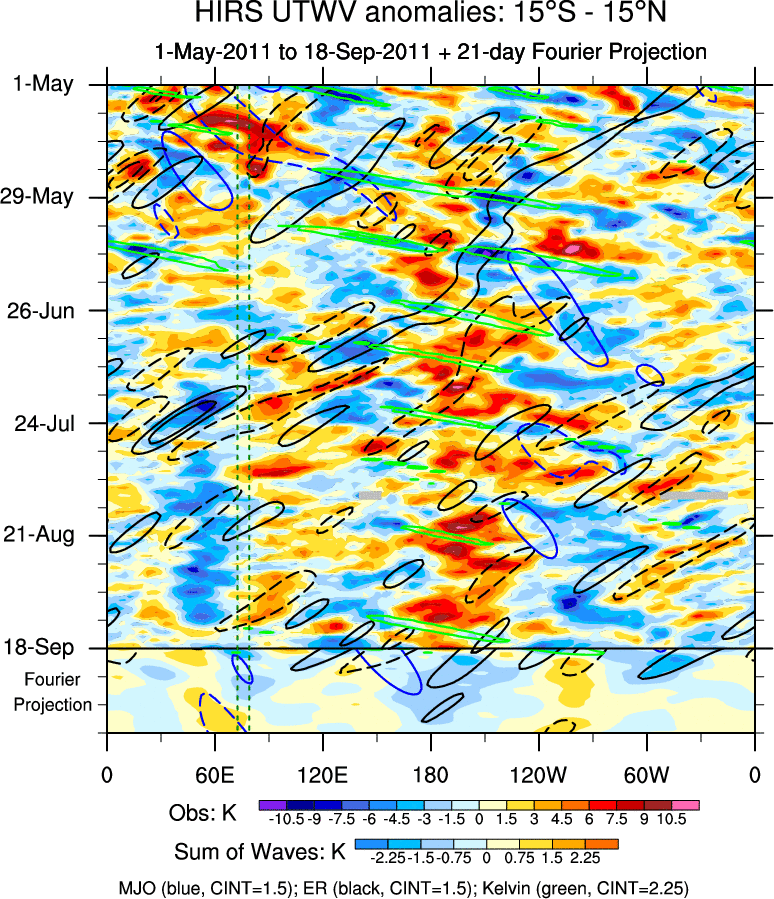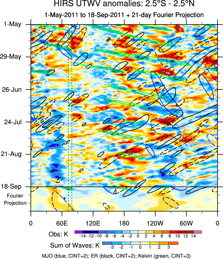 To identify tropical waves in near real-time, the OLR and UTWV data are filtered following Wheeler & Weickmann (2001 MWR). The daily anomalies are calculated using the first 3 harmonics of the seasonal cycle for 1979–2009. Missing values are then filled using linear interpolation in space and time. The most recent 365 days of anomalies are padded with 659 days of zeroes, and the result is filtered for each wave type.